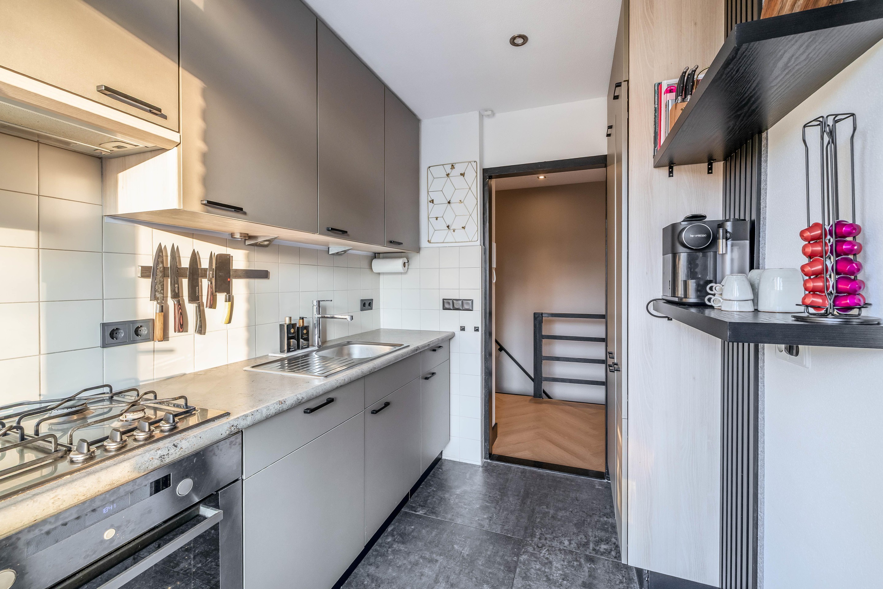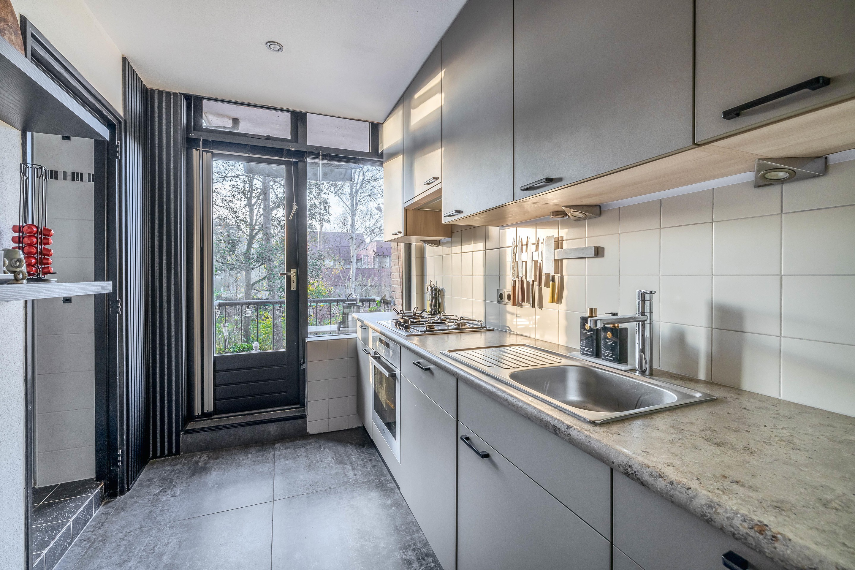 De keuken is geüpdatet en beschikt over een koffiecorner, een antracietgrijze tegelvloer en diverse inbouwapparatuur (gaskookplaat, oven, afzuigkap, koelkast/vriezer en vaatwasser). Vanuit de keuken stap je het balkon op het westen op, met vrij zicht op de gezamenlijke tuin en het achterliggende park. Aangrenzend vind je de keurige badkamer met inloopdouche, nieuw wastafelmeubel en daglicht via het klepraam.