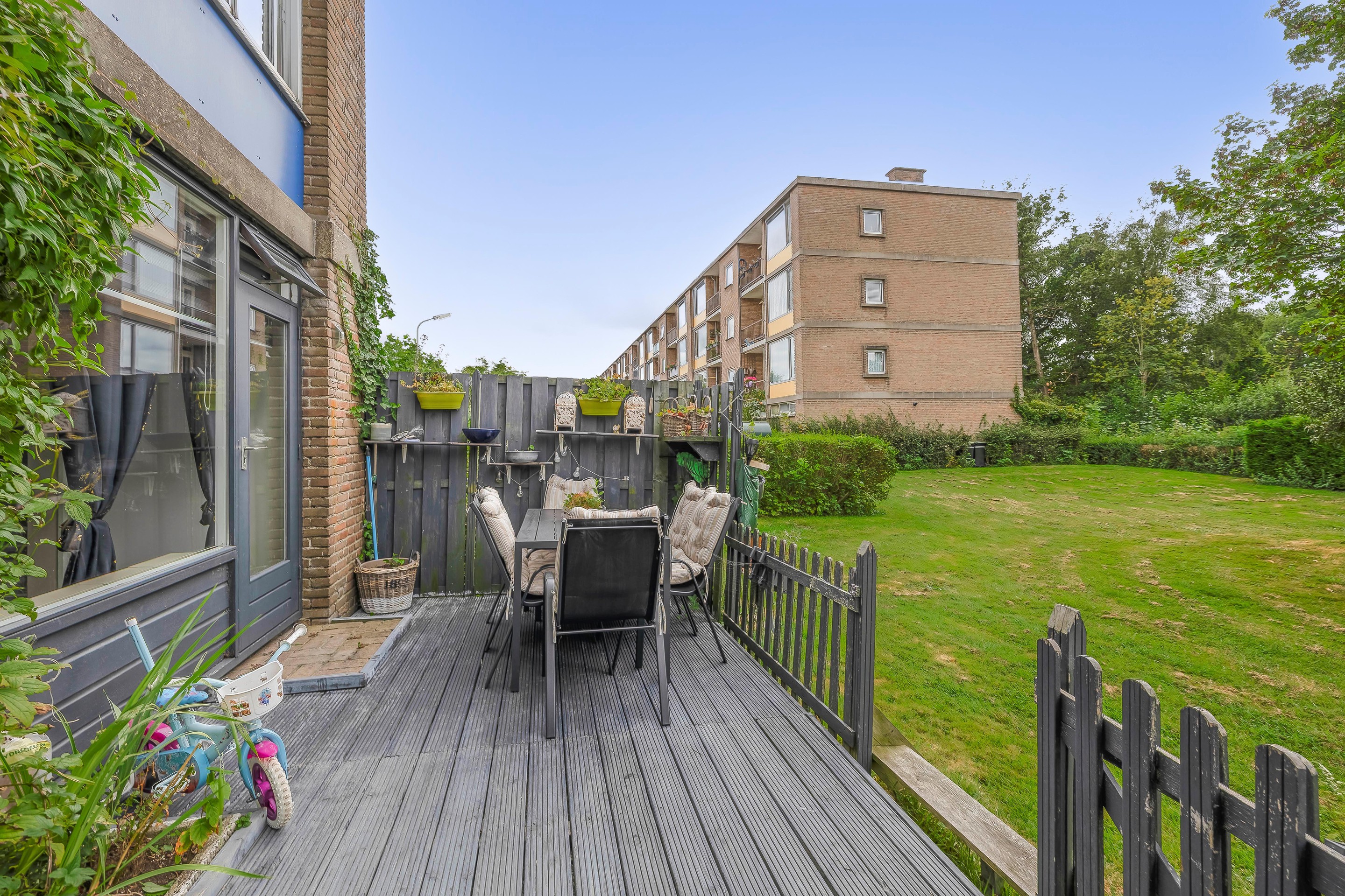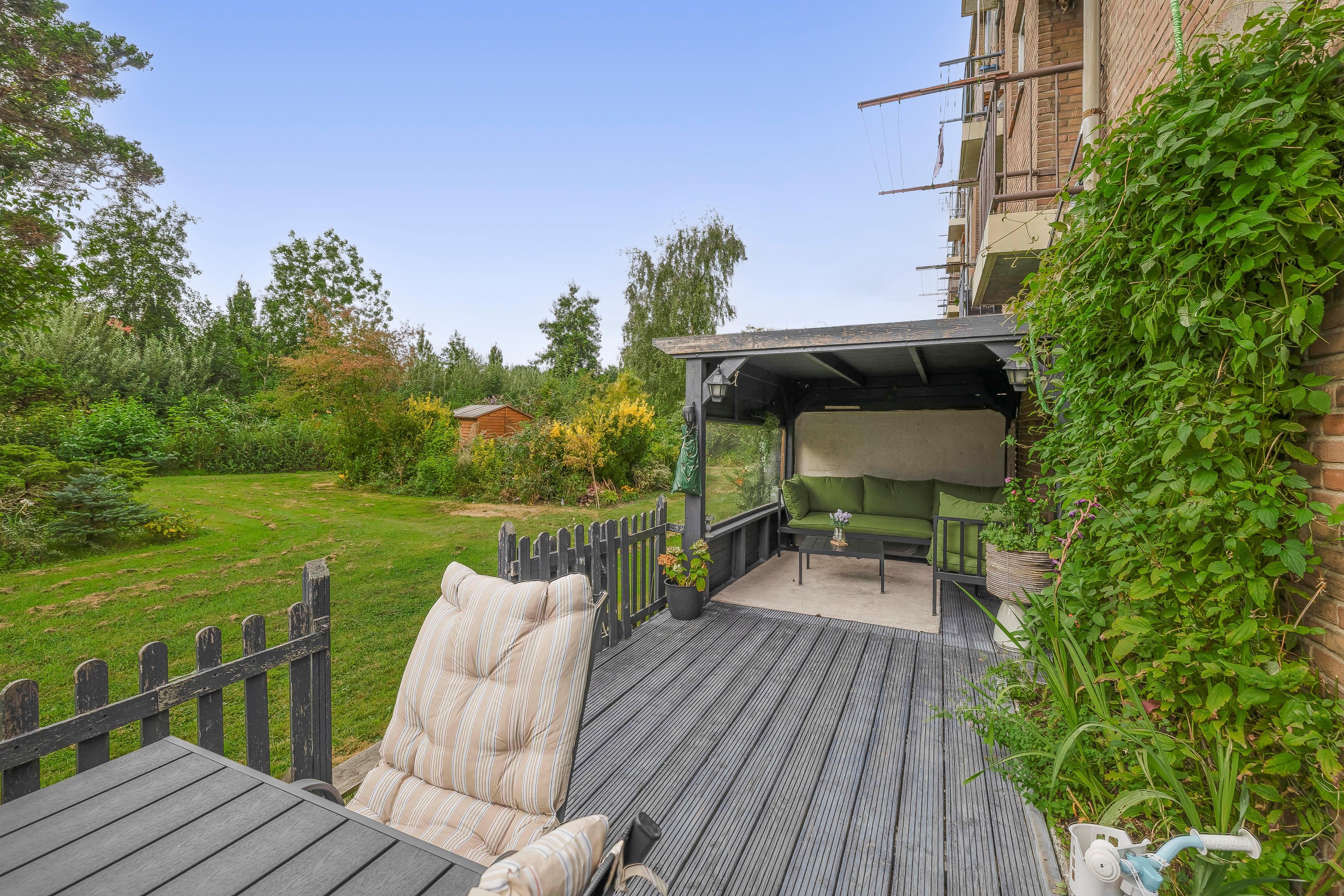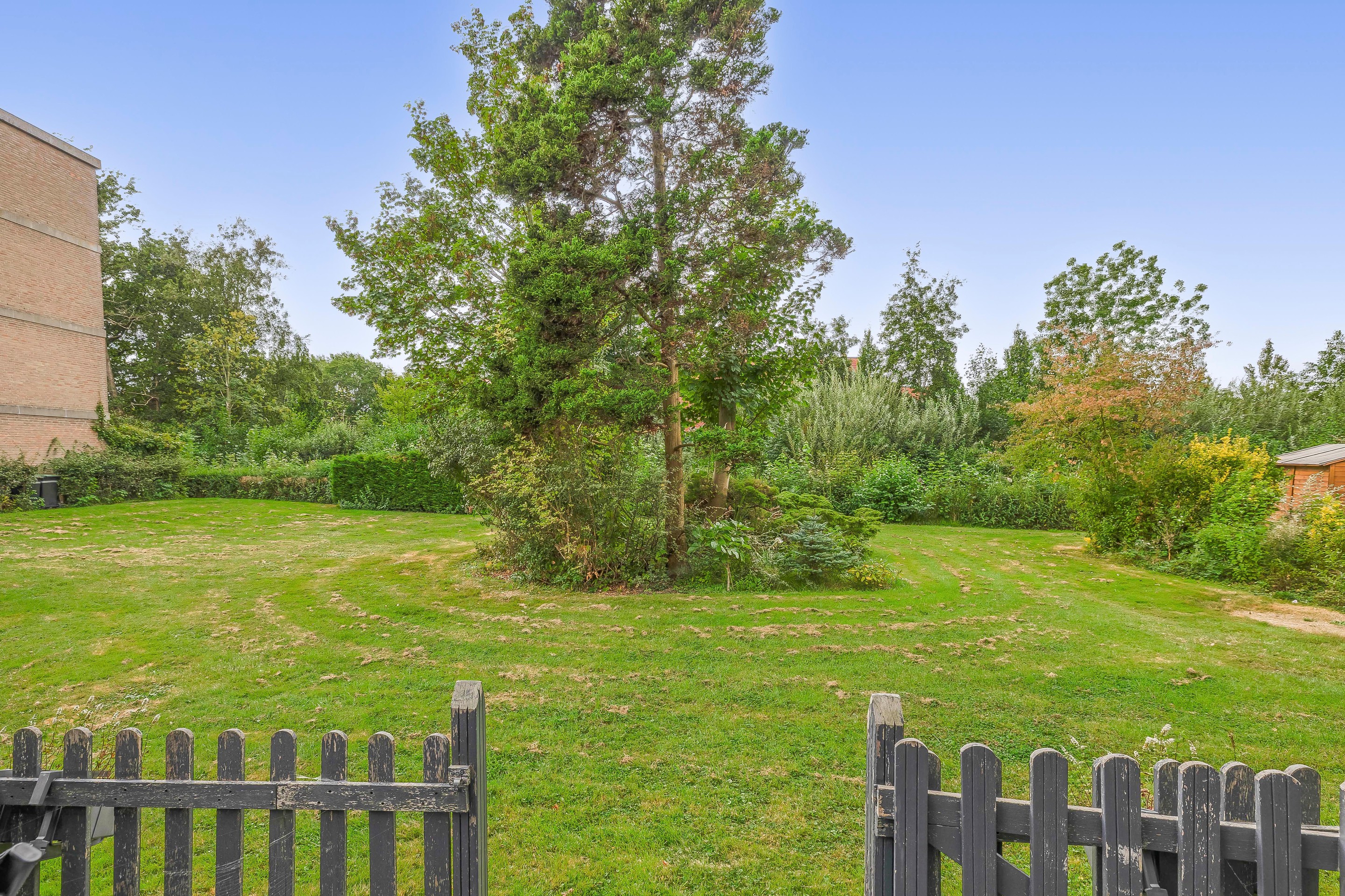 Aan de achterzijde van het complex grenst de woning aan een groene strook met volwassen bomen, wat zorgt voor een gevoel van rust en privacy.