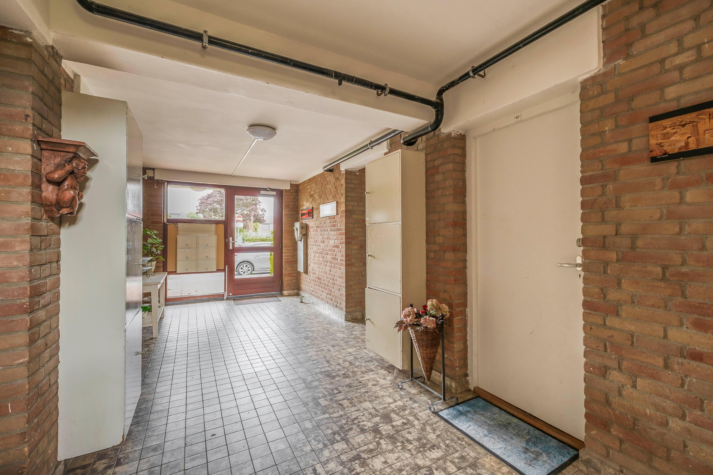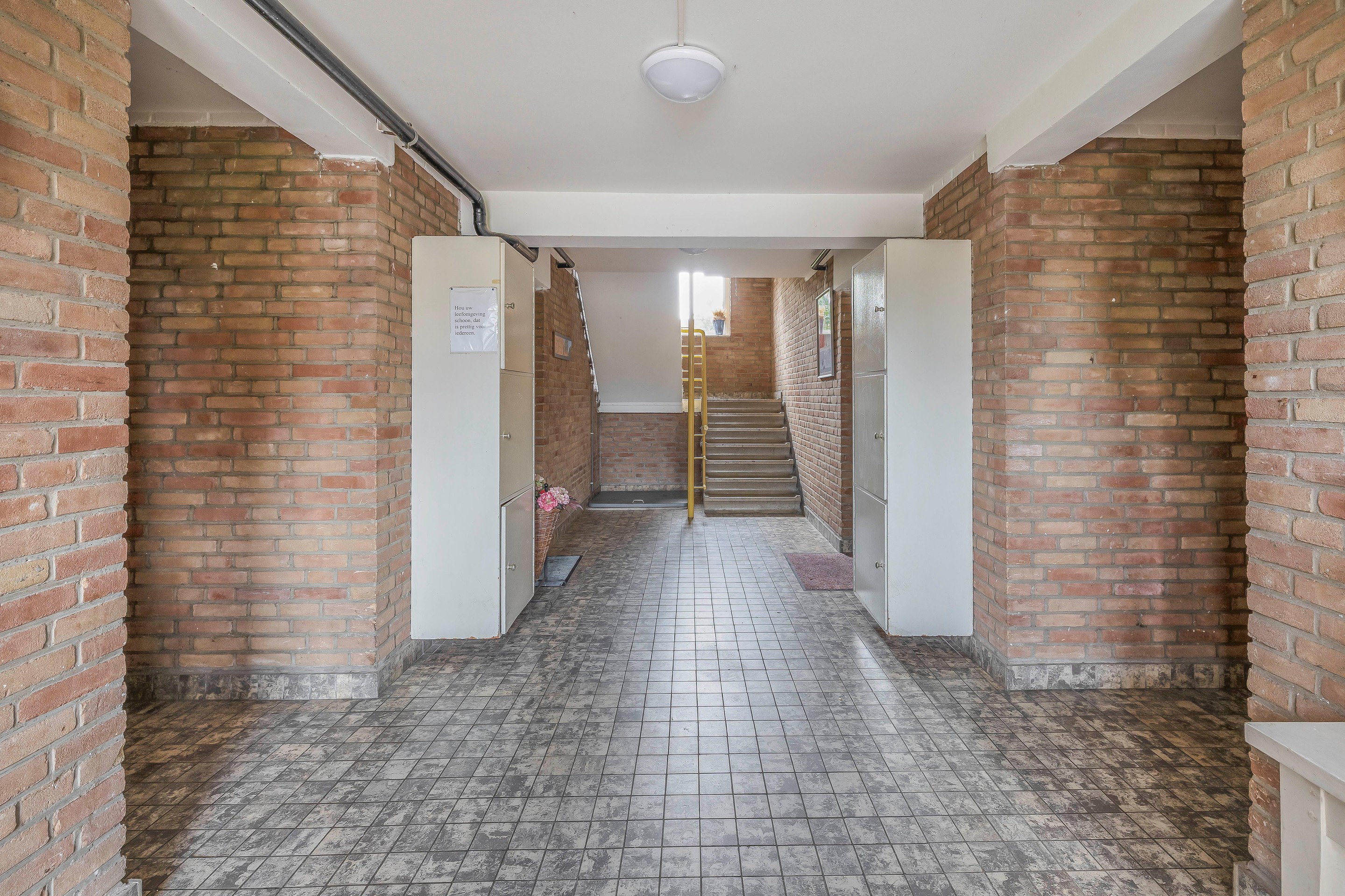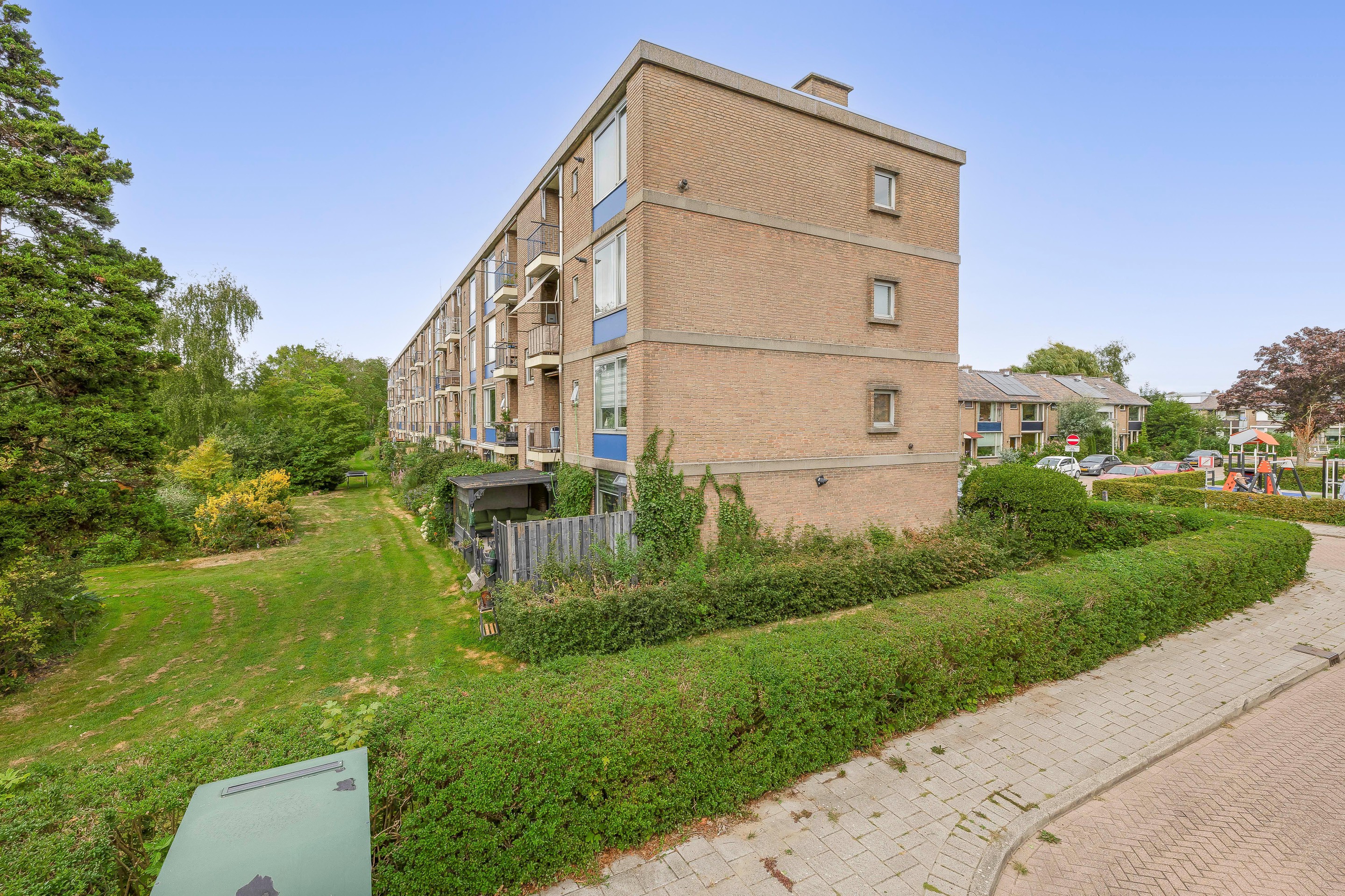 Aan de achterzijde van het complex grenst de woning aan een groene strook met volwassen bomen, wat zorgt voor een gevoel van rust en privacy.
