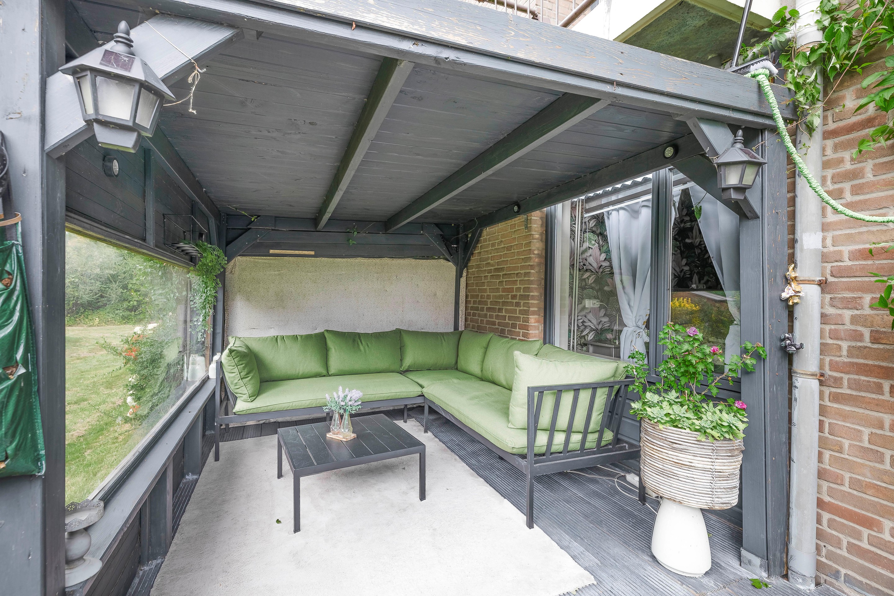 Deze tuin ligt op het westen en is uitgerust met een houten vlonder. Het terras grenst direct aan een groot, gemeenschappelijk grasveld. Daarnaast is er een kleine veranda waar je 's avonds heerlijk kunt zitten en van de laatste zonnestralen kunt genieten.