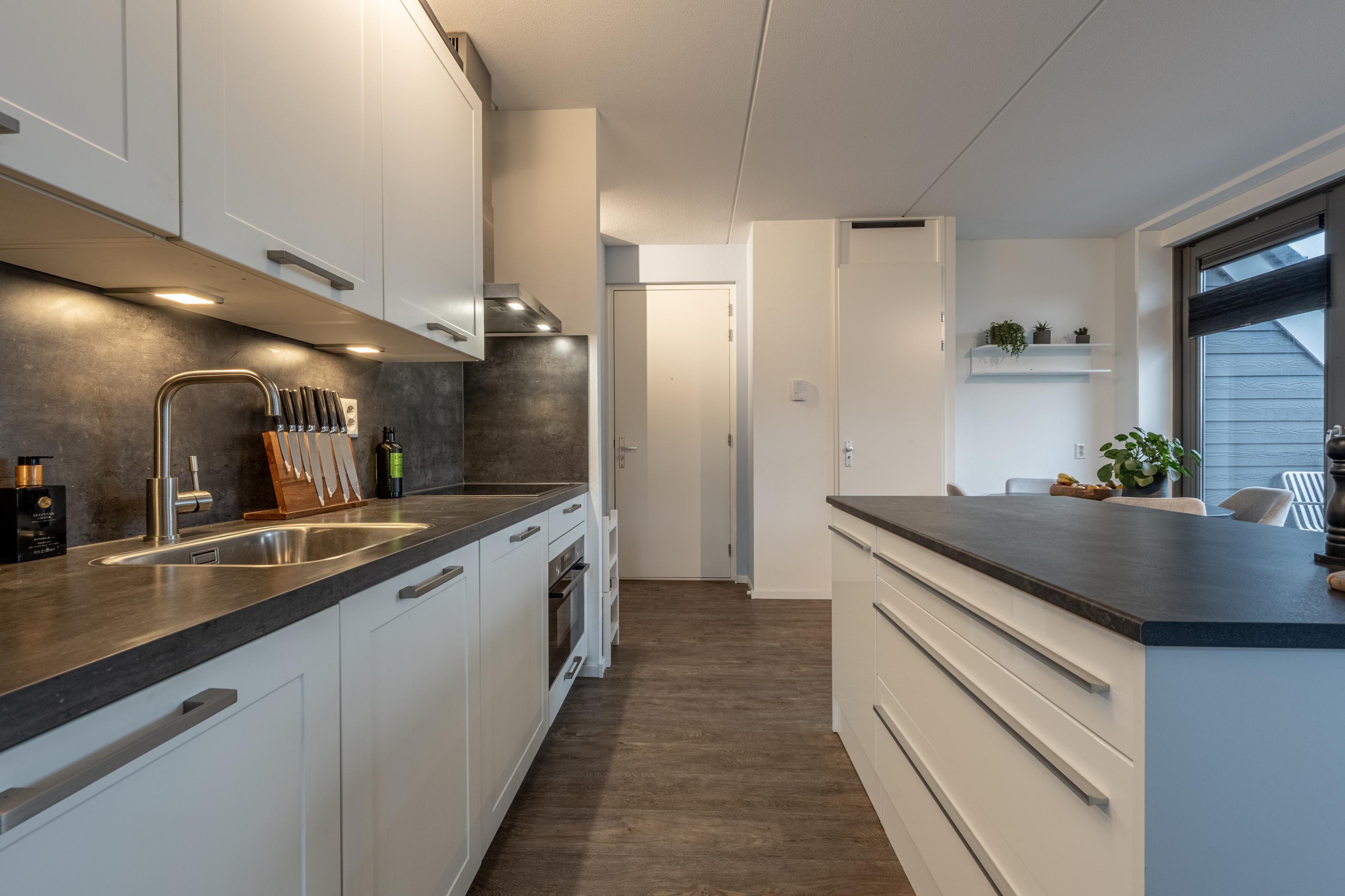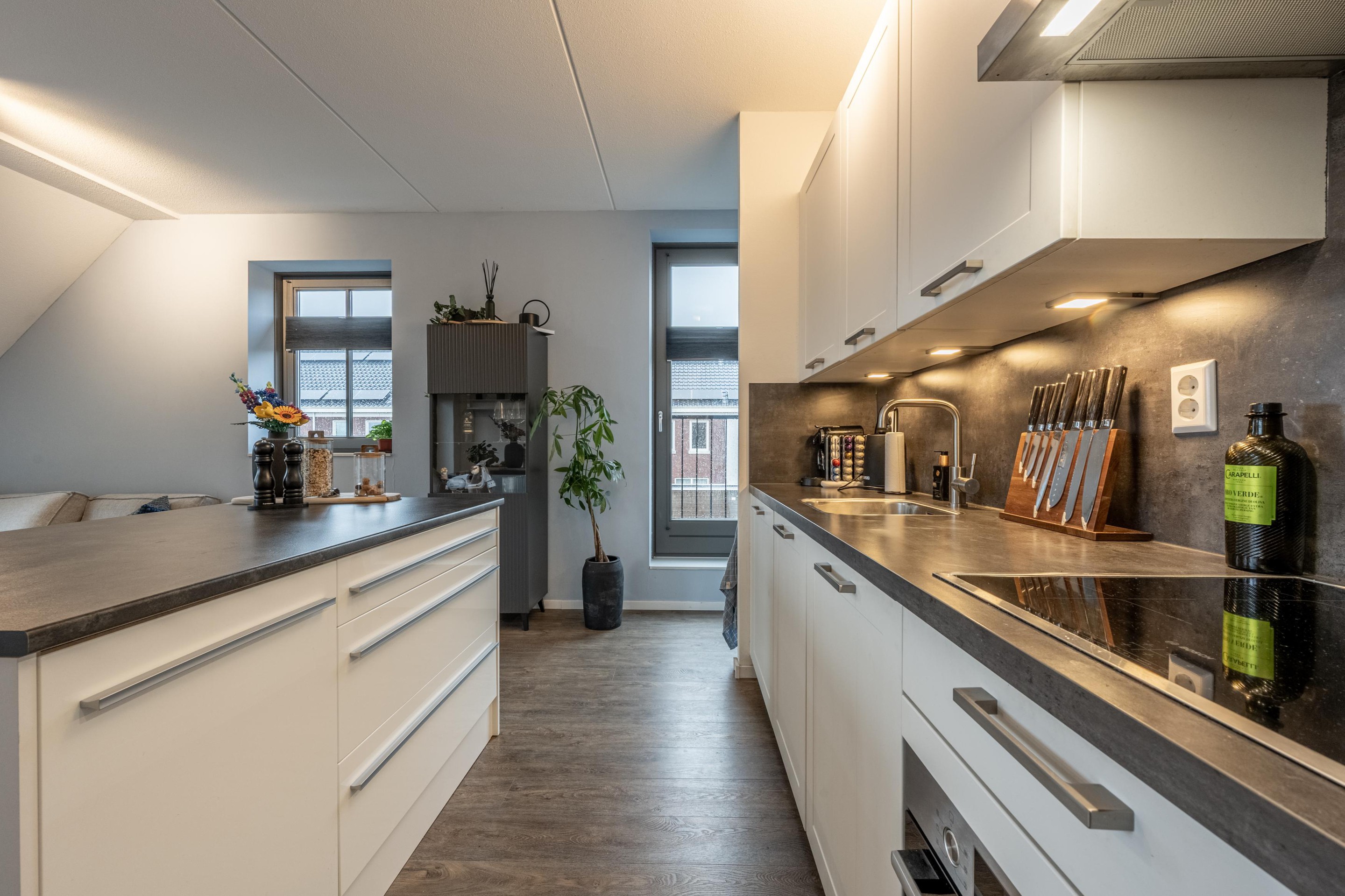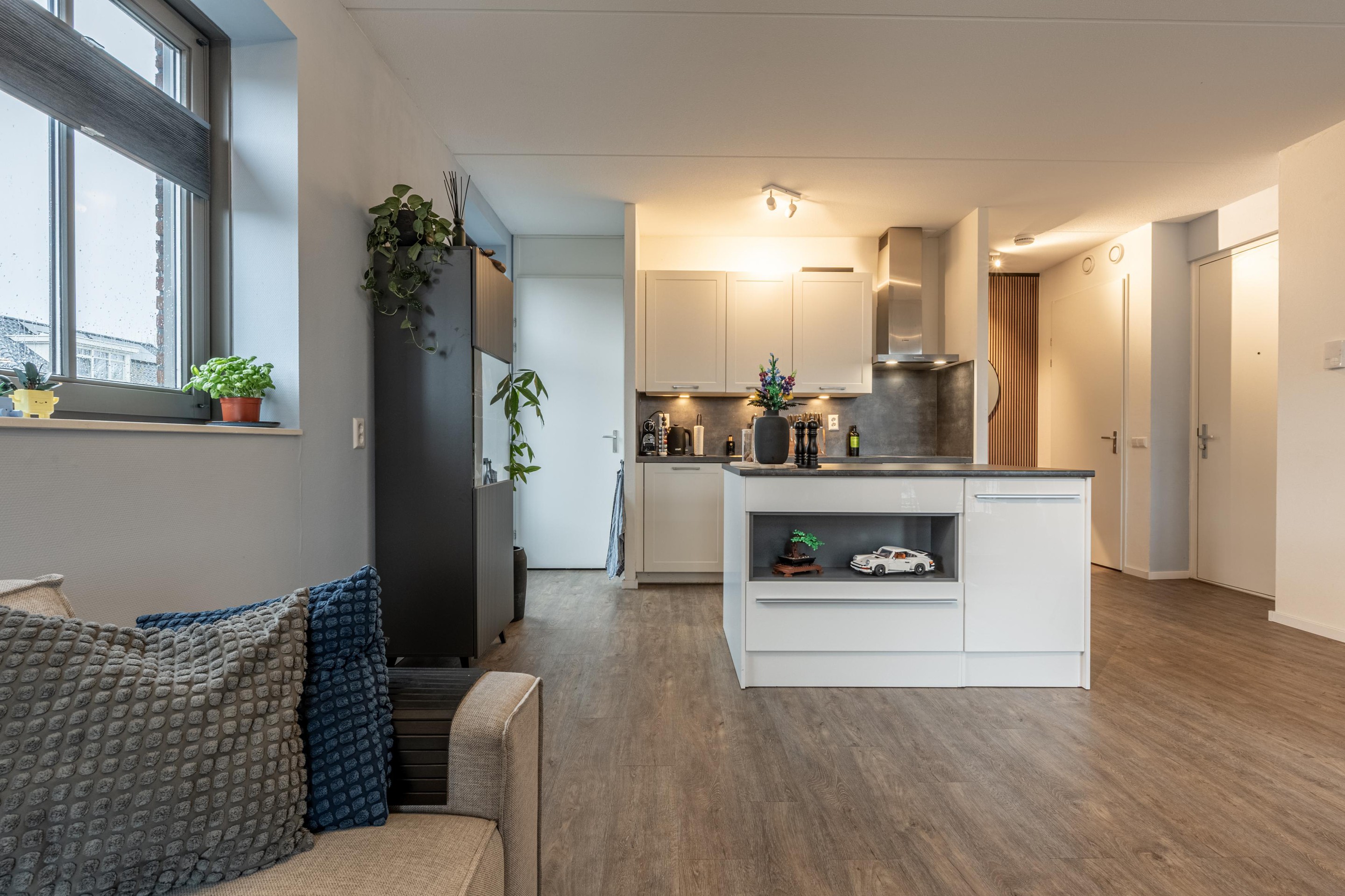 De open keuken met kookeiland is modern, overzichtelijk en voorzien van alle apparatuur die je nodig hebt: een inductiekookplaat, afzuigkap, koel-vriescombinatie en combimagnetron. Terwijl je kookt, kijk je fijn de woonkamer in; precies zo’n indeling die het wonen extra gezellig maakt. Naast de keuken bevindt zich bovendien een handige voorraadkast.
