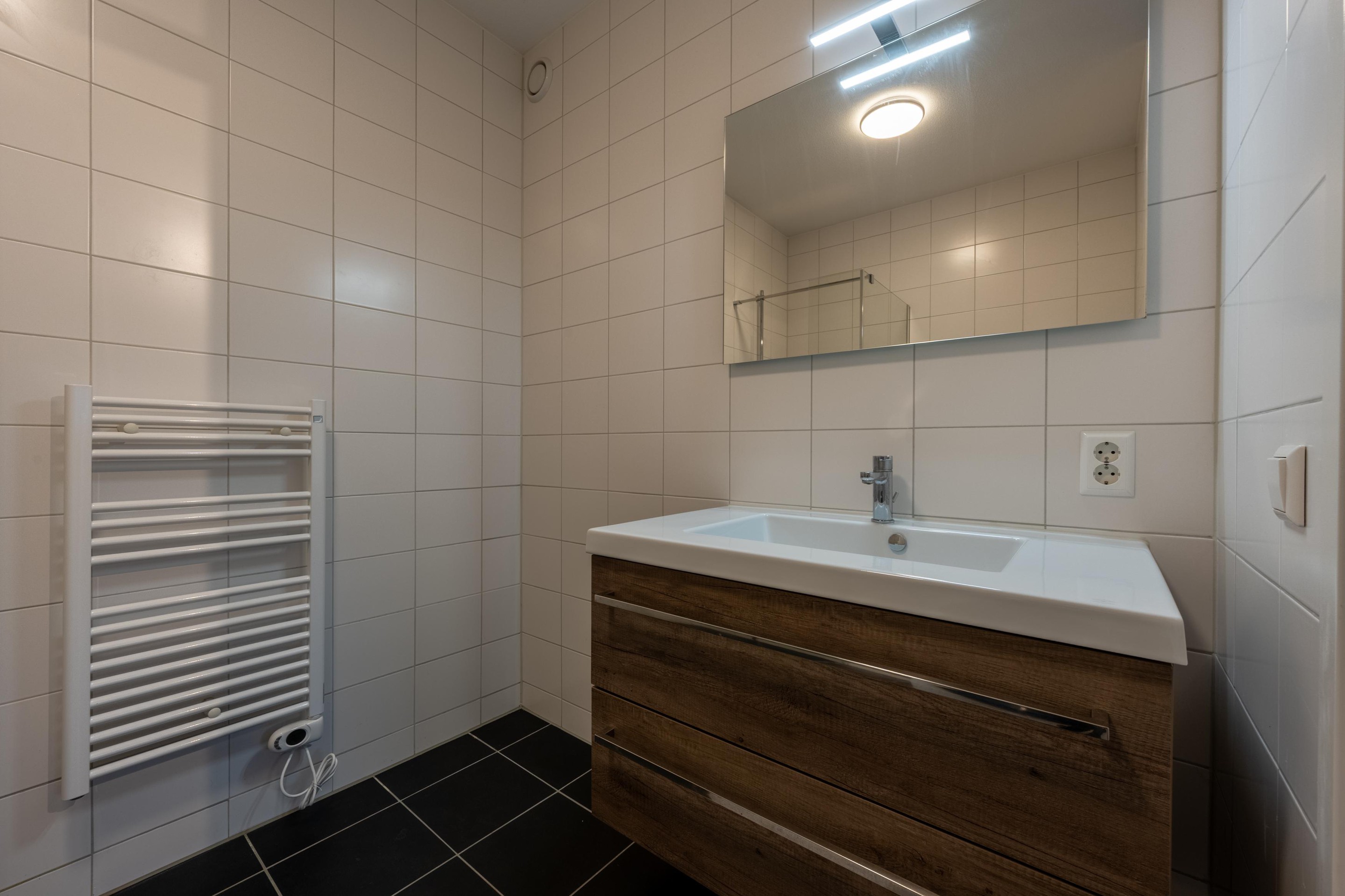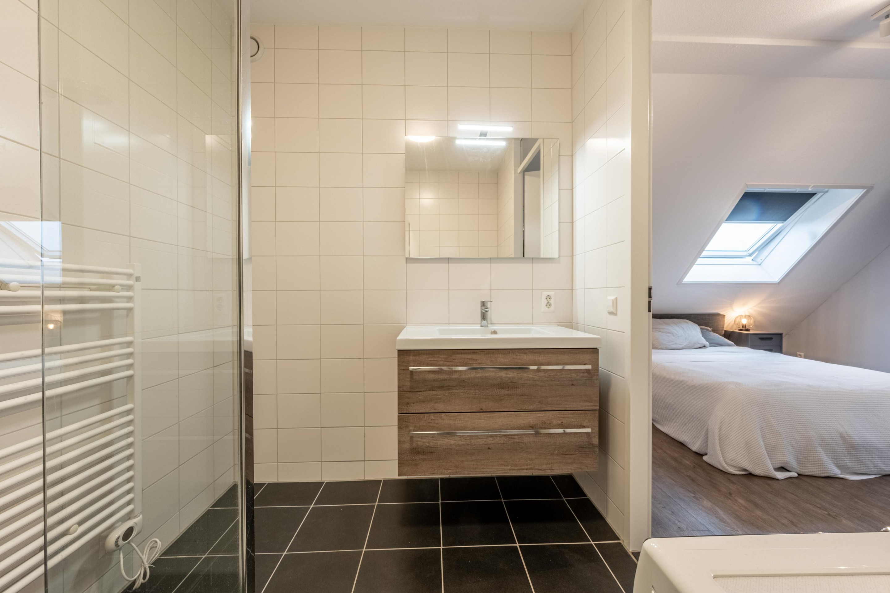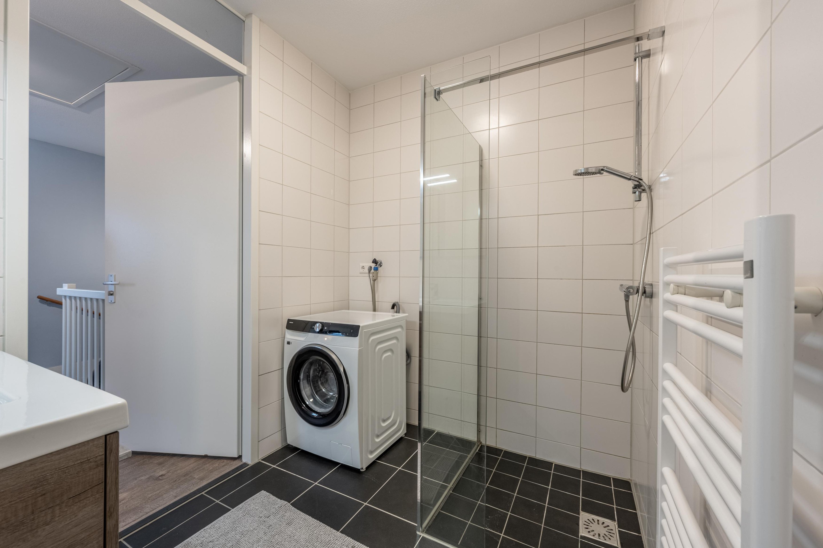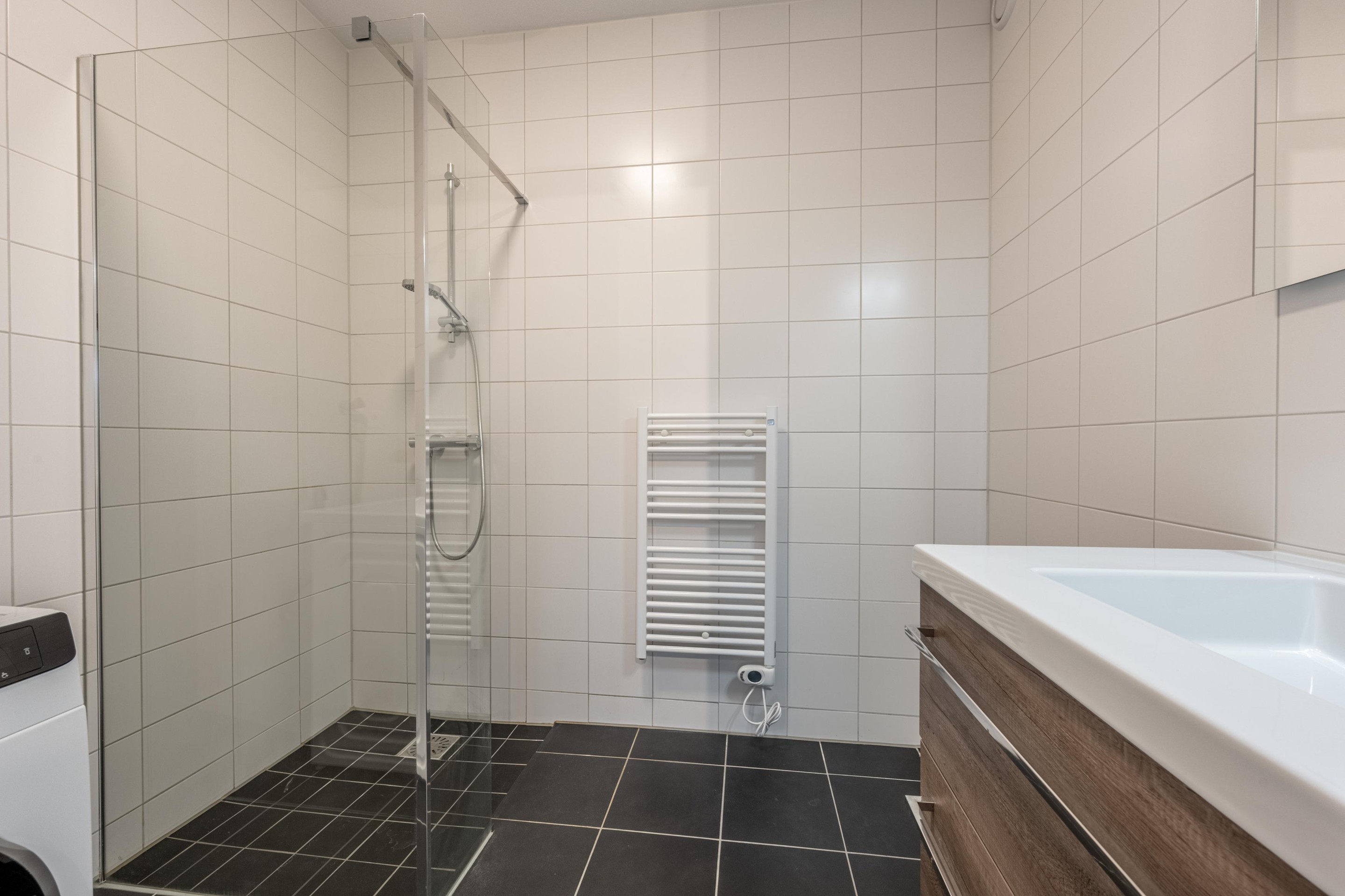 De moderne badkamer is uitgerust met een comfortabele inloopdouche, een strak wastafelmeubel en de aansluiting voor de wasmachine. Alles voelt fris, modern en direct klaar voor gebruik.