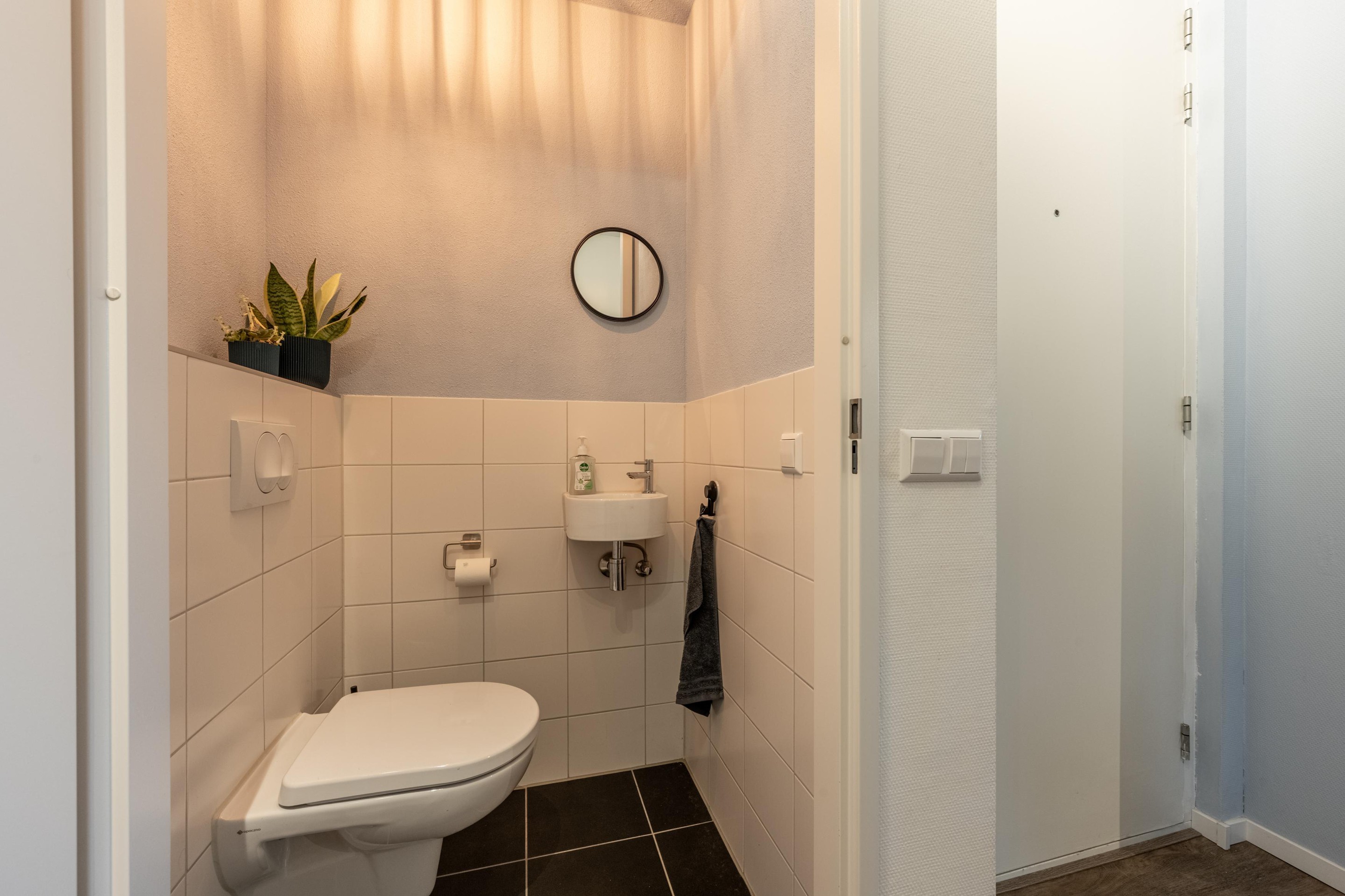 Hier vind je een nette toiletruimte met hangend toilet en fonteintje, de meterkast én de trapopgang naar boven.