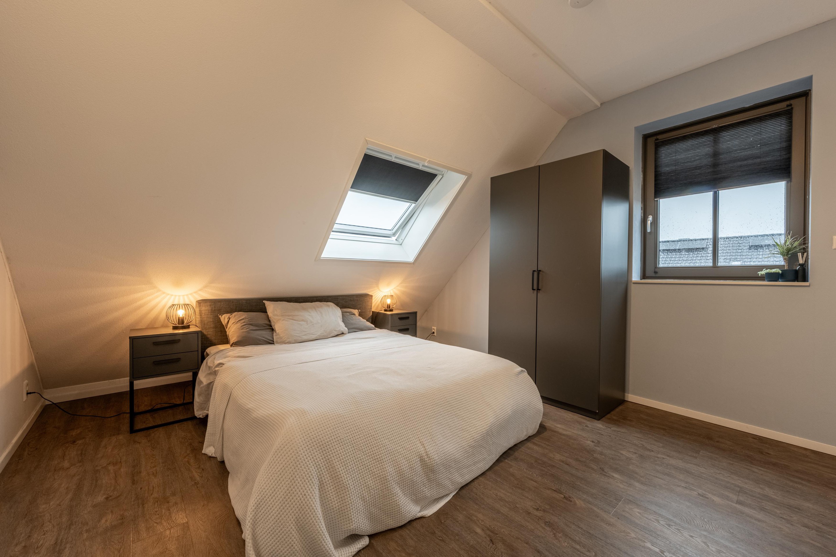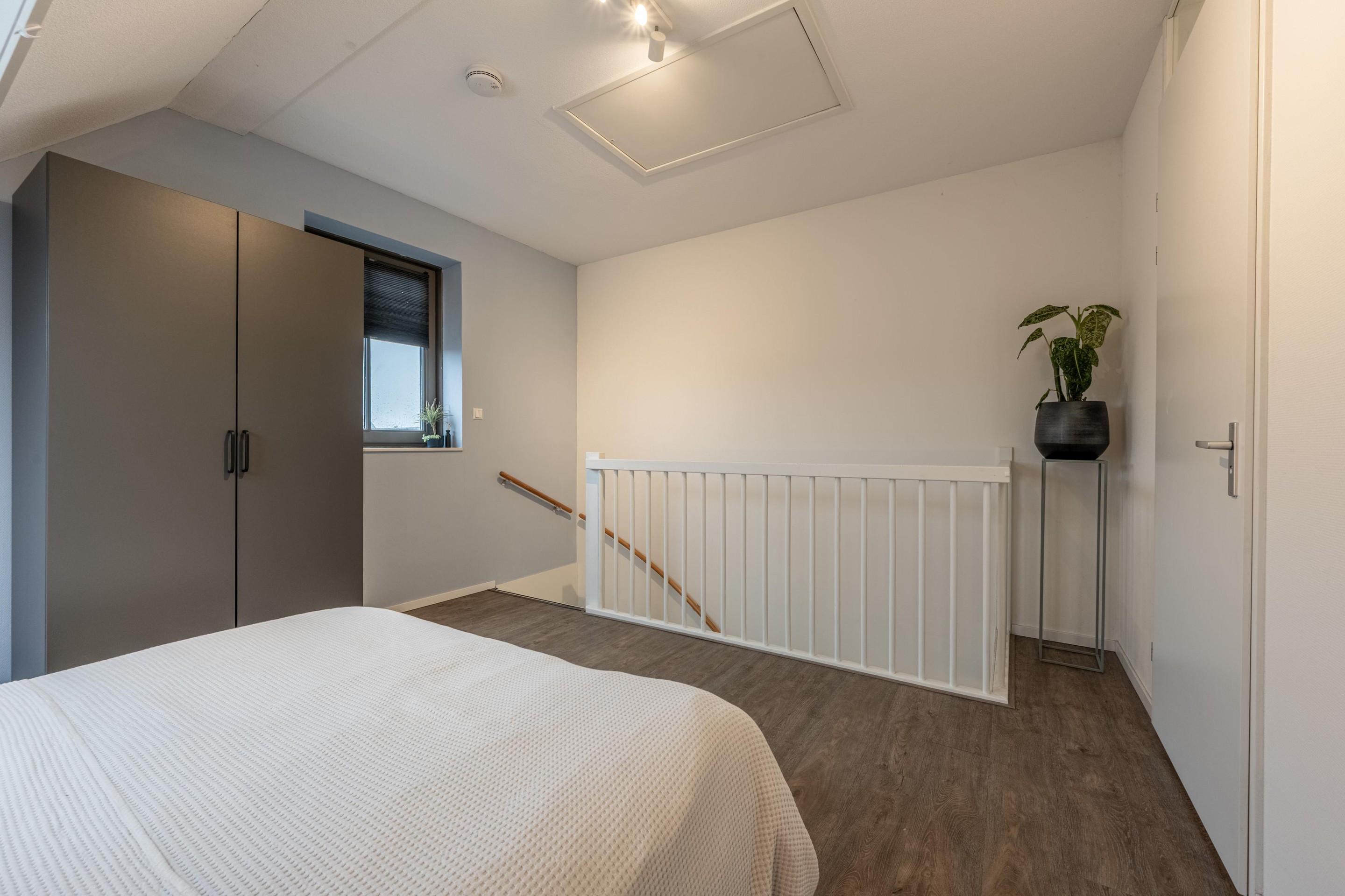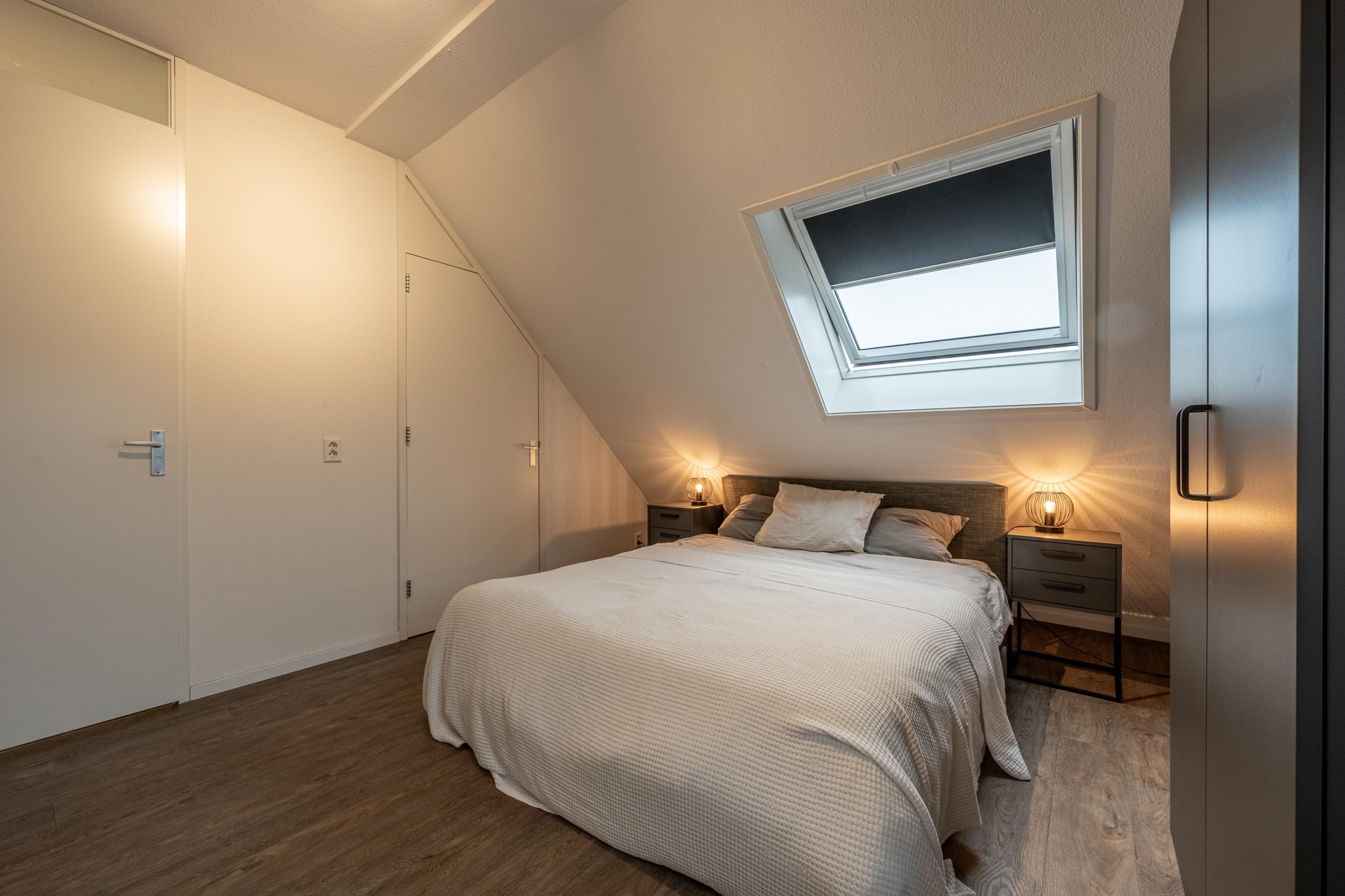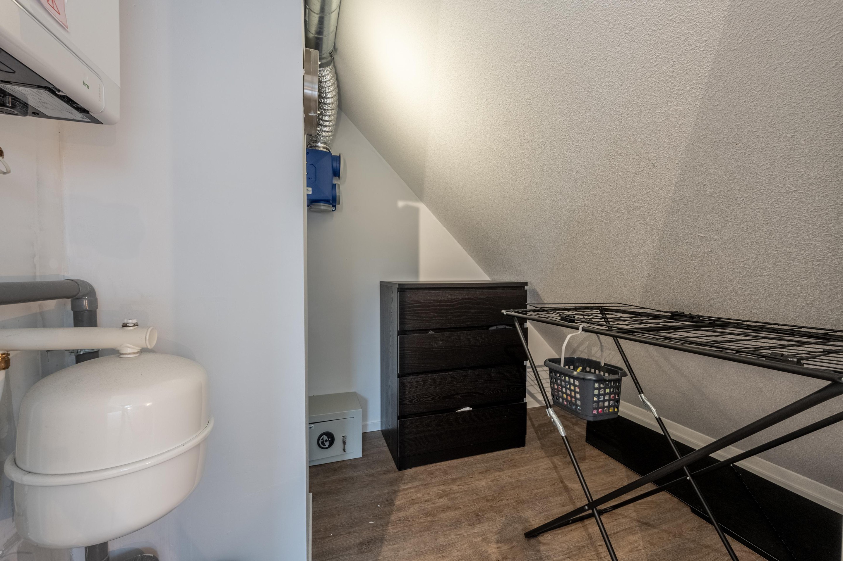 Op de tweede verdieping vind je de ruime slaapkamer, compleet met een groot dakraam en toegang tot de bergzolder via een vlizotrap — ideaal voor koffers, seizoensspullen en alles wat je uit het zicht wilt bewaren. Daarnaast is er nog een aparte bergruimte voor extra opslag en de opstelplaats van de CV-ketel.