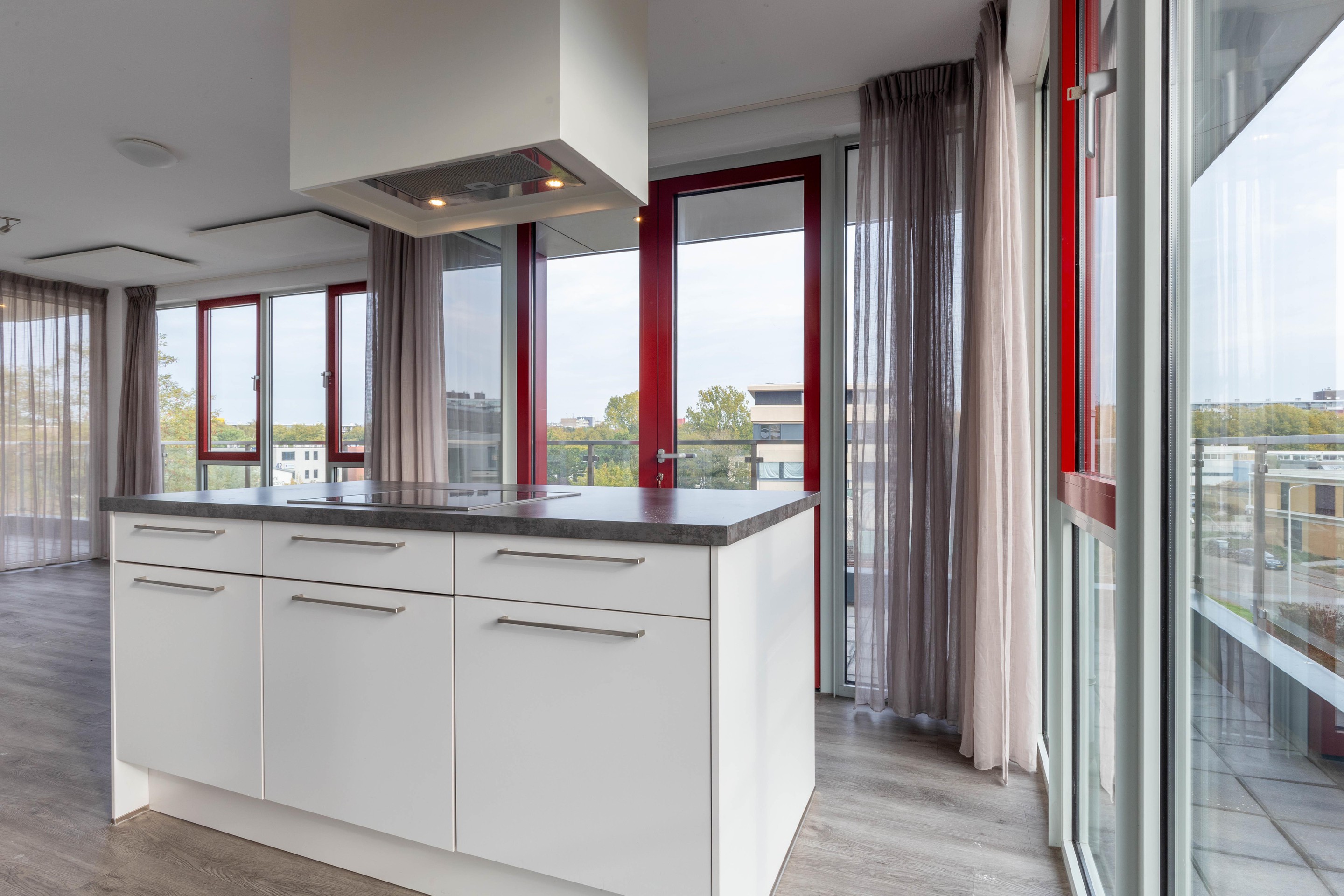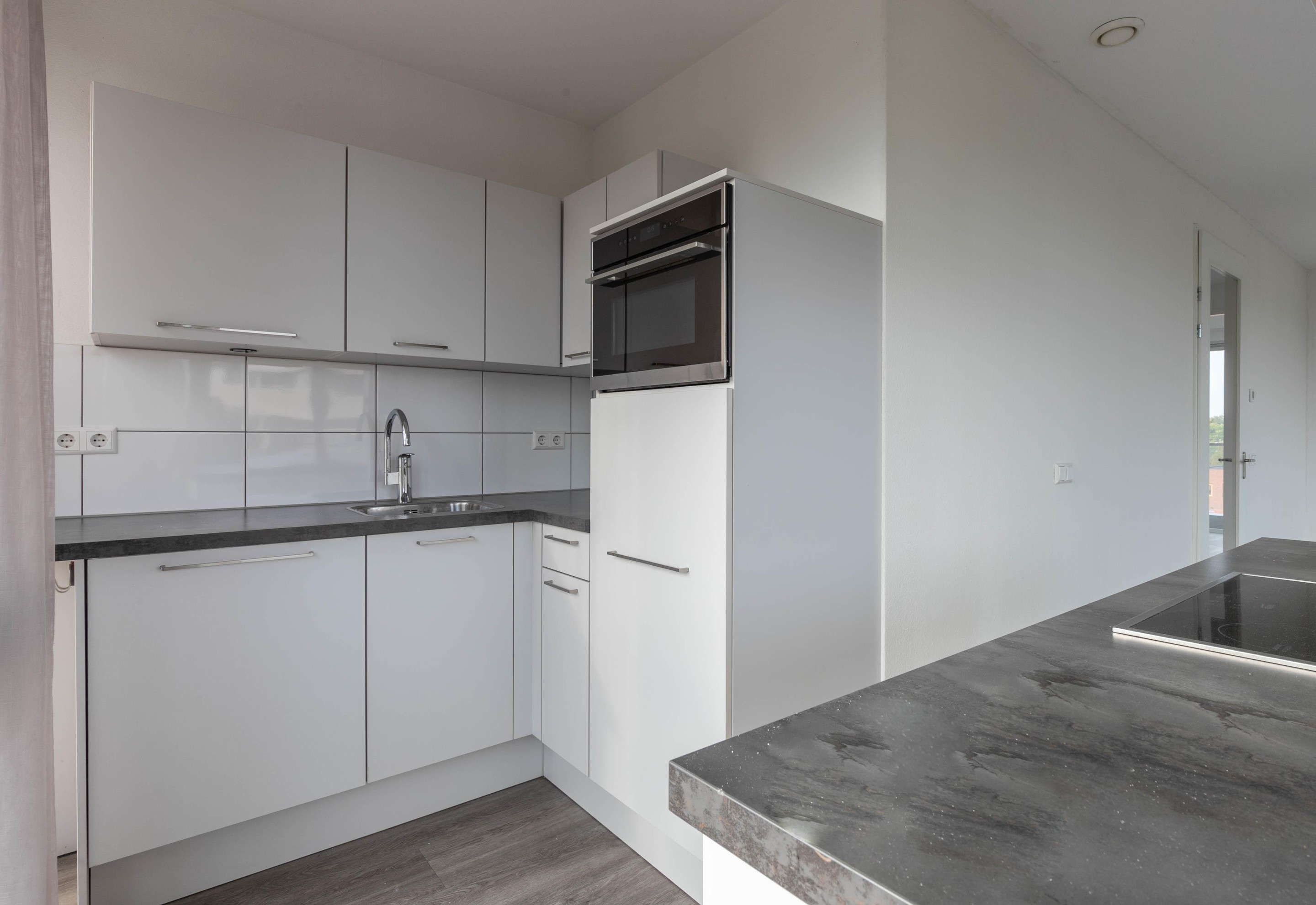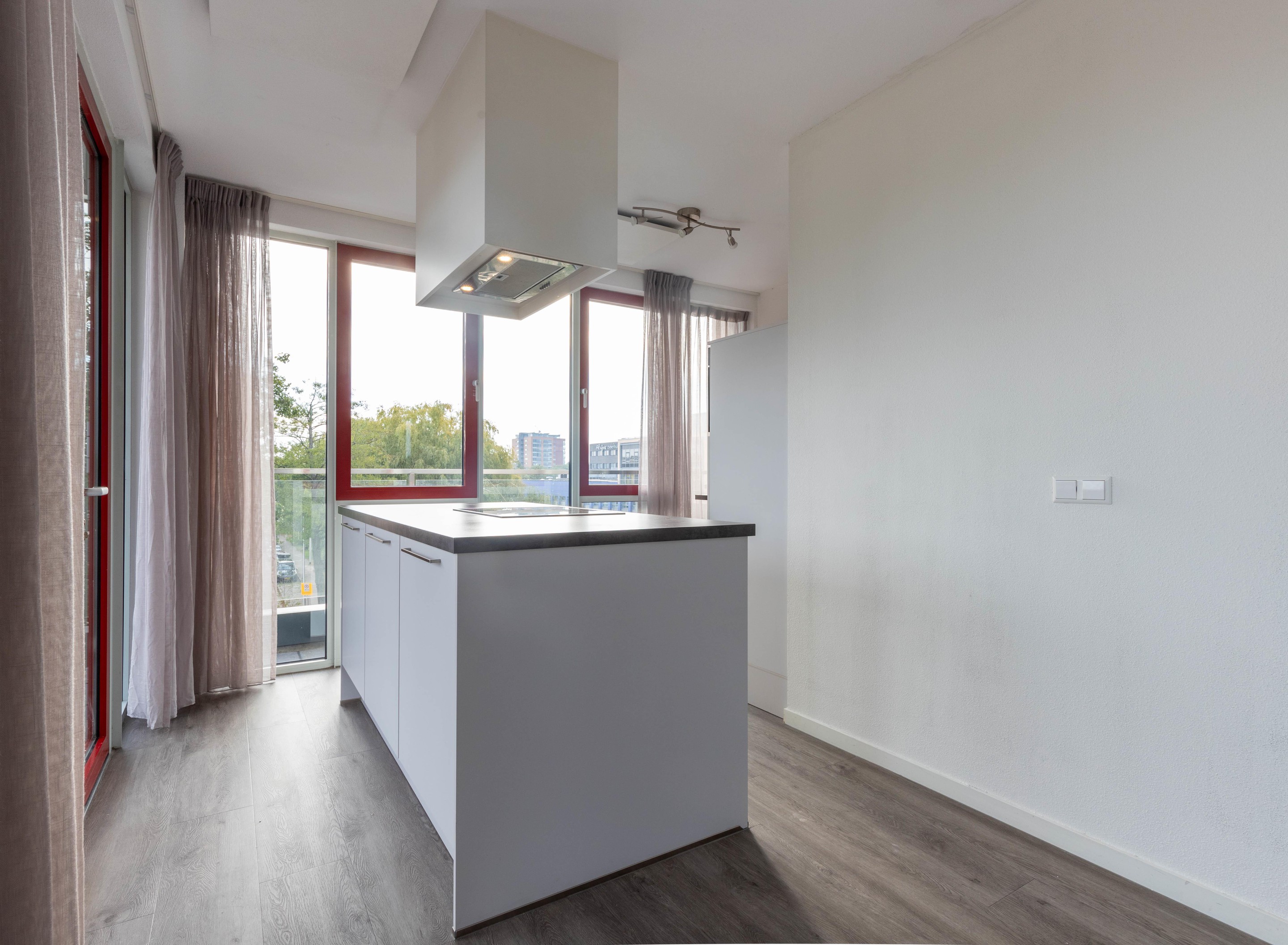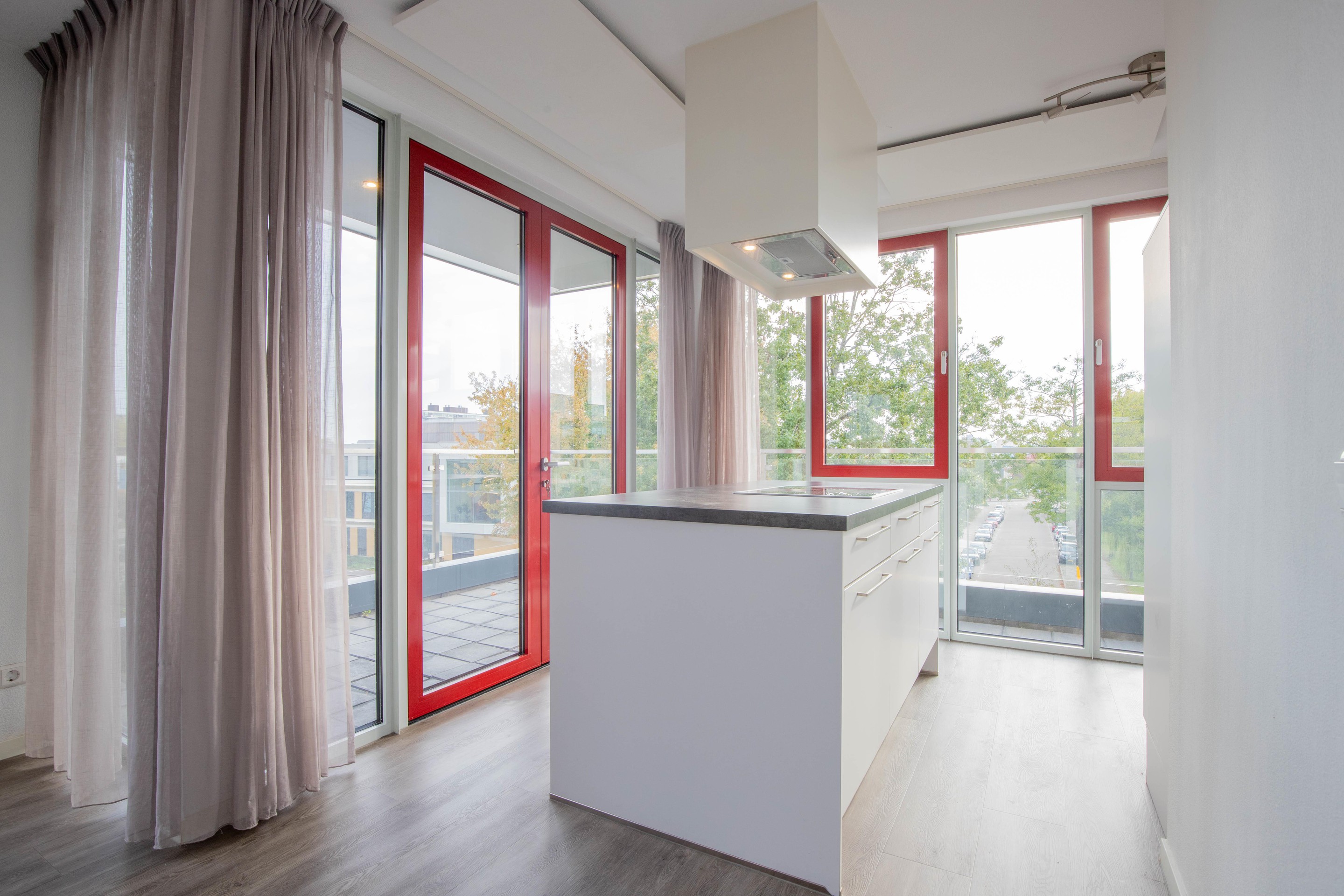 Eerste verdieping Meterkast. Entree: Hal. Modern vrijhangend toilet. Inpandige berging met aansluiting wasmachine en boiler. Moderne geheel betegelde badkamer voorzien van wastafel in meubel en inloopdouche. Eerste slaapkamer. Vanuit de hal is er toegang tot de royale woonkamer met een moderne open keuken voorzien van kookeiland en diverse inbouwapparatuur, door de grootte raampartijen heeft de woonkamer veel lichtinval. Vanuit de keuken zijn er openslaande deuren naar het grote dakterras. Aan de achterzijde van het appartement bevindt zich de tweede royale slaapkamer met tevens openslaande deuren naar het dakterras.