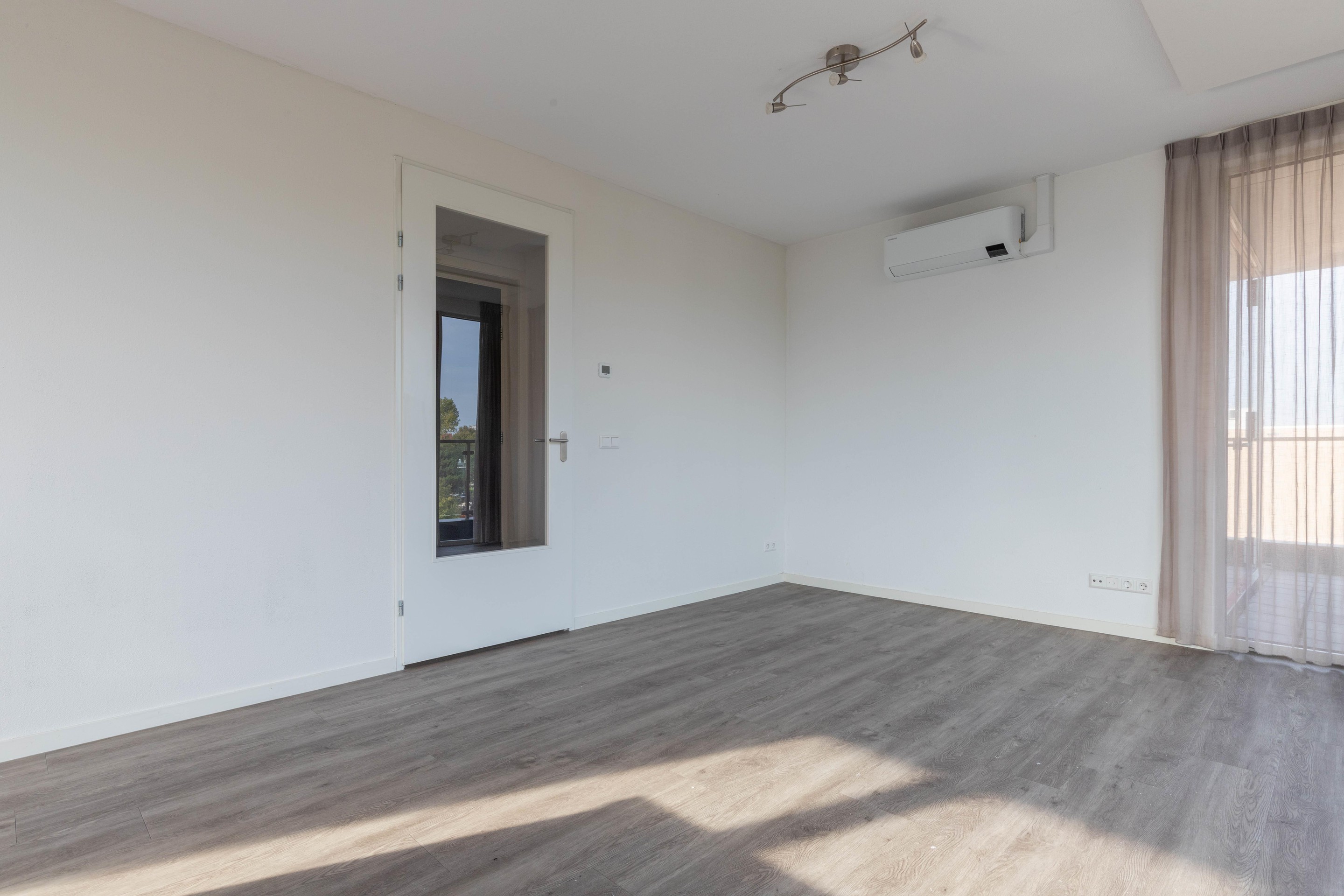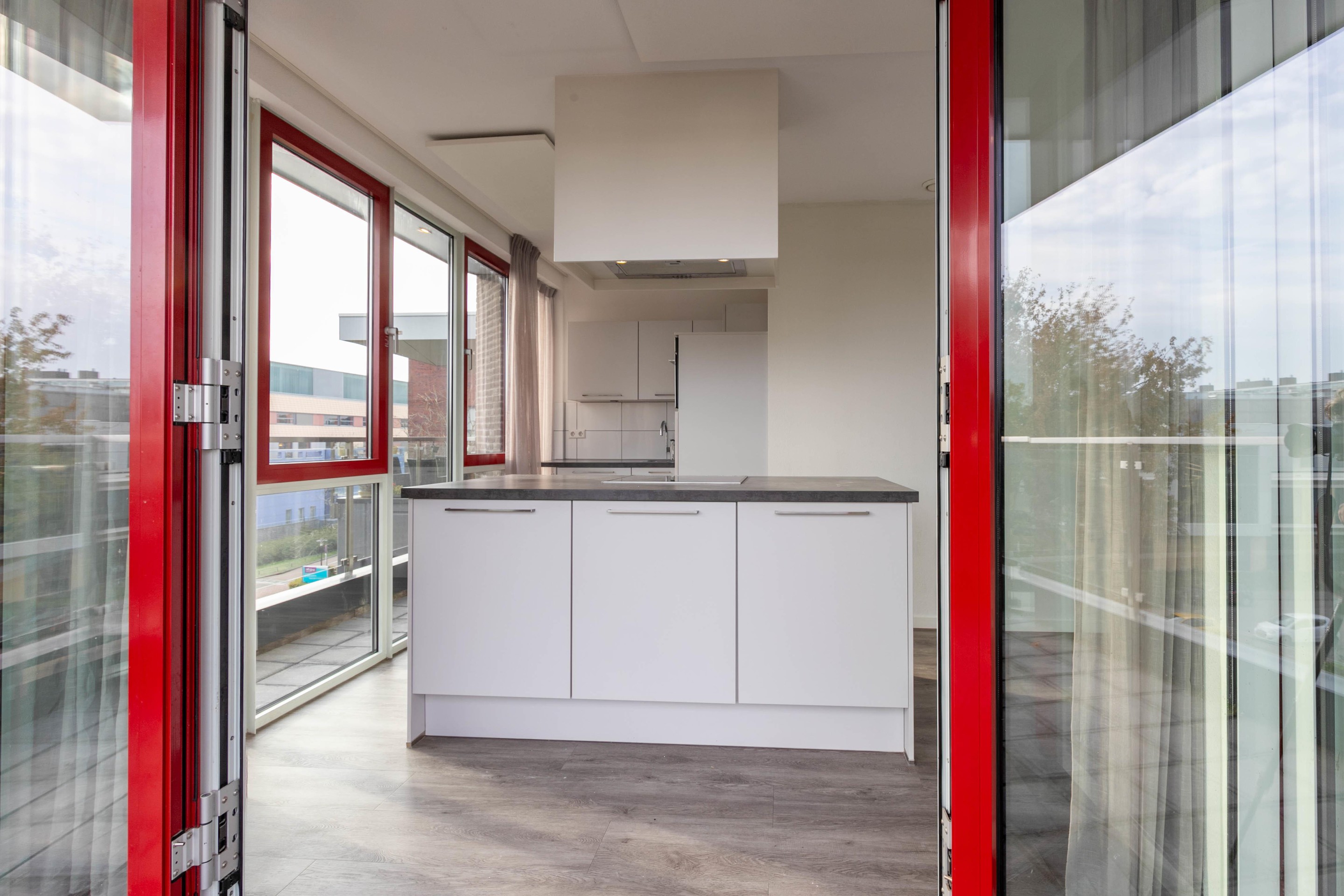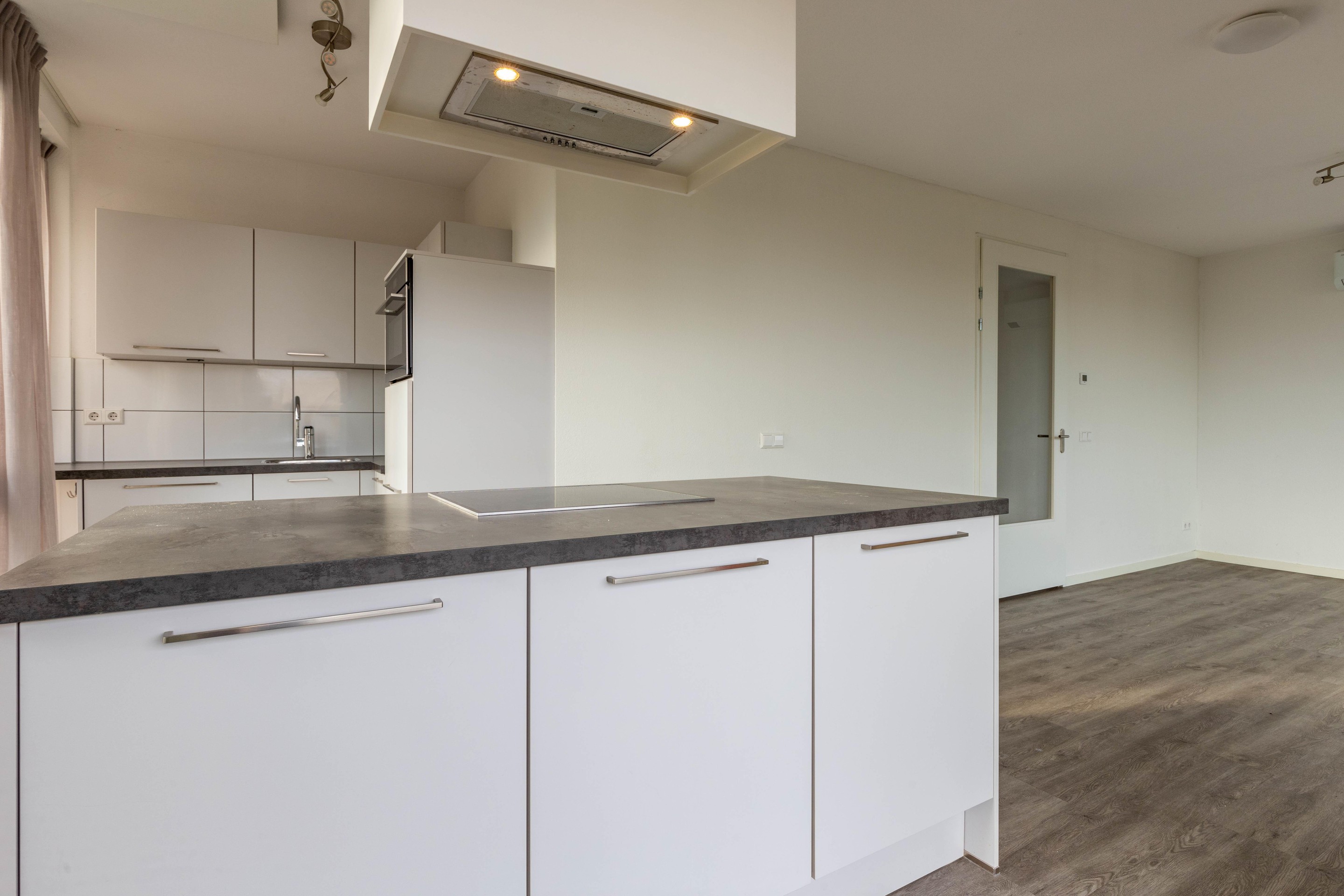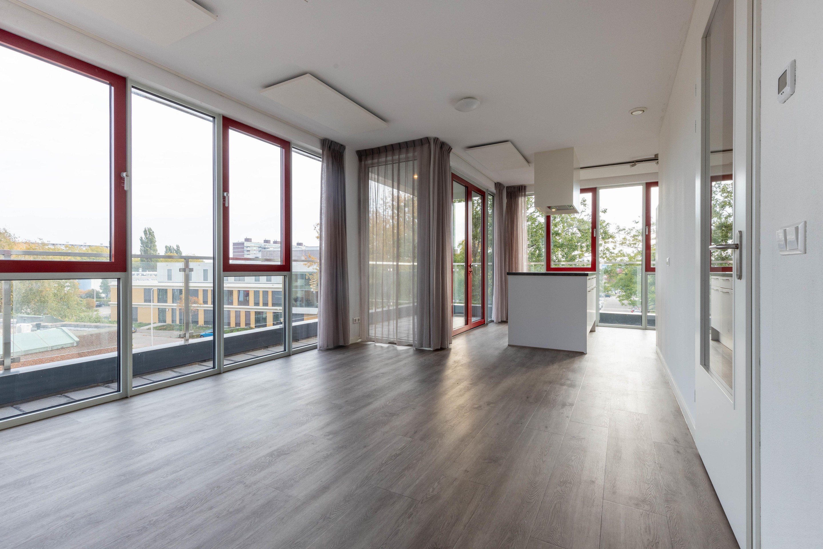 Eerste verdieping Meterkast. Entree: Hal. Modern vrijhangend toilet. Inpandige berging met aansluiting wasmachine en boiler. Moderne geheel betegelde badkamer voorzien van wastafel in meubel en inloopdouche. Eerste slaapkamer. Vanuit de hal is er toegang tot de royale woonkamer met een moderne open keuken voorzien van kookeiland en diverse inbouwapparatuur, door de grootte raampartijen heeft de woonkamer veel lichtinval. Vanuit de keuken zijn er openslaande deuren naar het grote dakterras. Aan de achterzijde van het appartement bevindt zich de tweede royale slaapkamer met tevens openslaande deuren naar het dakterras.