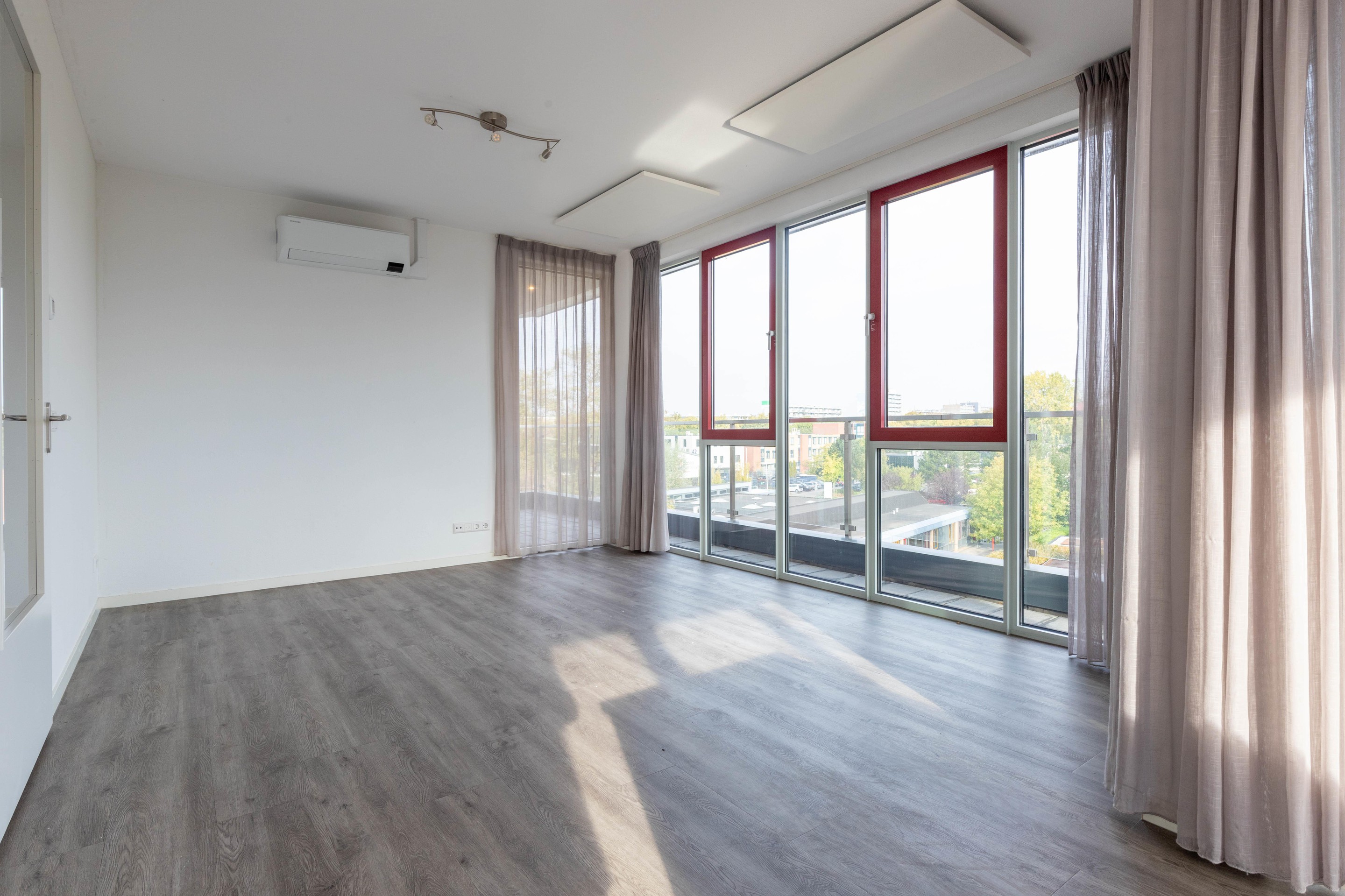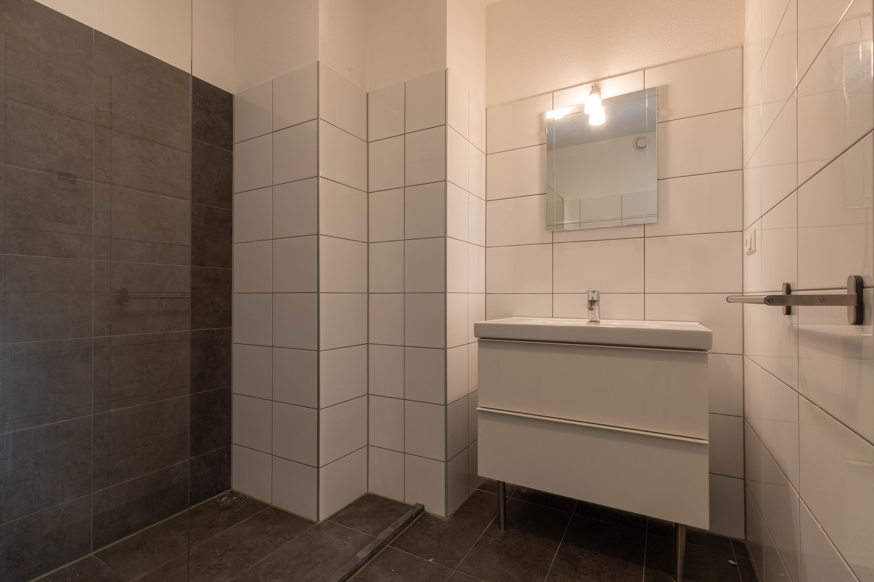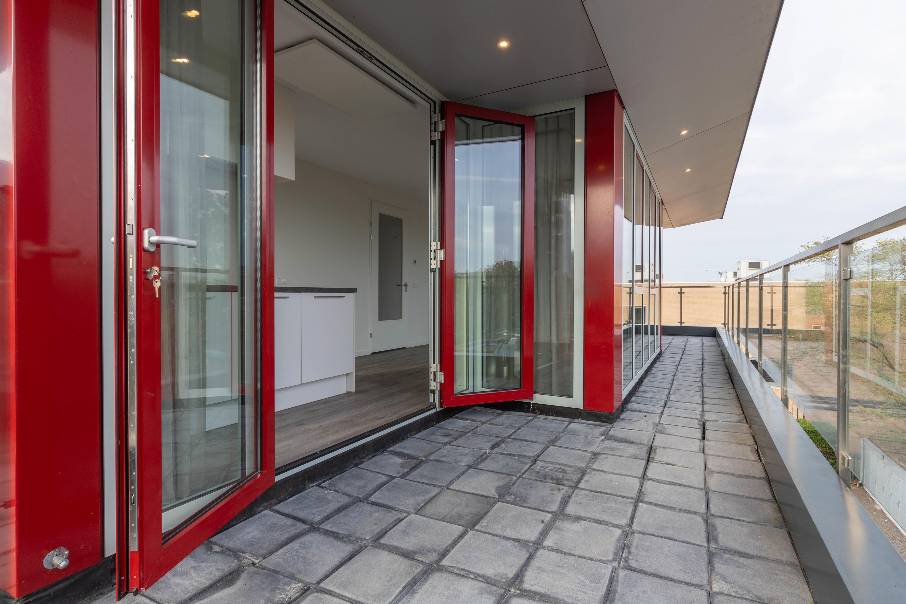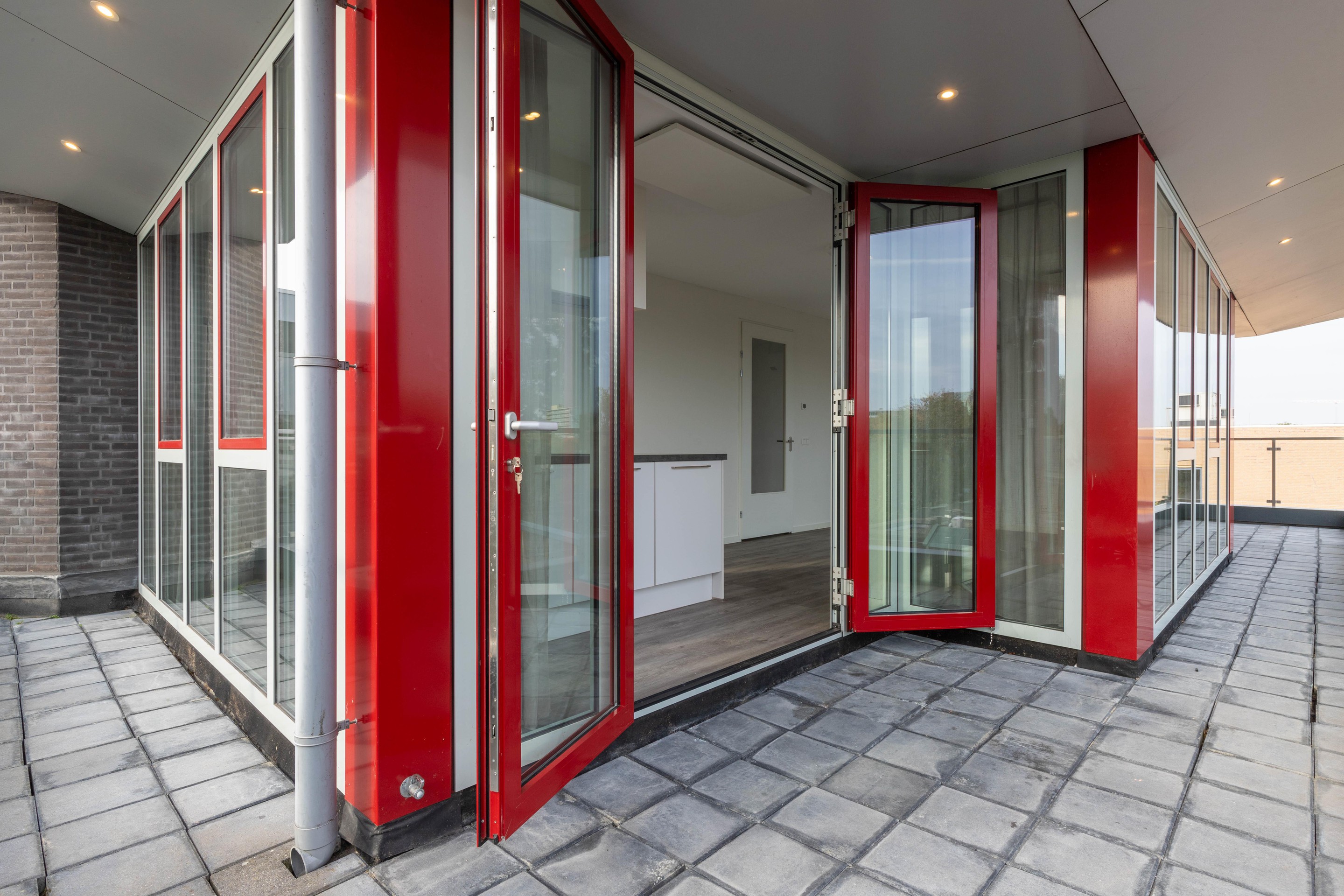 Eerste verdieping Meterkast. Entree: Hal. Modern vrijhangend toilet. Inpandige berging met aansluiting wasmachine en boiler. Moderne geheel betegelde badkamer voorzien van wastafel in meubel en inloopdouche. Eerste slaapkamer. Vanuit de hal is er toegang tot de royale woonkamer met een moderne open keuken voorzien van kookeiland en diverse inbouwapparatuur, door de grootte raampartijen heeft de woonkamer veel lichtinval. Vanuit de keuken zijn er openslaande deuren naar het grote dakterras. Aan de achterzijde van het appartement bevindt zich de tweede royale slaapkamer met tevens openslaande deuren naar het dakterras.