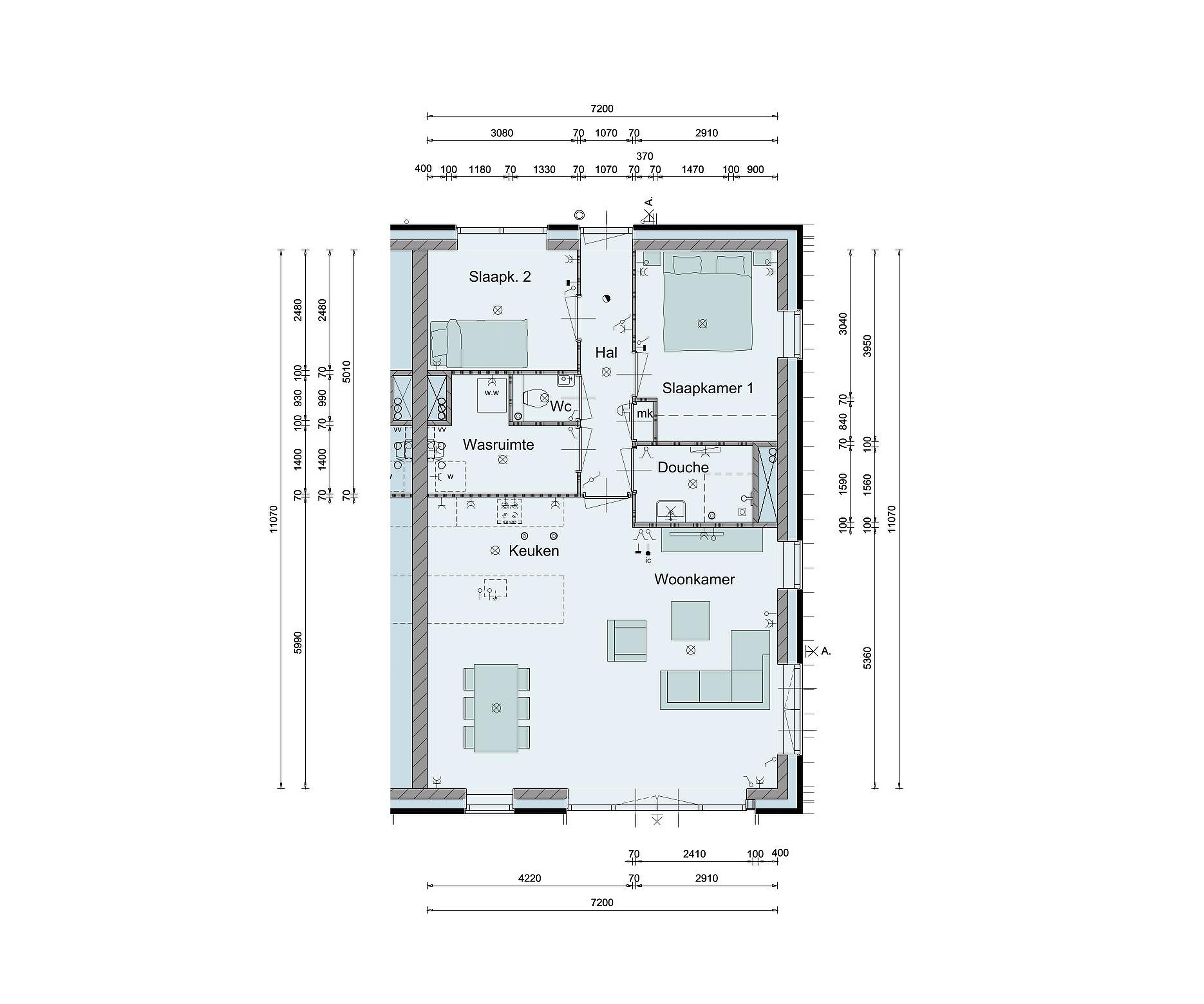 Begane grond In de entree van het complex bevinden zich de postkasten, de lift en het trappenhuis. Van type C” is één appartement beschikbaar. Het ligt op de tweede verdieping en beschikt over een dakterras, een balkon en een garage. U bereikt deze woning via trap of lift en een galerij. De woonkamer biedt plaats aan een zithoek en een eethoek. Omdat dit appartement tevens een hoekwoning is, is er naast de deur die toegang geeft tot het grote dakterras, een groot raam. De open keuken is gericht naar de kamer en heeft een baropstelling. Het appartement heeft twee slaapkamers. Ze liggen tegenover elkaar. De badkamer is voorzien van douche en wastafel. Het toilet vindt u in de hal. In de wasruimte bevinden zich aansluitingen voor een witgoedopstelling.