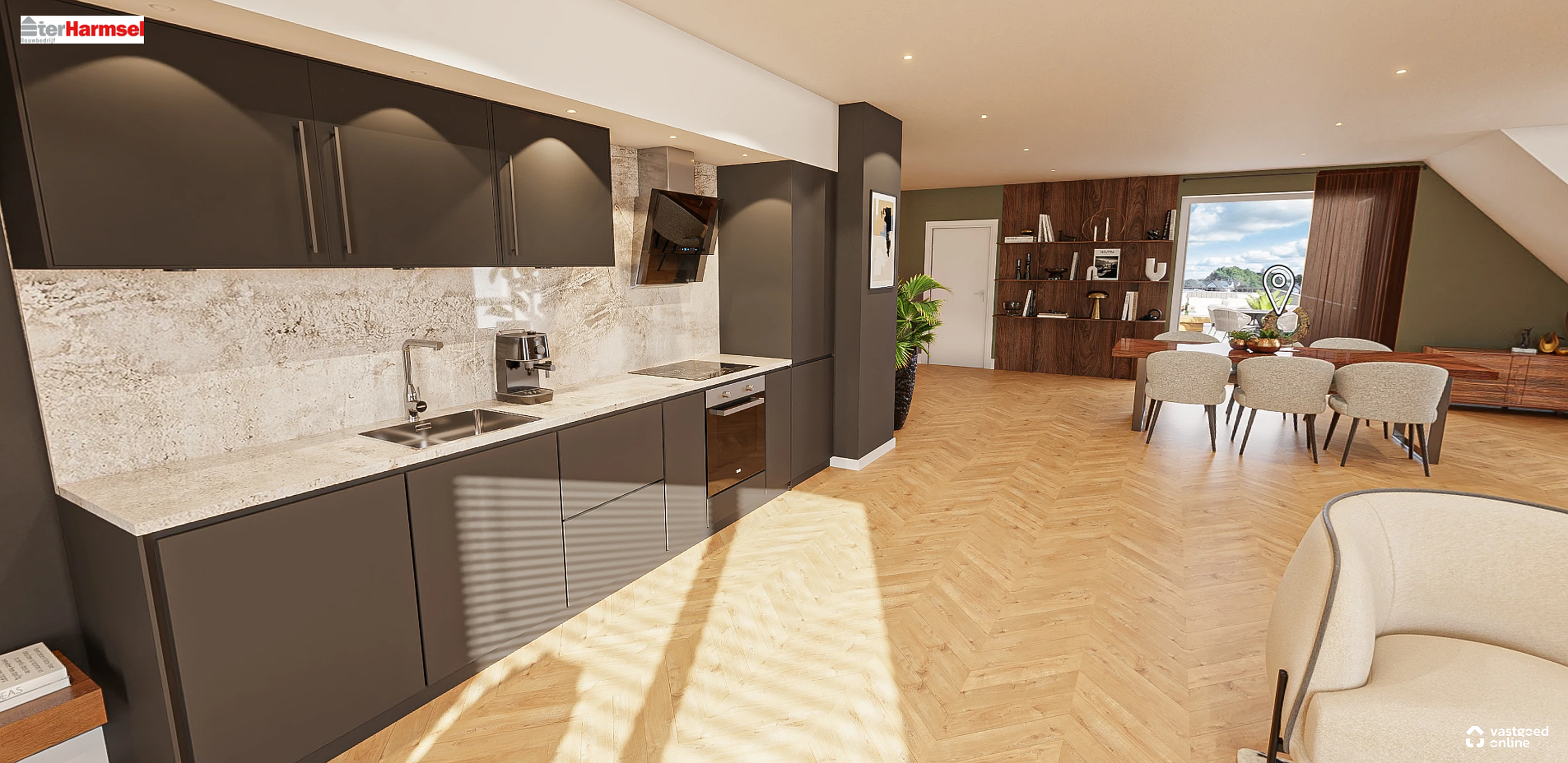 Middels de trap of lift komt u aan bij het royale driekamer penthouse. Middels de entree in de gang-/hal bereikt u de royale leefruimte voorzien van keuken, woonkamer én eetkamer met toegang tot het royale dakterras van ca. 30 m2.