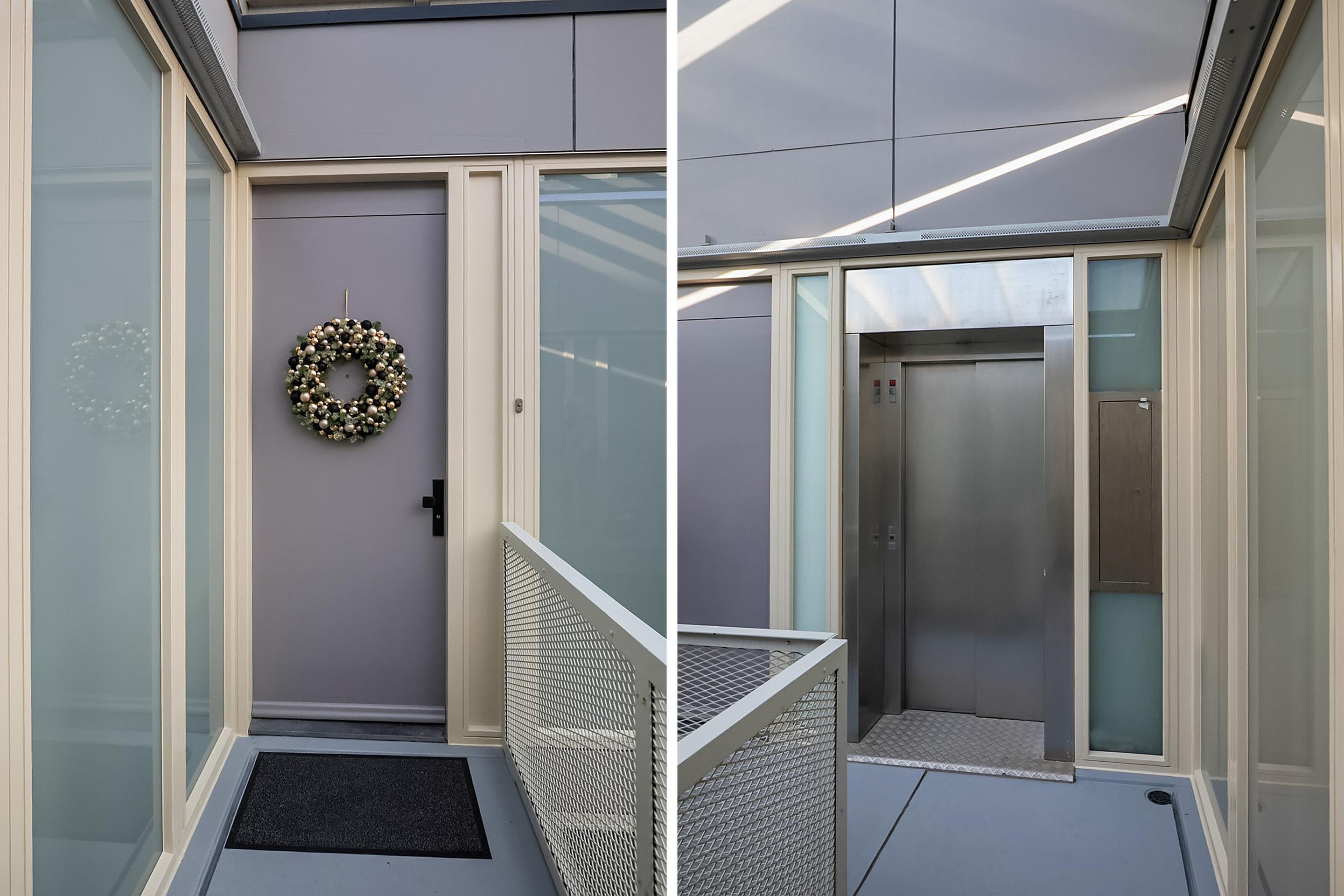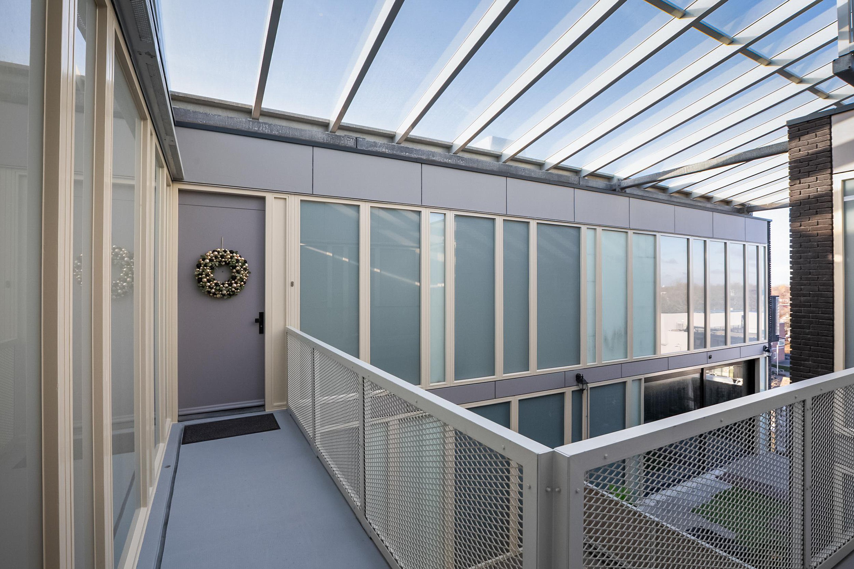 Bij aankomst betreedt u de representatieve entree op de begane grond, voorzien van een modern intercomsysteem. Via de liftinstallatie of het trappenhuis bereikt u comfortabel de vijfde verdieping, waar het recent geplaatste glazen atrium direct een elegante en lichte indruk achterlaat.