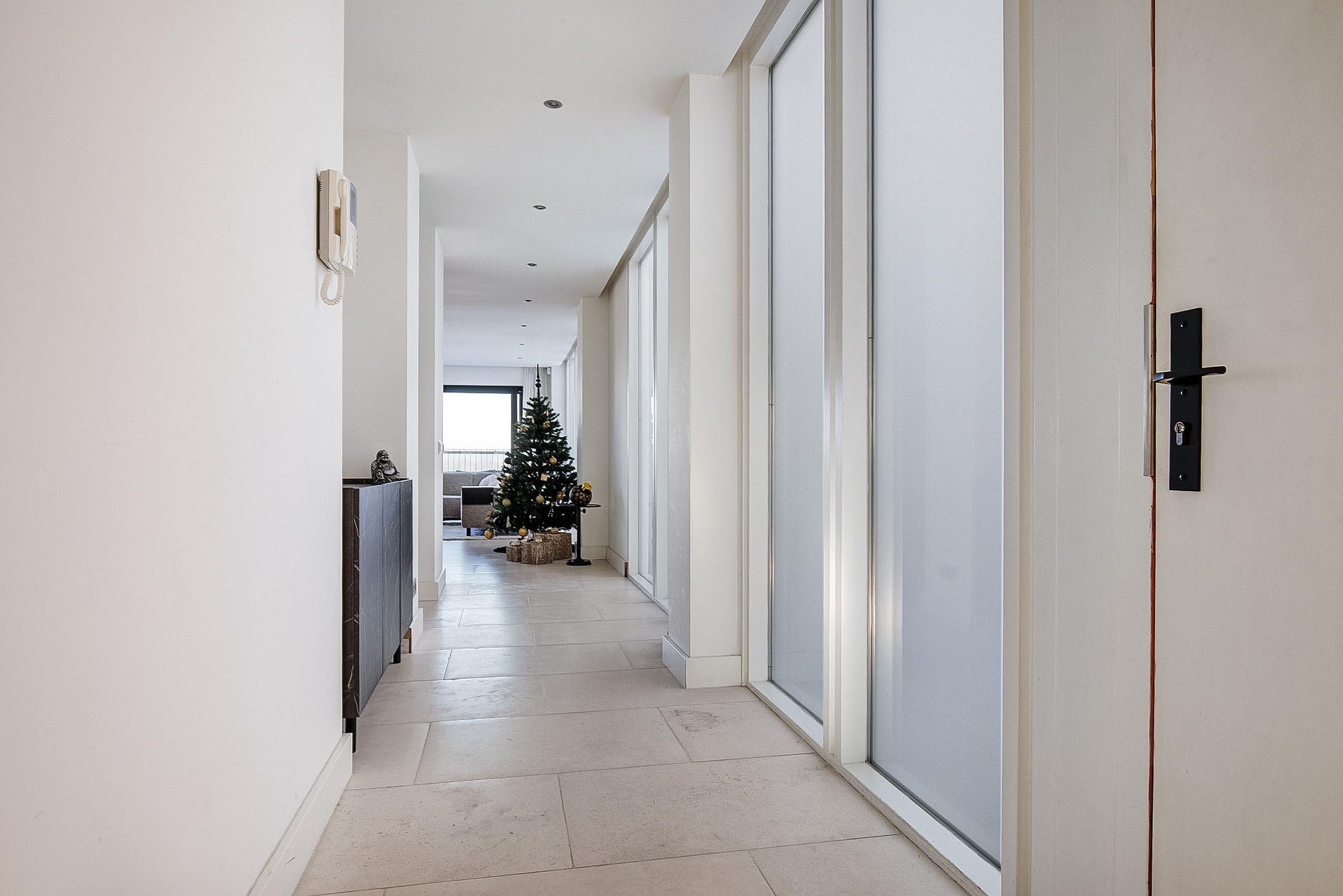 Via de entree van het appartement stapt u binnen in een riante hal, die op stijlvolle wijze toegang biedt tot alle vertrekken. In de hal bevinden zich tevens een luxe separaat toilet, evenals een bergruimte waar de technische installaties en de wasmachine-opstelling zijn ondergebracht.