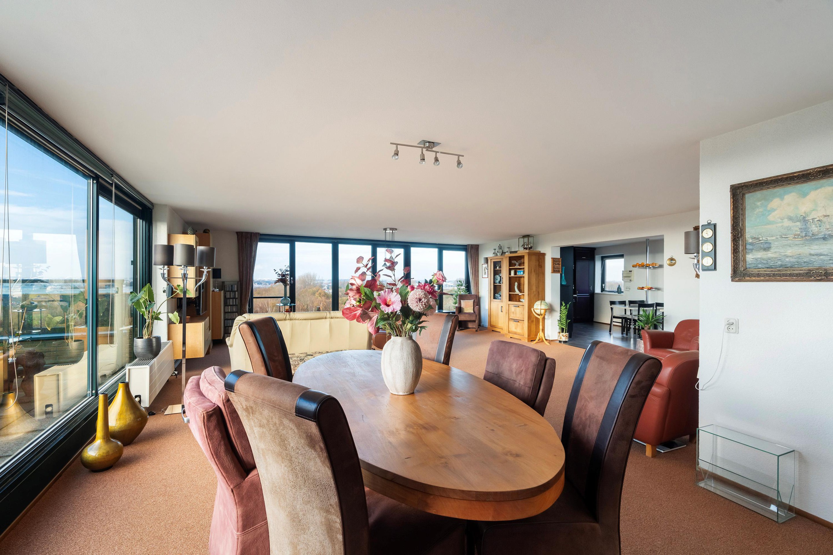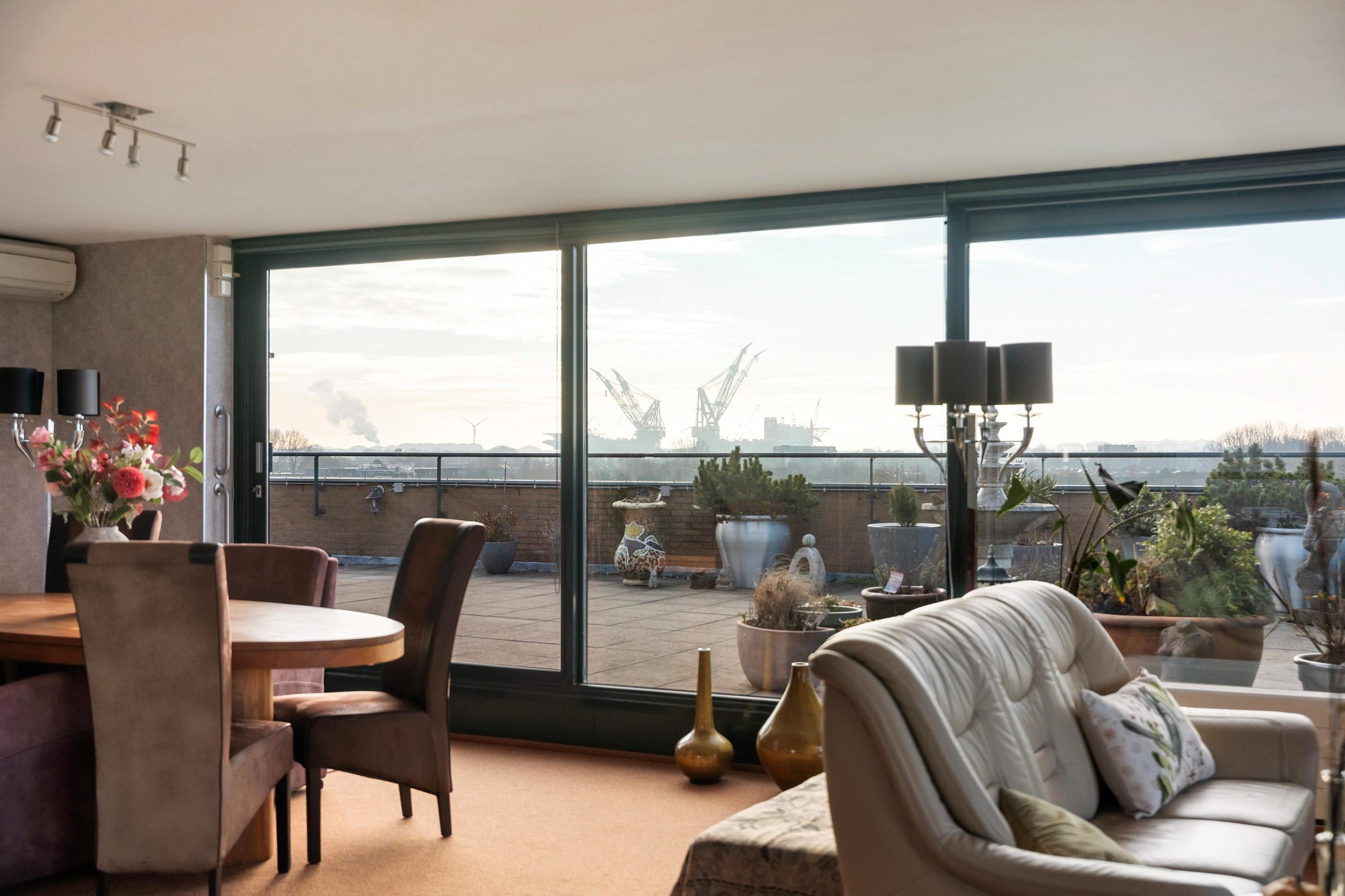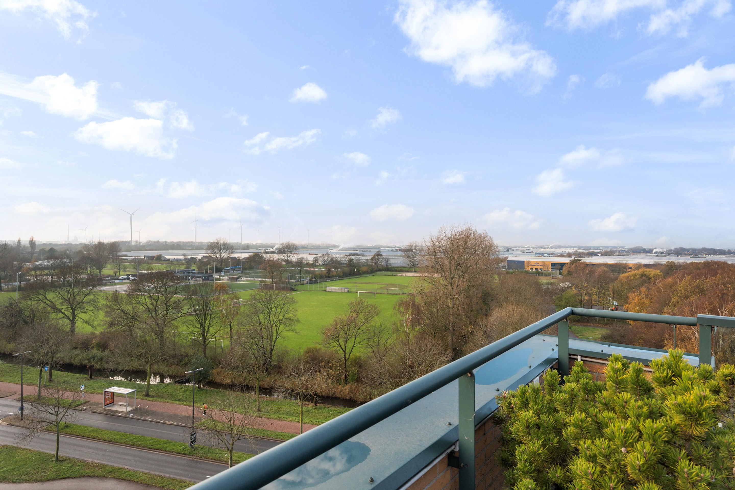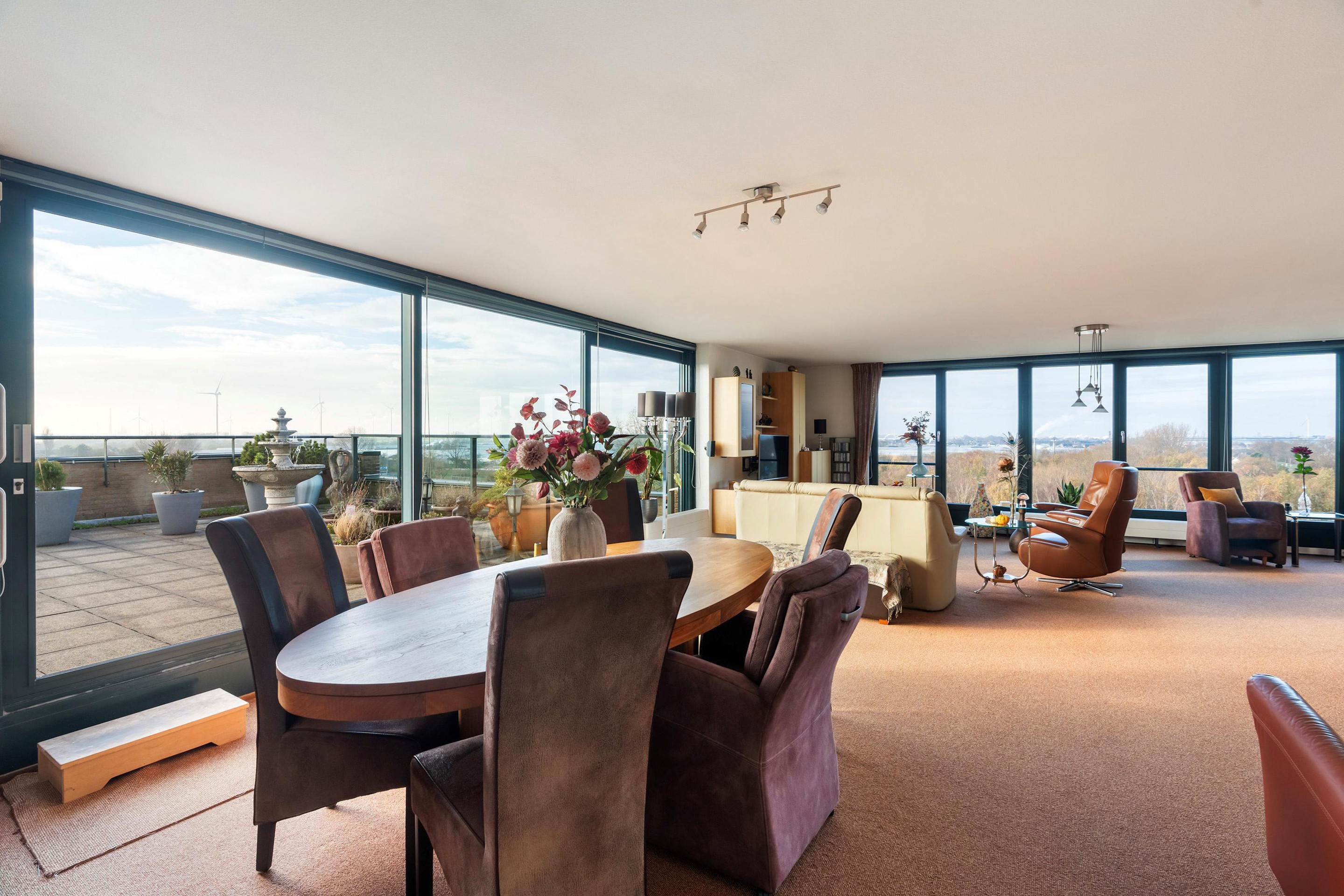 Grote raampartijen aan de voorzijde zorgen voor veel licht en bieden een vrij uitzicht richting het Westland. Aan de terraszijde kijk je uit over de Waterweg, waar voorbijvarende schepen en het wisselende licht zorgen voor een levendig panorama. Aan de zijde van de keuken strekt het uitzicht zich uit richting Wilgenrijk en verder, wat deze leefruimte een bijzonder ruimtelijk en open karakter geeft.