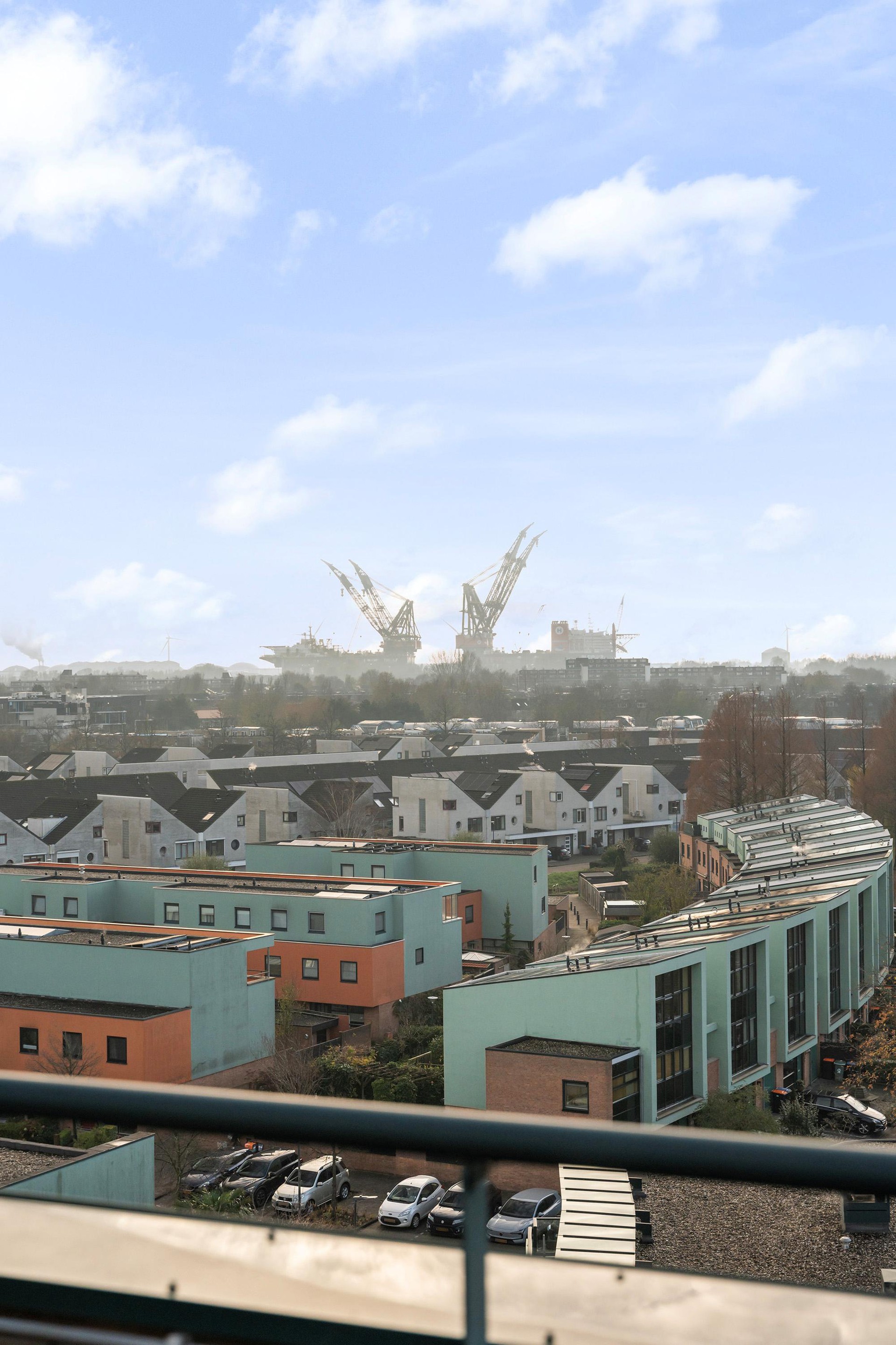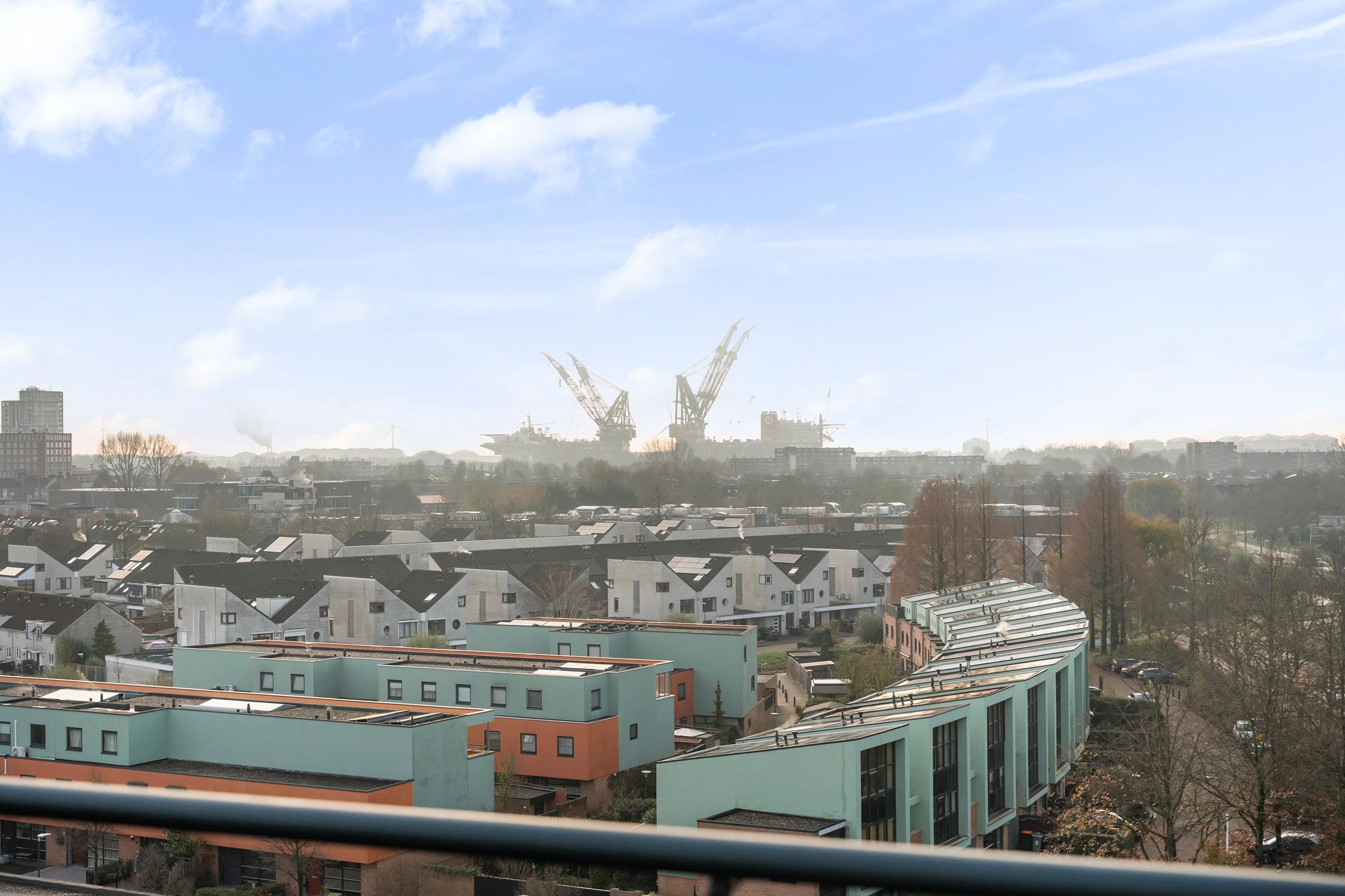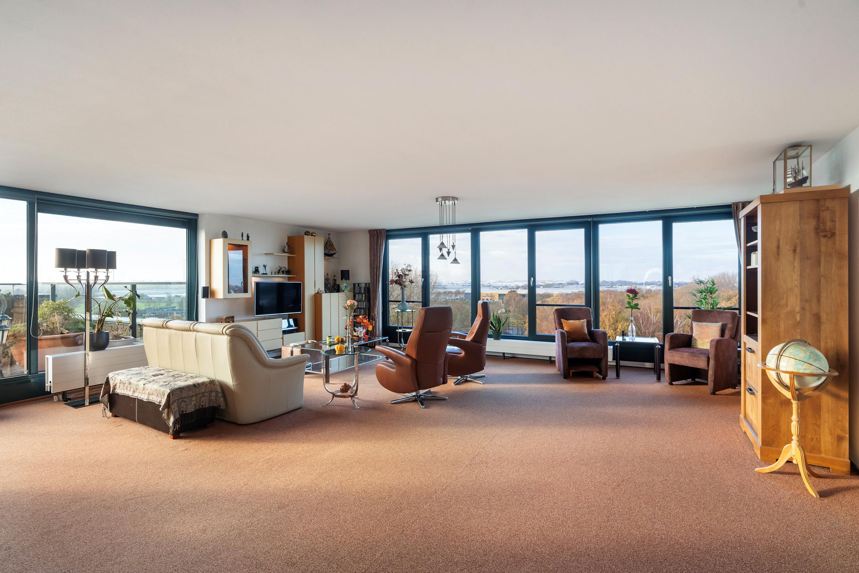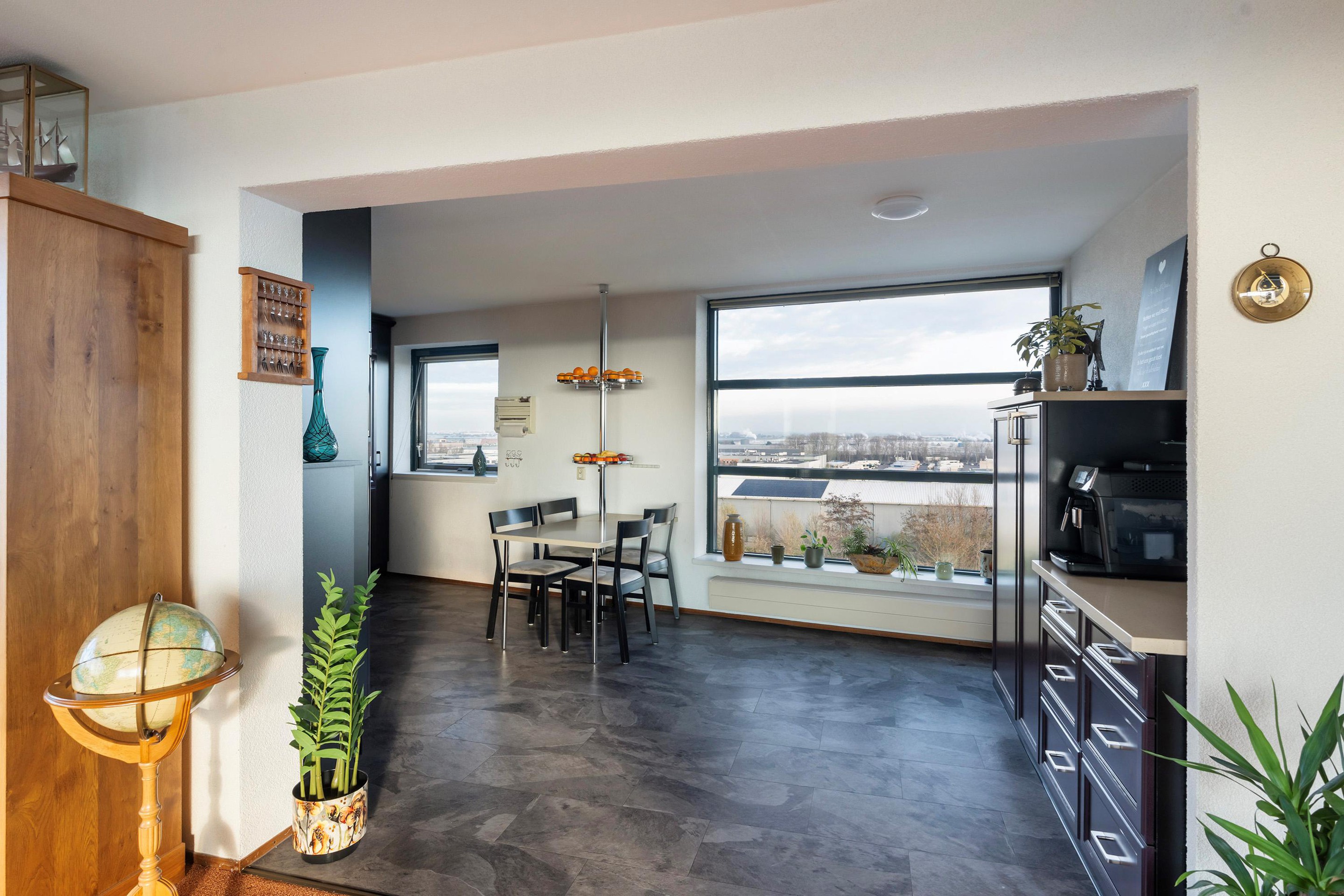 Grote raampartijen aan de voorzijde zorgen voor veel licht en bieden een vrij uitzicht richting het Westland. Aan de terraszijde kijk je uit over de Waterweg, waar voorbijvarende schepen en het wisselende licht zorgen voor een levendig panorama. Aan de zijde van de keuken strekt het uitzicht zich uit richting Wilgenrijk en verder, wat deze leefruimte een bijzonder ruimtelijk en open karakter geeft.