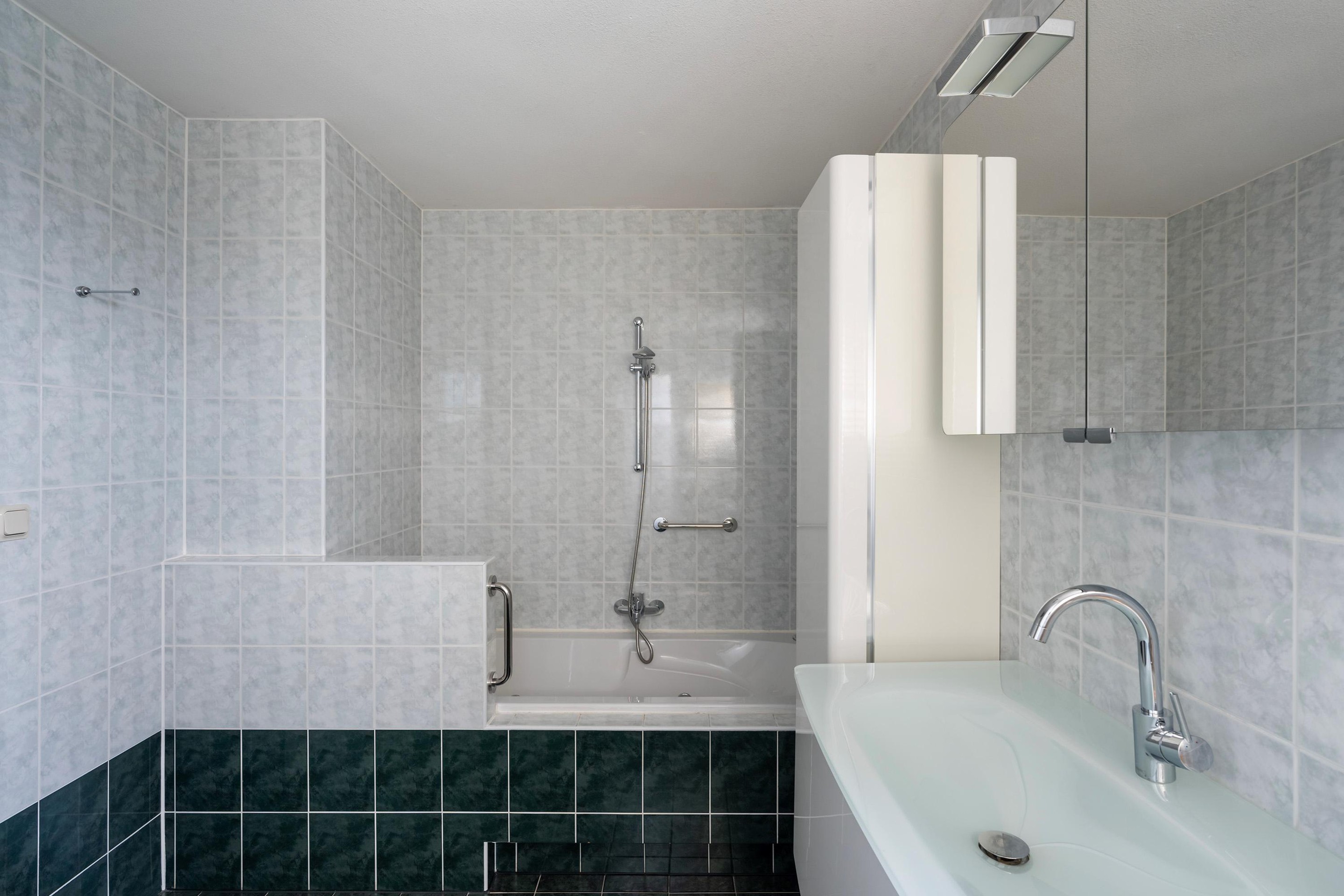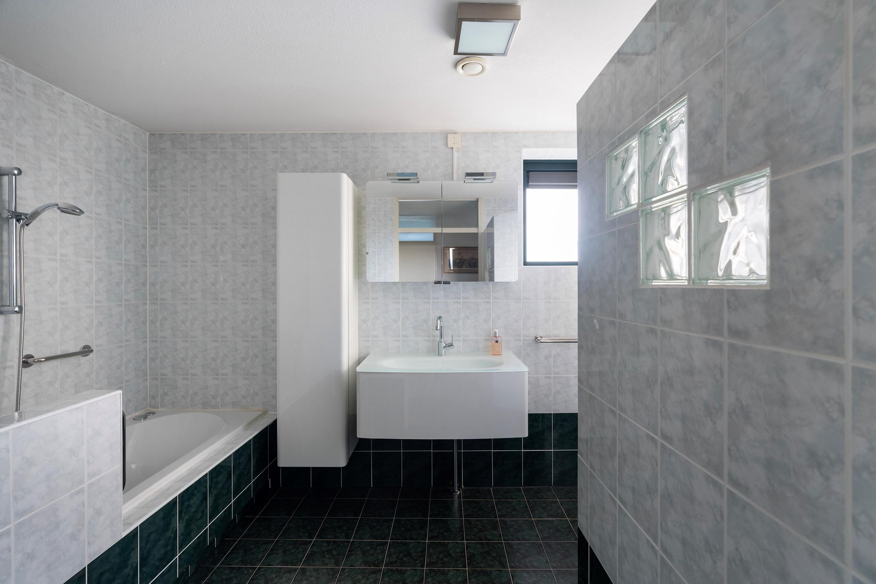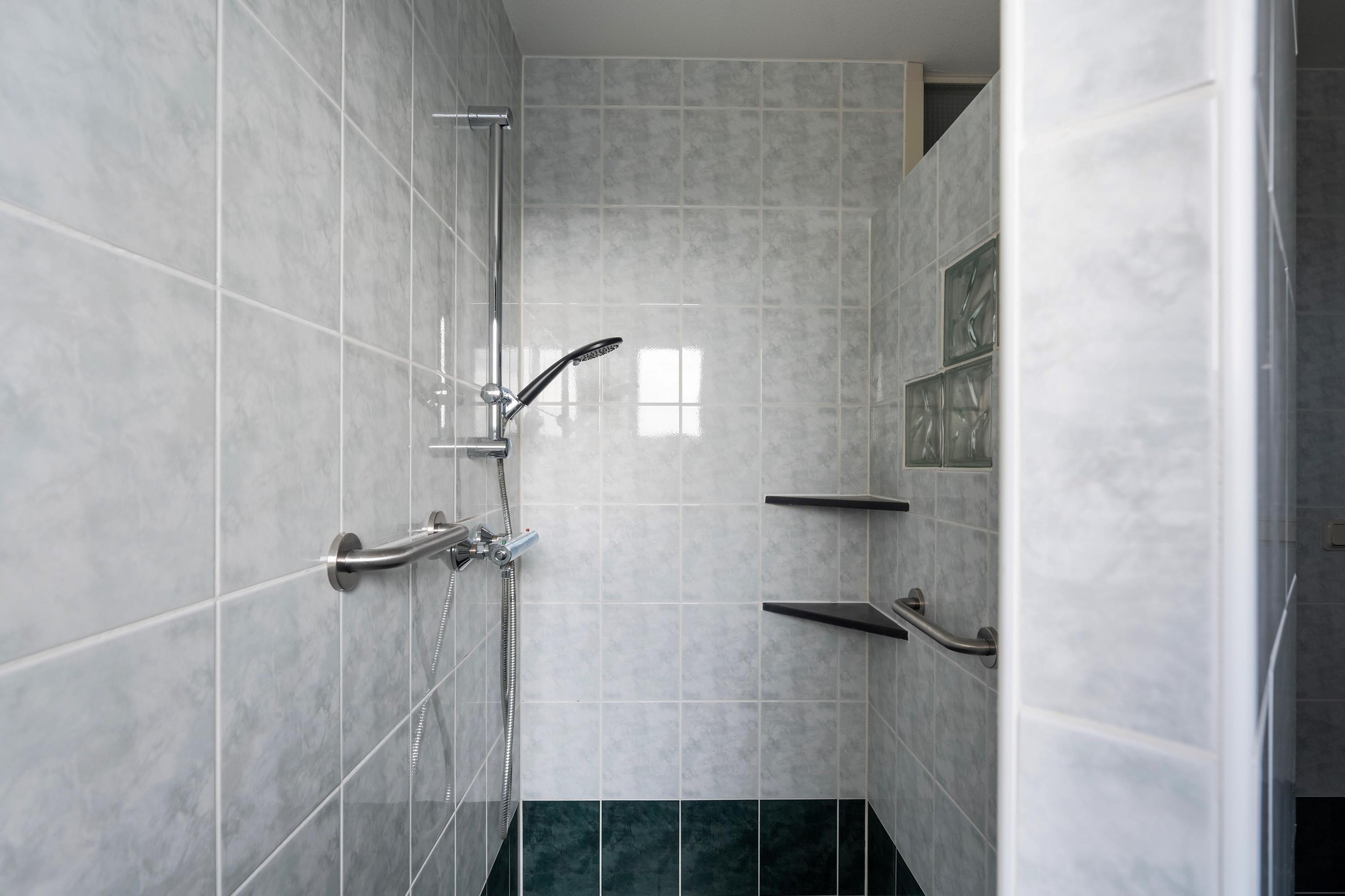 Aan de linkerzijde van de hal bevindt zich de tweede badkamer: een plek om echt te ontspannen. Neem een warm bubbelbad na een lange dag of start de ochtend fris onder de ruime inloopdouche.
