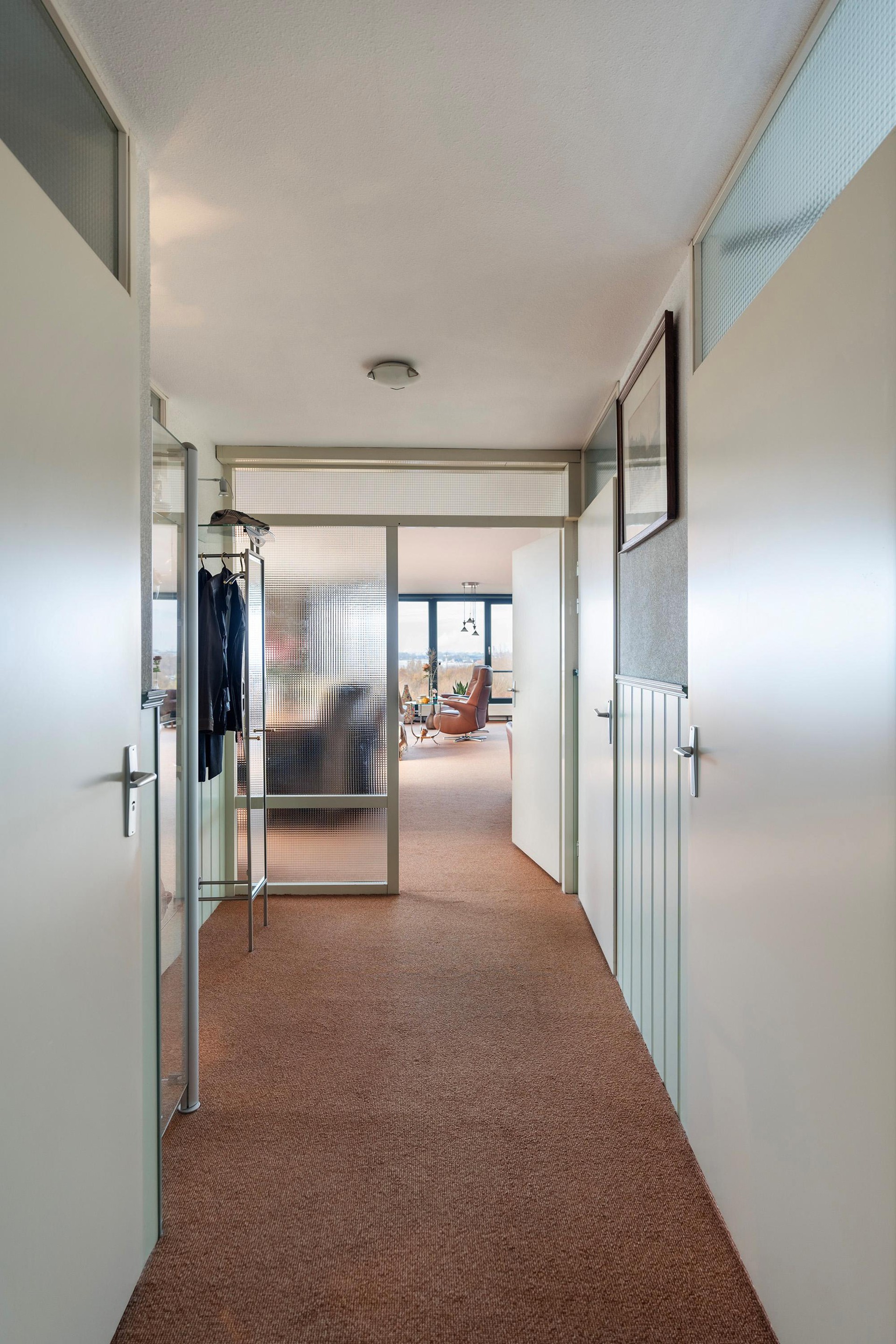 Zodra je de woning binnenstapt, valt de rust op. De lange, lichte hal vormt het hart van het appartement en verbindt alle vertrekken. De indeling is logisch, ruimtelijk en biedt veel privacy.