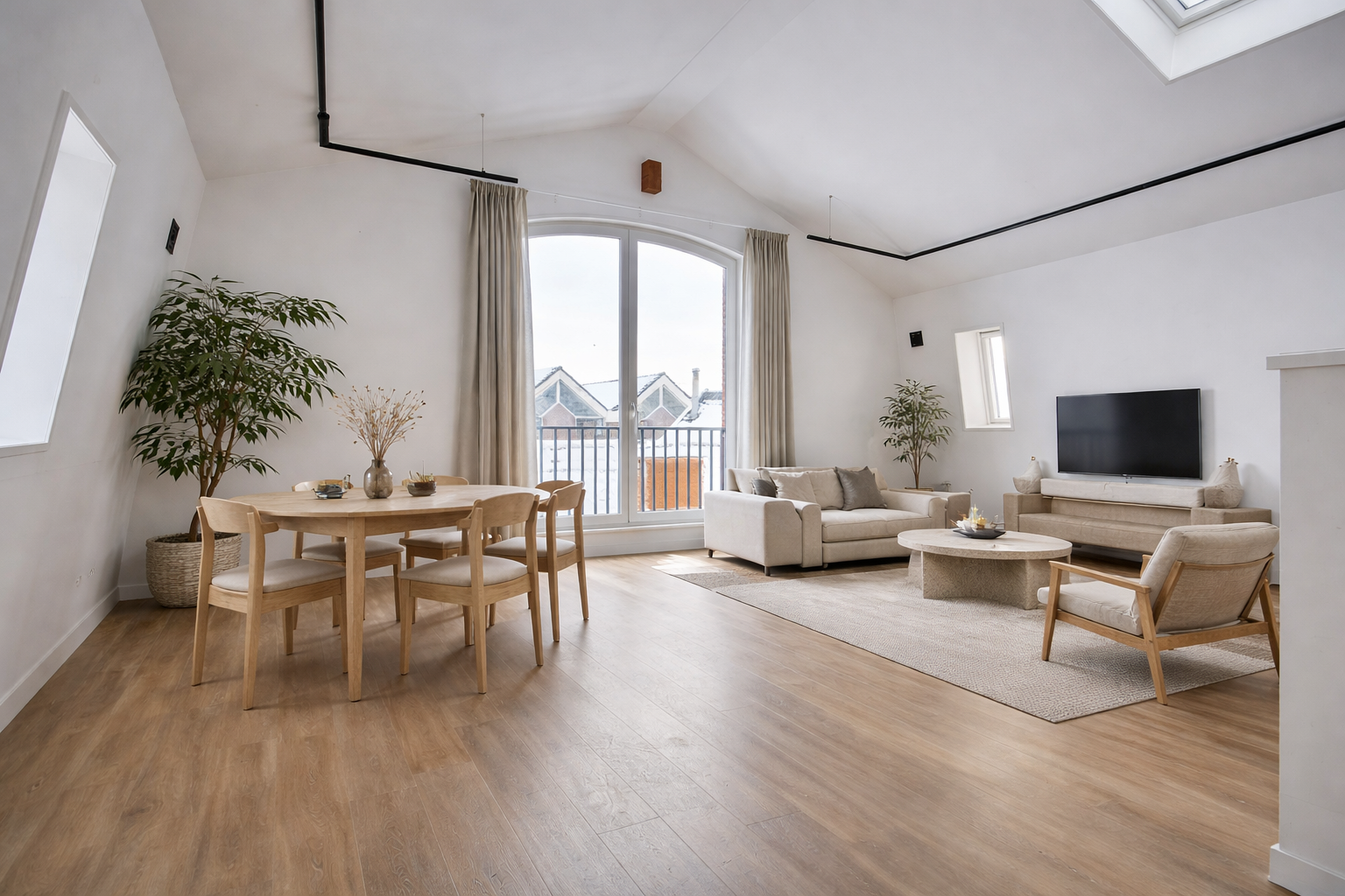 De royale woonkamer vormt het warme hart van het appartement en staat in open verbinding met de keuken. Hierdoor lopen wonen en koken naadloos in elkaar over en kun je optimaal genieten van beide tegelijk. Of je nu gasten ontvangt, uitgebreid kookt of ontspannen op de bank zit, alles speelt zich af in één harmonieuze leefruimte. De keuken is strak vormgegeven, praktisch ingedeeld en voorzien van moderne apparatuur, waardoor het een plek is waar functionaliteit en esthetiek perfect samenkomen.