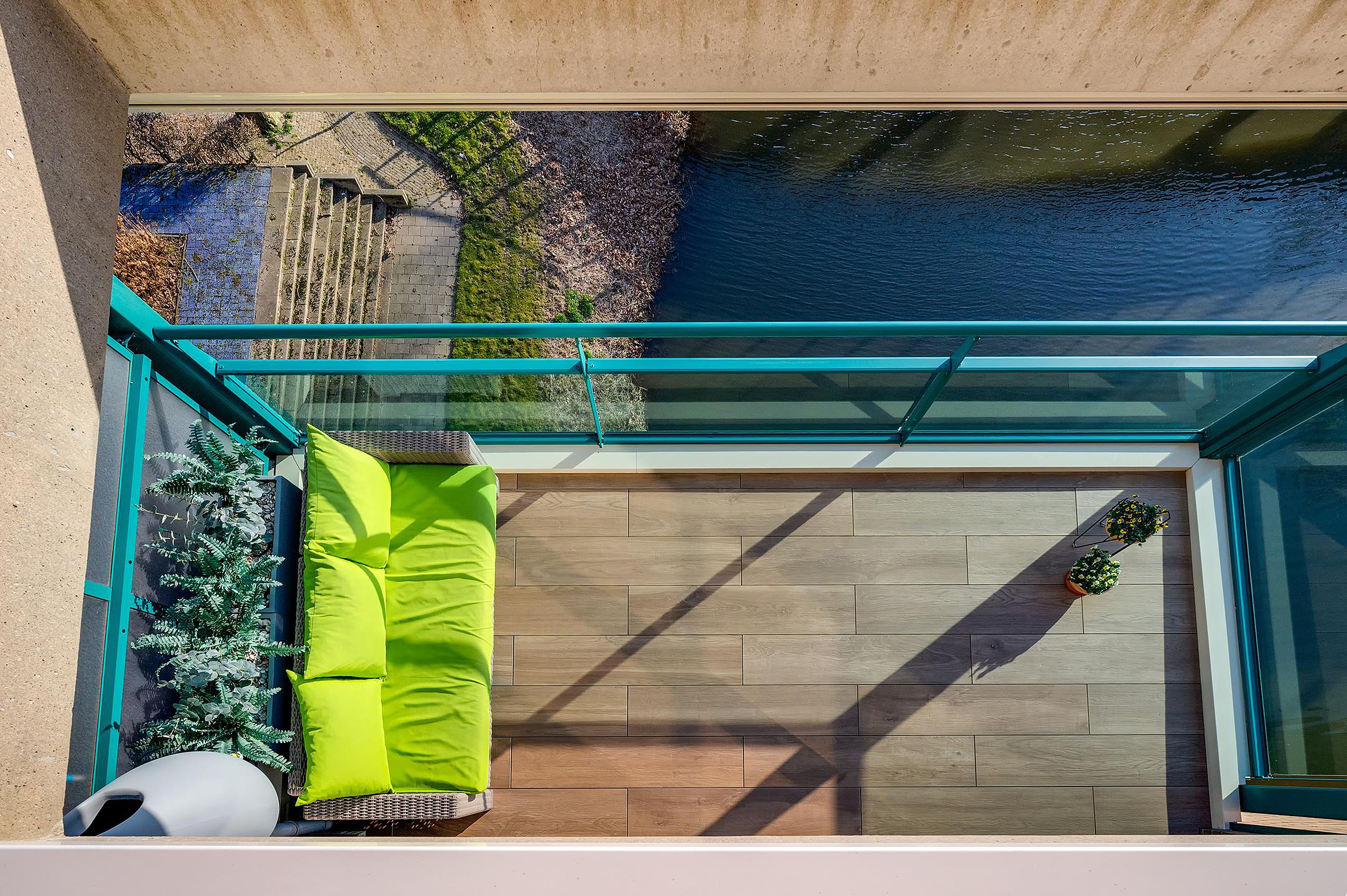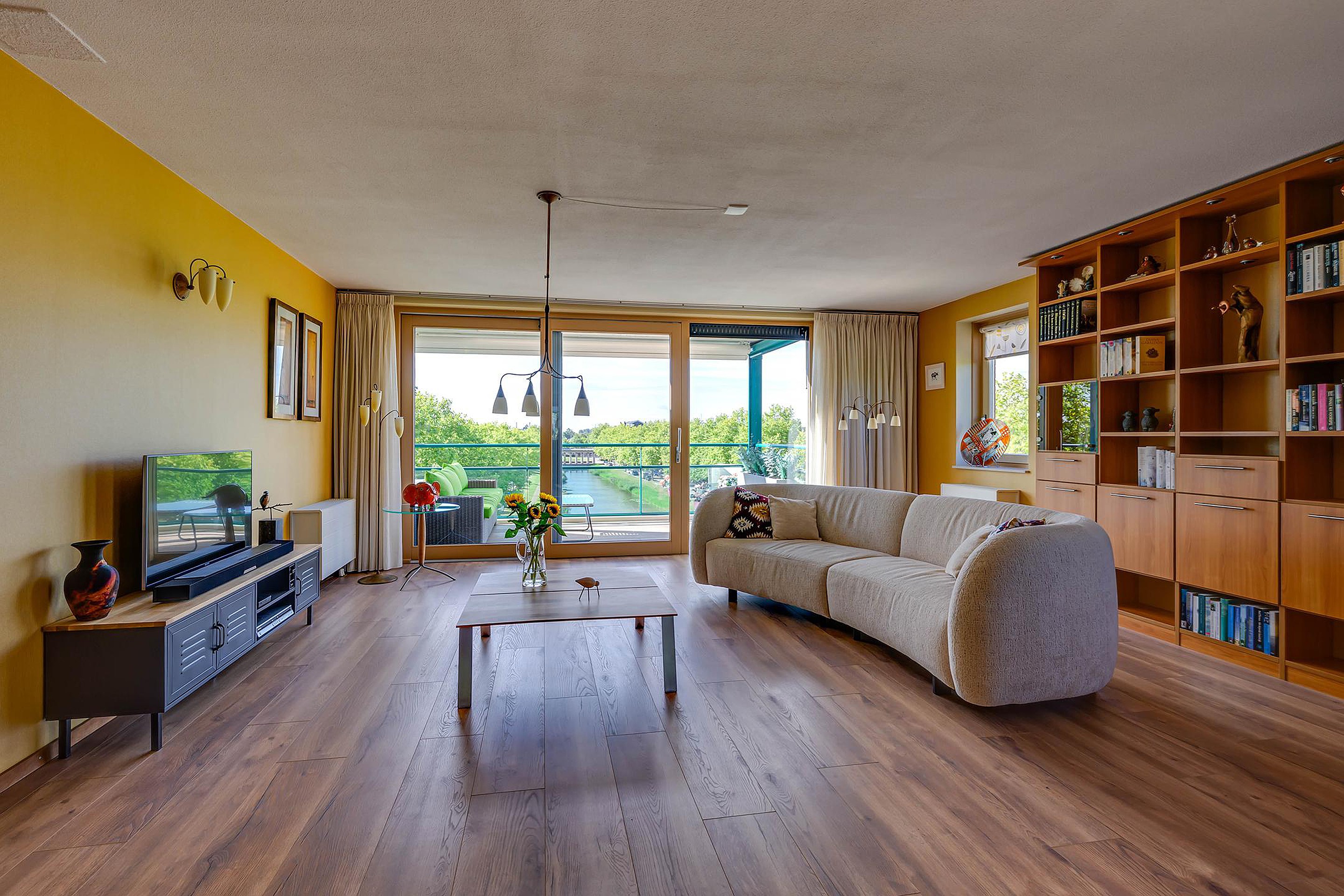De woonkamer is heerlijk licht dankzij de gevelbrede pui met schuifdeur naar het zonnige terras op het zuiden en de zijramen. Hier geniet je van volledige privacy en een weids uitzicht over groen en water. Dit voelt als een tuin, maar dan zonder onderhoud.
