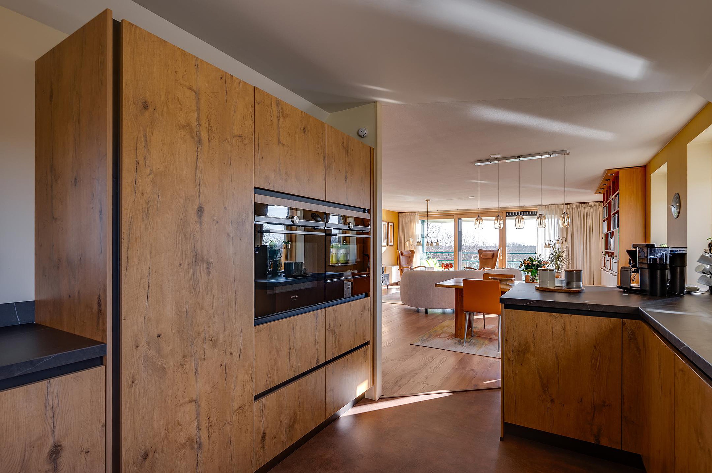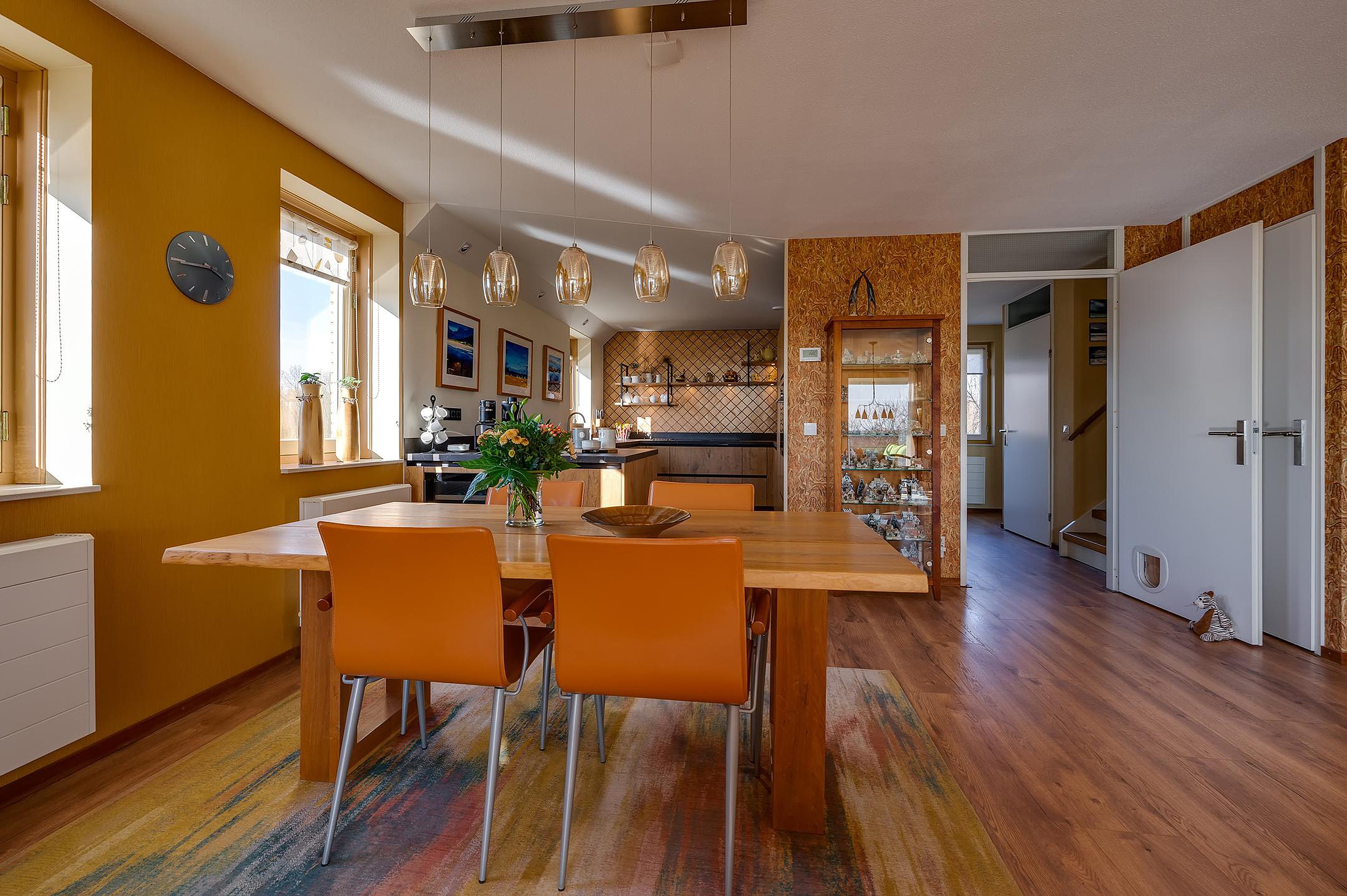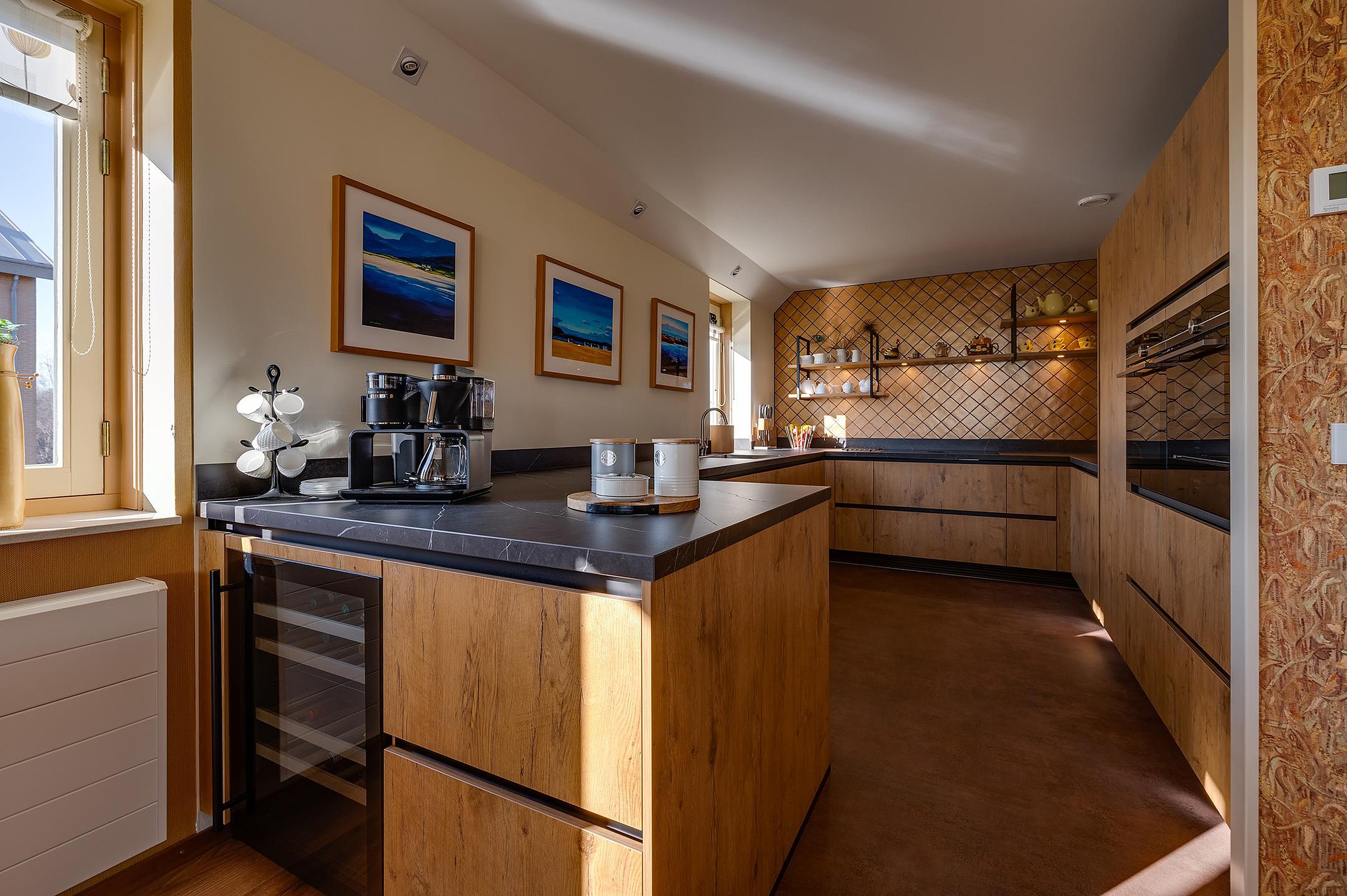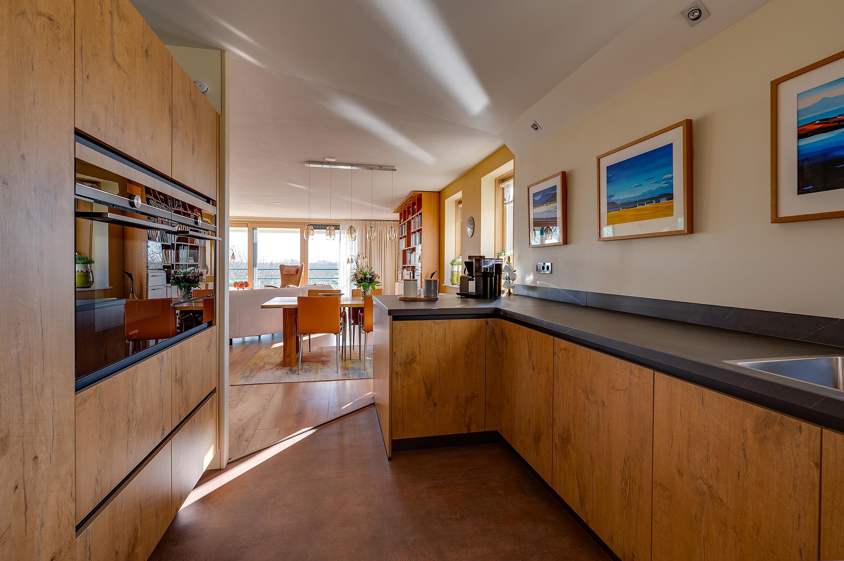 Aan de achterzijde ligt de luxe open keuken uit 2022. De greeploze houtlook kasten, het marmerlook composiet werkblad en de hoogwaardige apparatuur – waaronder combimagnetron, oven, warmhoudlade, koelkast, vriezer, vaatwasser, Bora-inductiekookplaat, wijnkoelkast en boiler – geven de ruimte een hotel-chique uitstraling. Hier kook je met uitzicht én comfort. De gehele verdieping is strak afgewerkt en voorzien van een moderne laminaatvloer (2022).