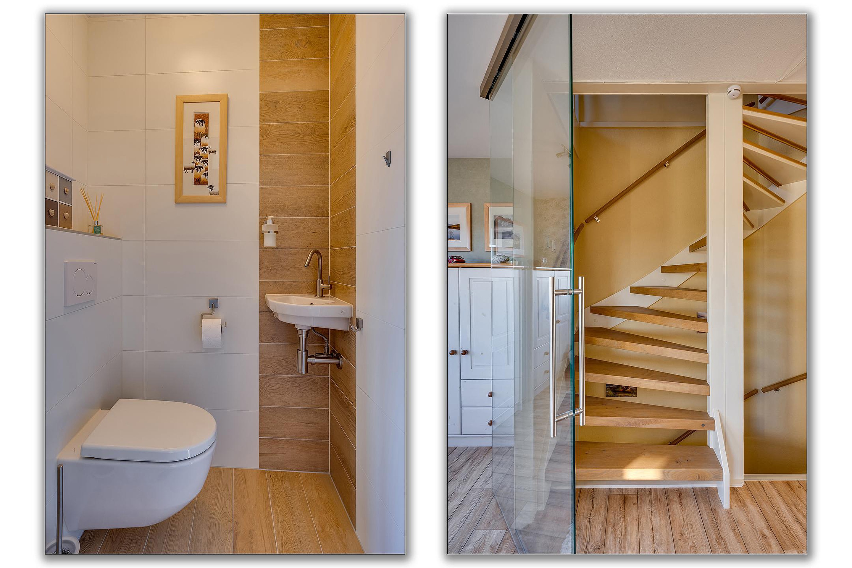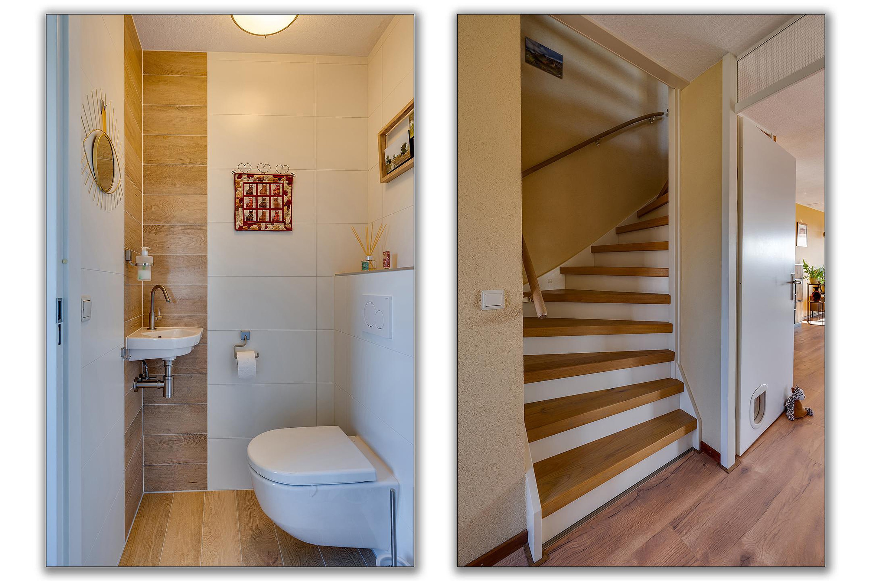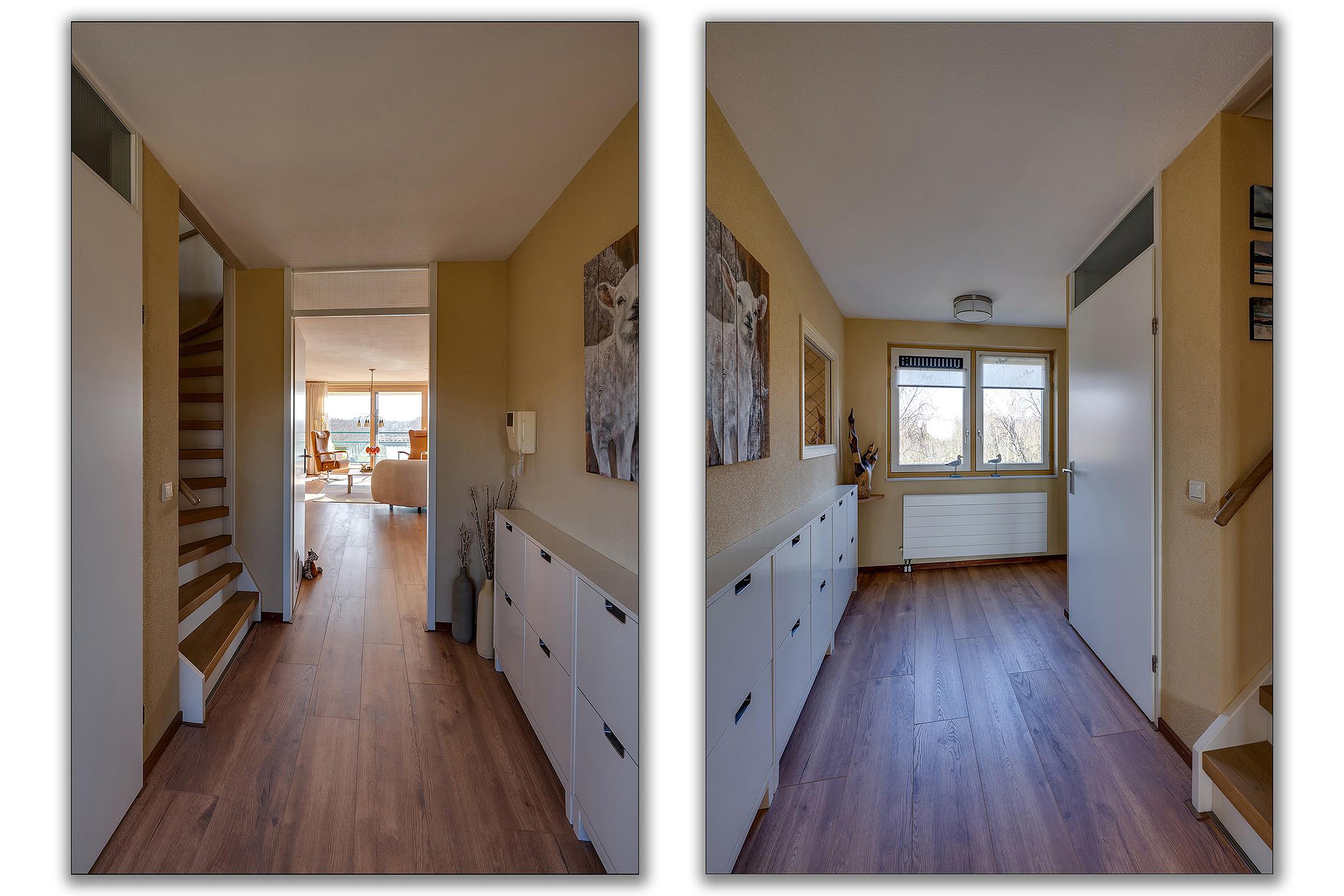 Met de lift bereik je de woonverdieping. Je stapt binnen in een royale hal met grote raampartijen en direct dat vrije uitzicht op het bos – wat een binnenkomer! Hier vind je het moderne toilet, de trap naar boven en toegang tot de woonkamer.