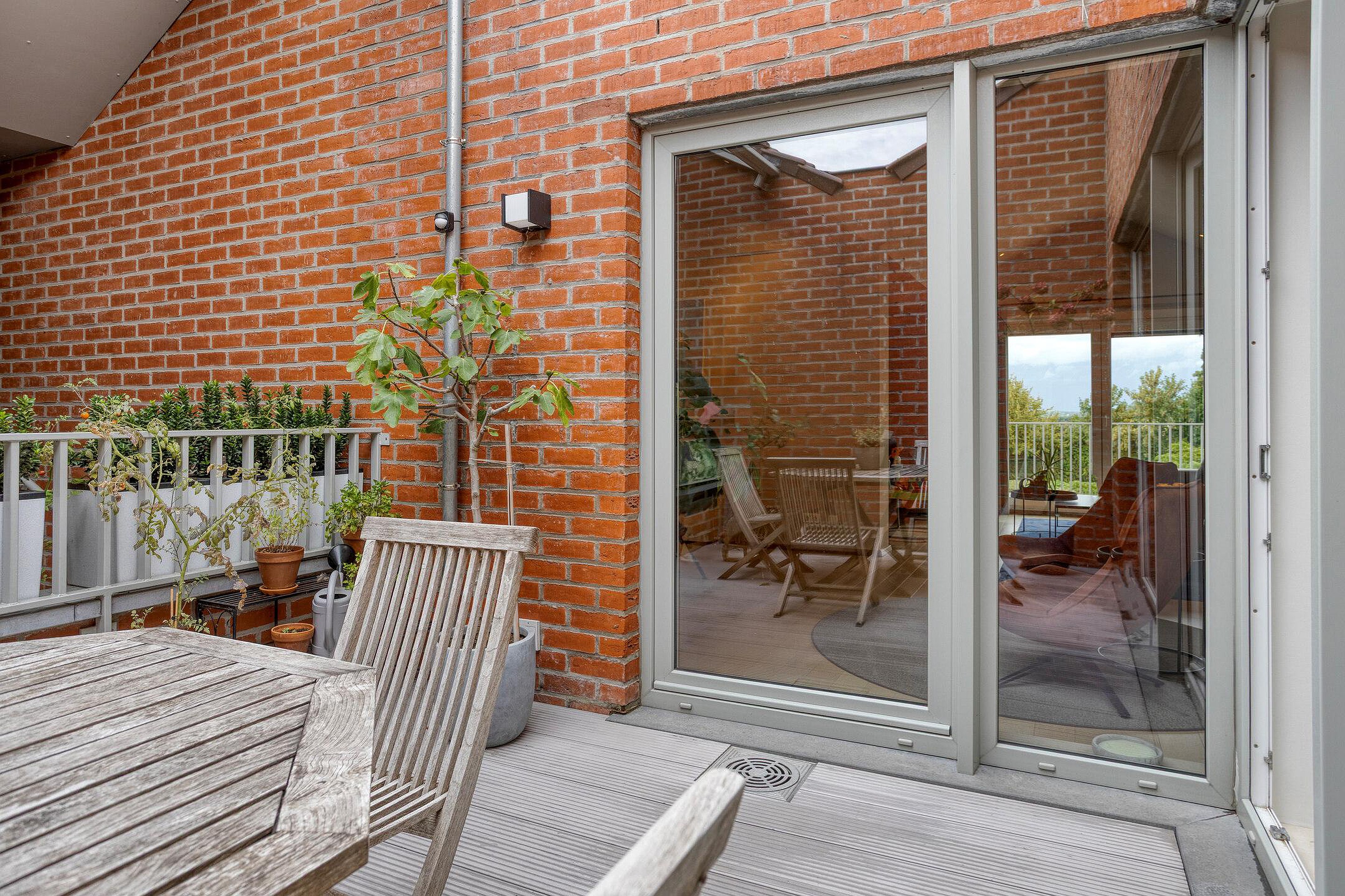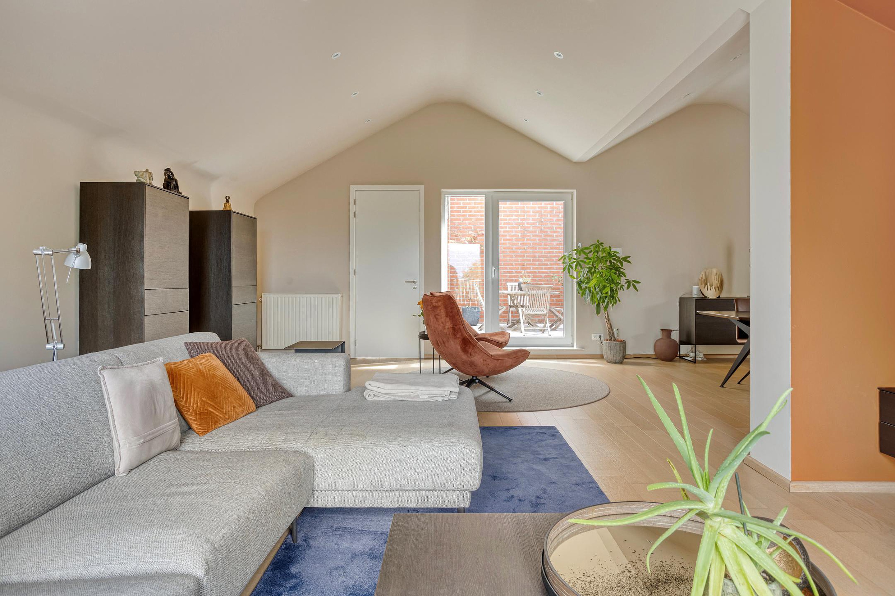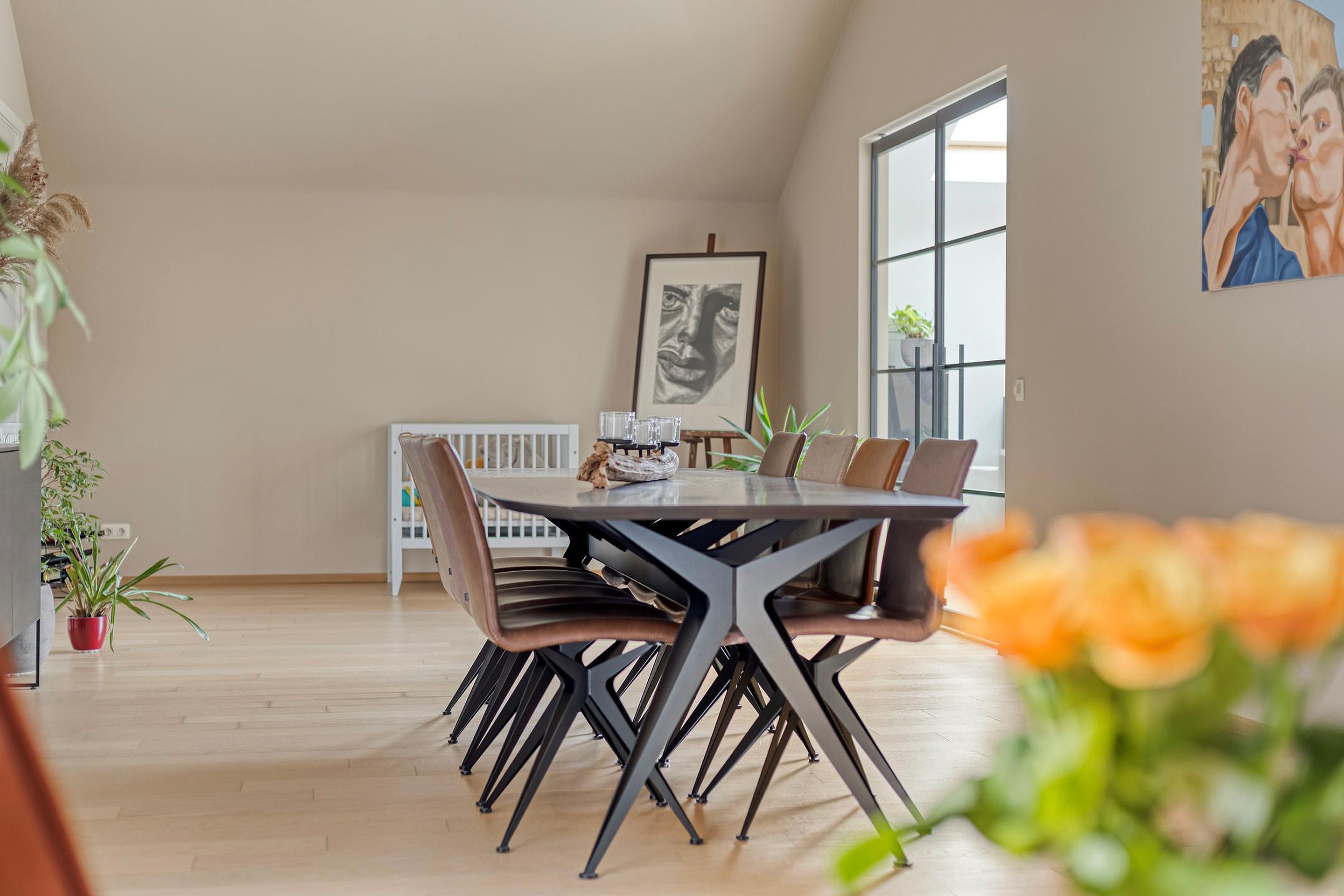 - Woonkamer & keuken: Een royale living met veel lichtinval, parketvloer en inbouwspots. De woonkamer staat in directe verbinding met het zonnige dakterras én de binnenplaats, waar u altijd beschut kunt zitten. De moderne open keuken is voorzien van hoogwaardige inbouwapparatuur zoals ceramische kookplaat, koelkast, vaatwasser en magnetron.