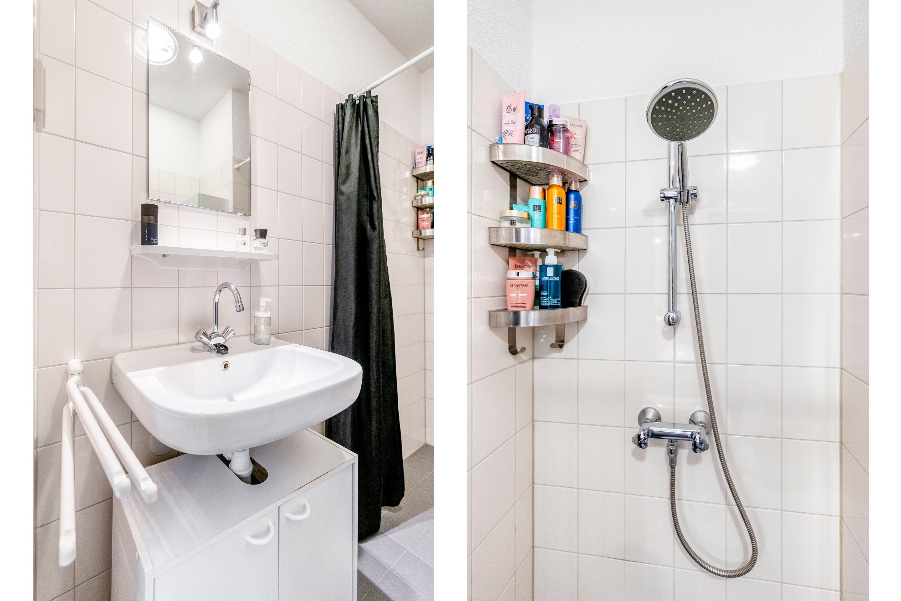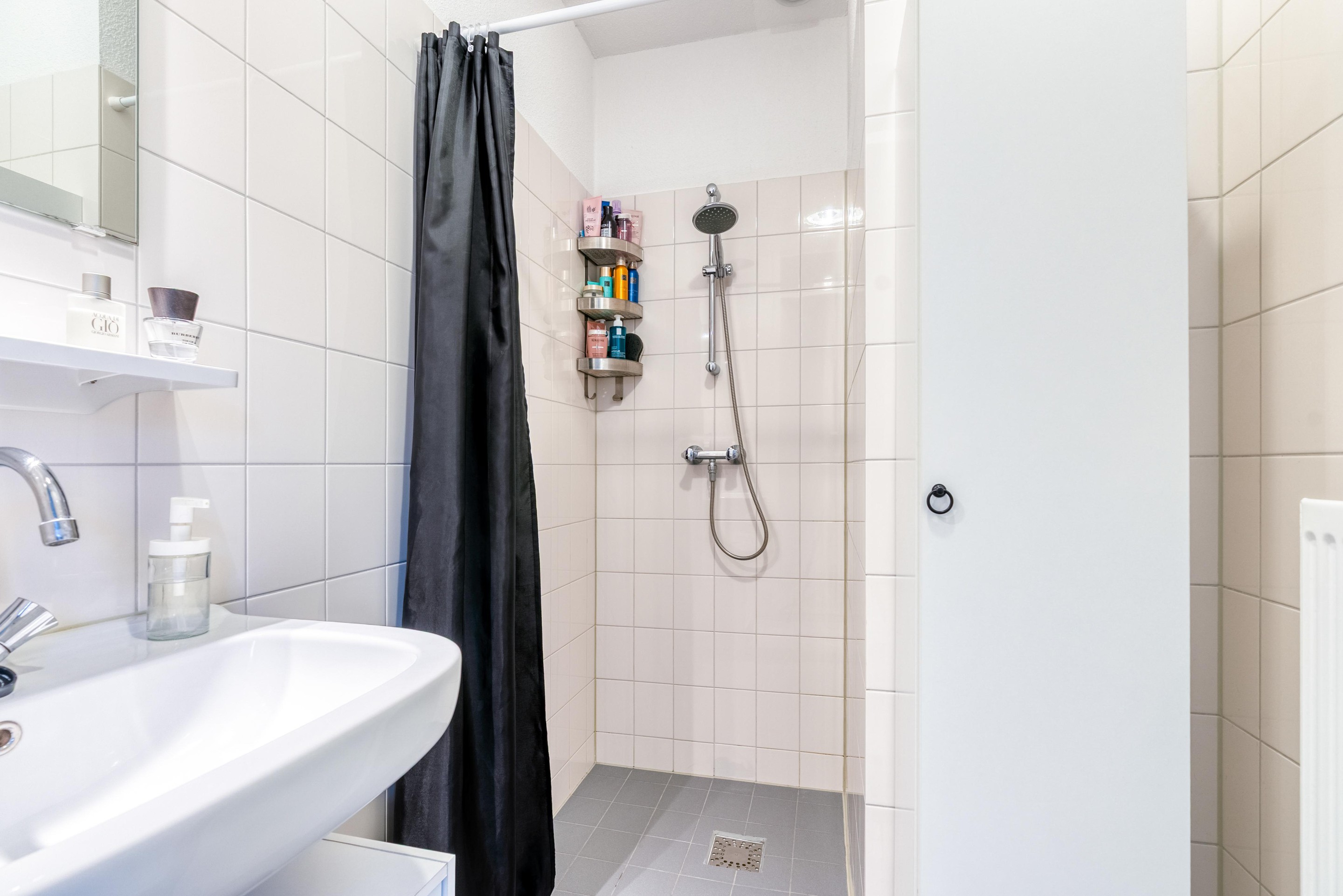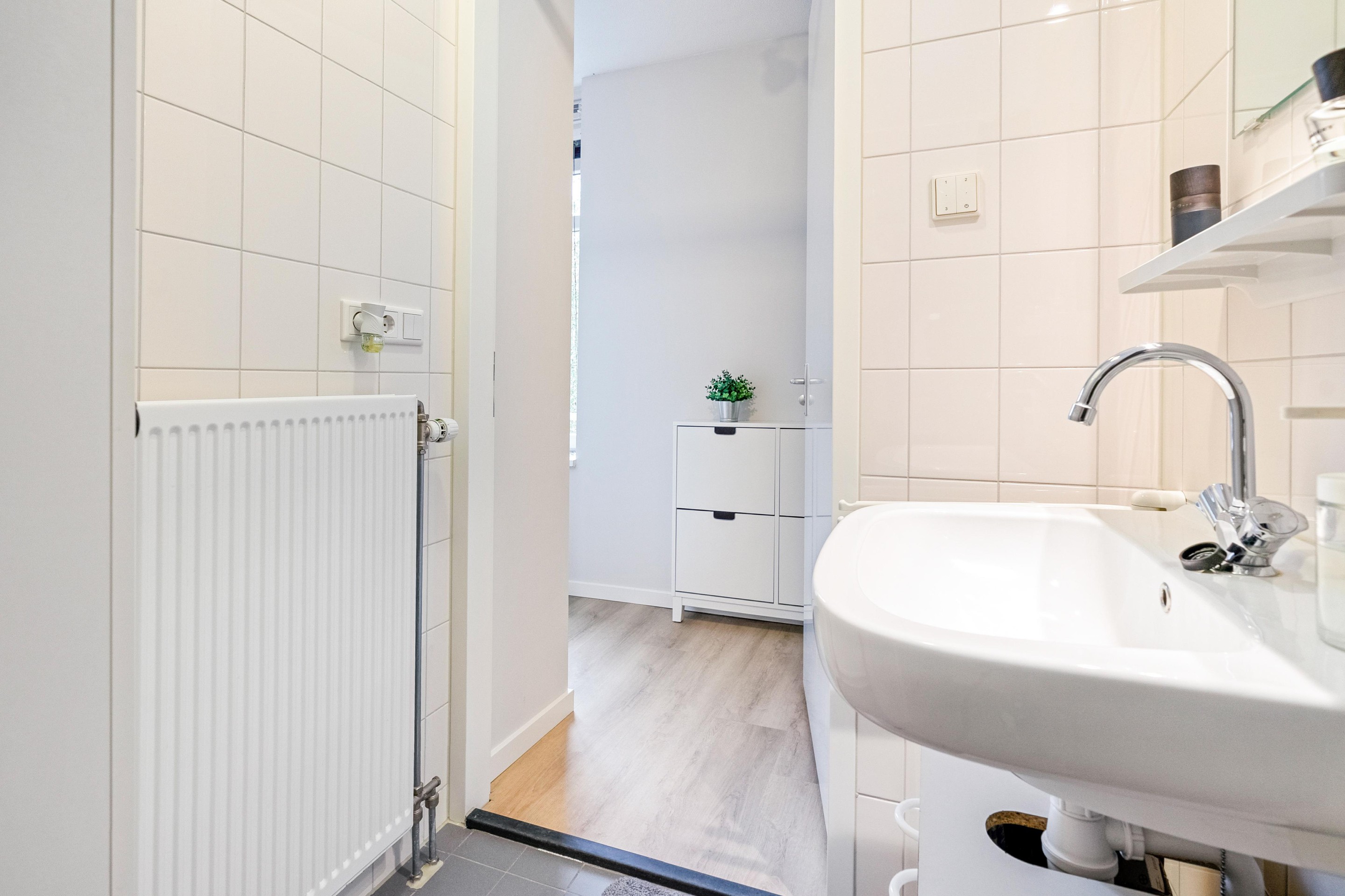 De badkamer is praktisch en voorzien van een douche en wastafel. Het toilet is separaat gelegen en bereikbaar vanuit de hal. Vanuit de hal is ook een fijne bergkast bereikbaar, hier zijn tevens de wasmachine-/drogeraansluitingen gesitueerd.