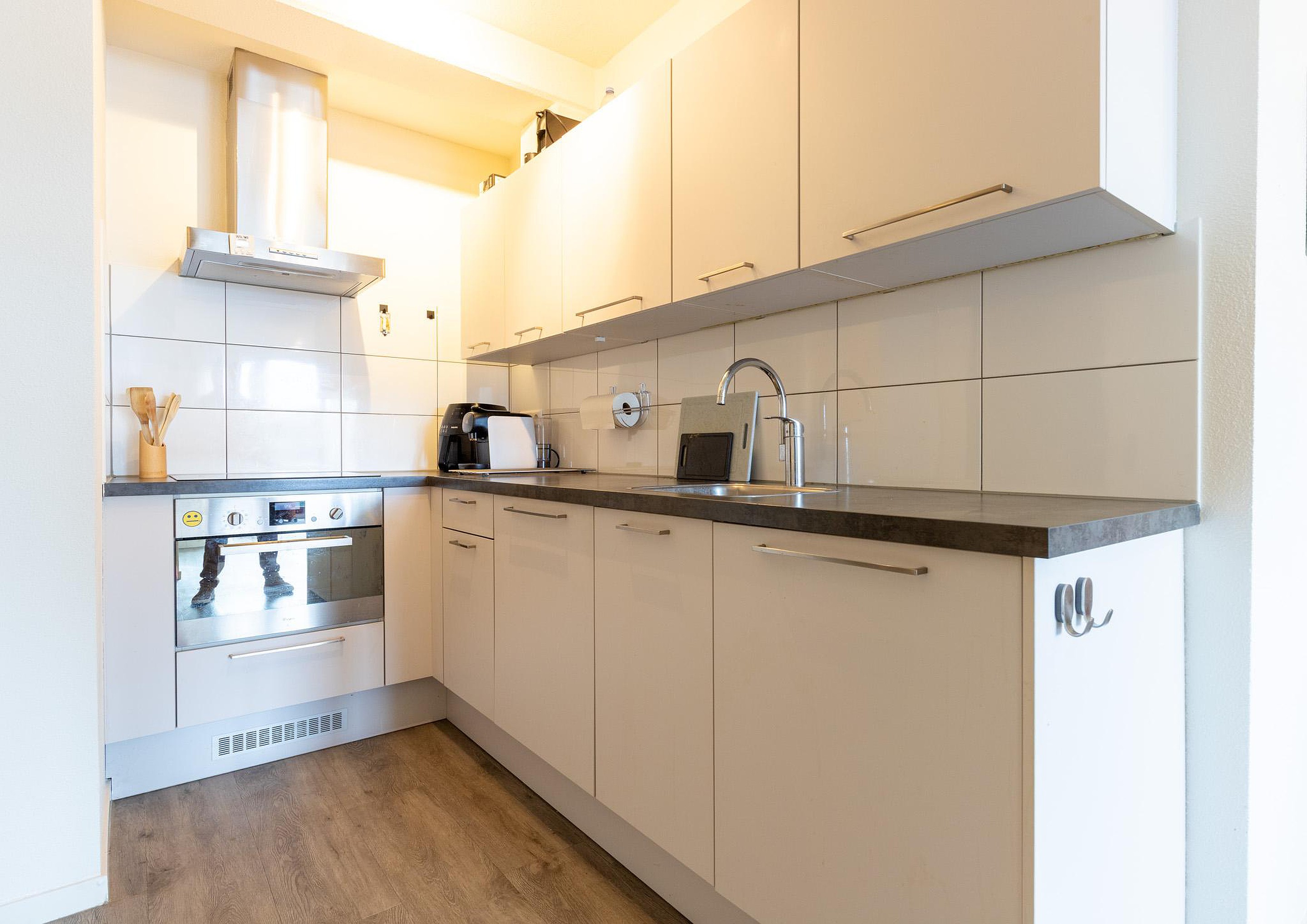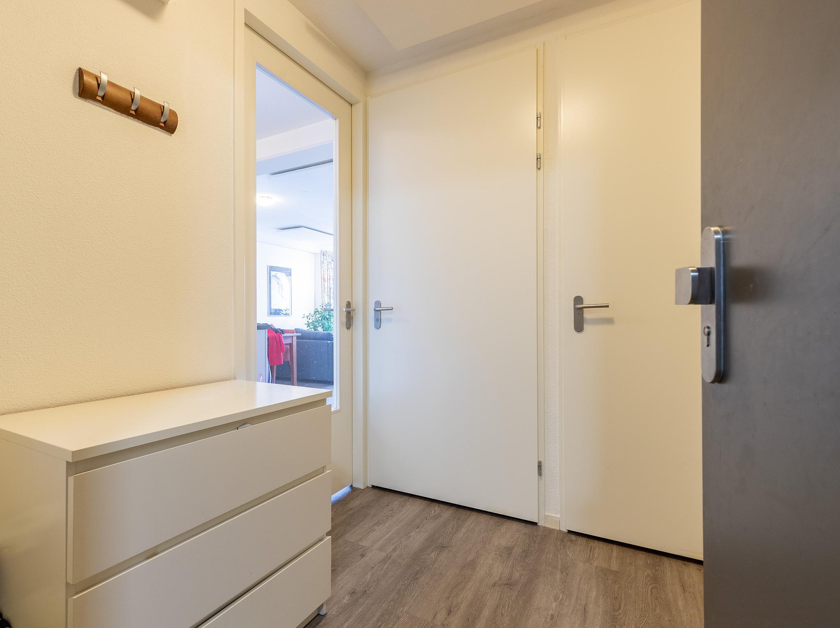 Meterkast en Entree: ruime hal met modern vrijhangend toilet. In de inpandige berging bevinden zich de aansluitingen voor de wasmachine en de boiler. Vanuit de hal bereikt u de lichte woonkamer met open keuken in L-opstelling, voorzien van diverse inbouwapparatuur. De slaapkamer is gesitueerd aan de achterzijde en biedt toegang tot de volledig betegelde badkamer, uitgerust met een wastafelmeubel en een moderne inloopdouche.