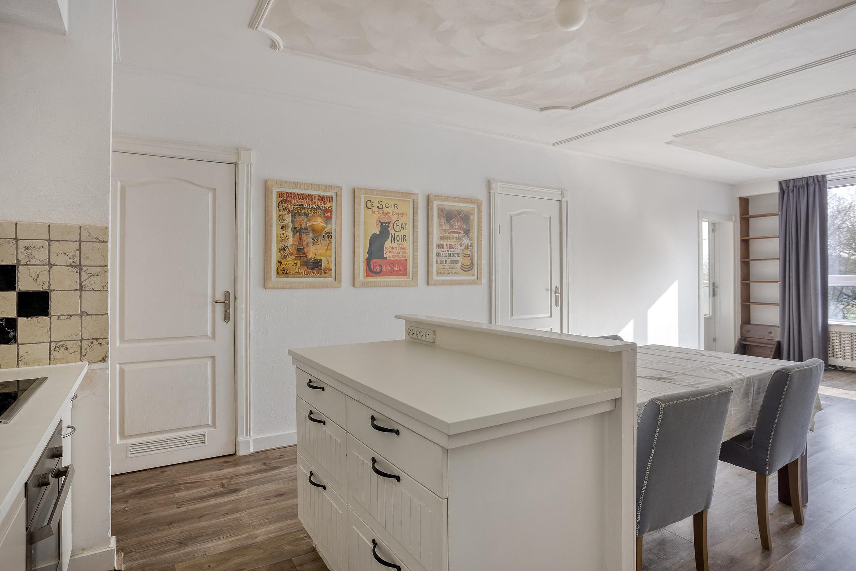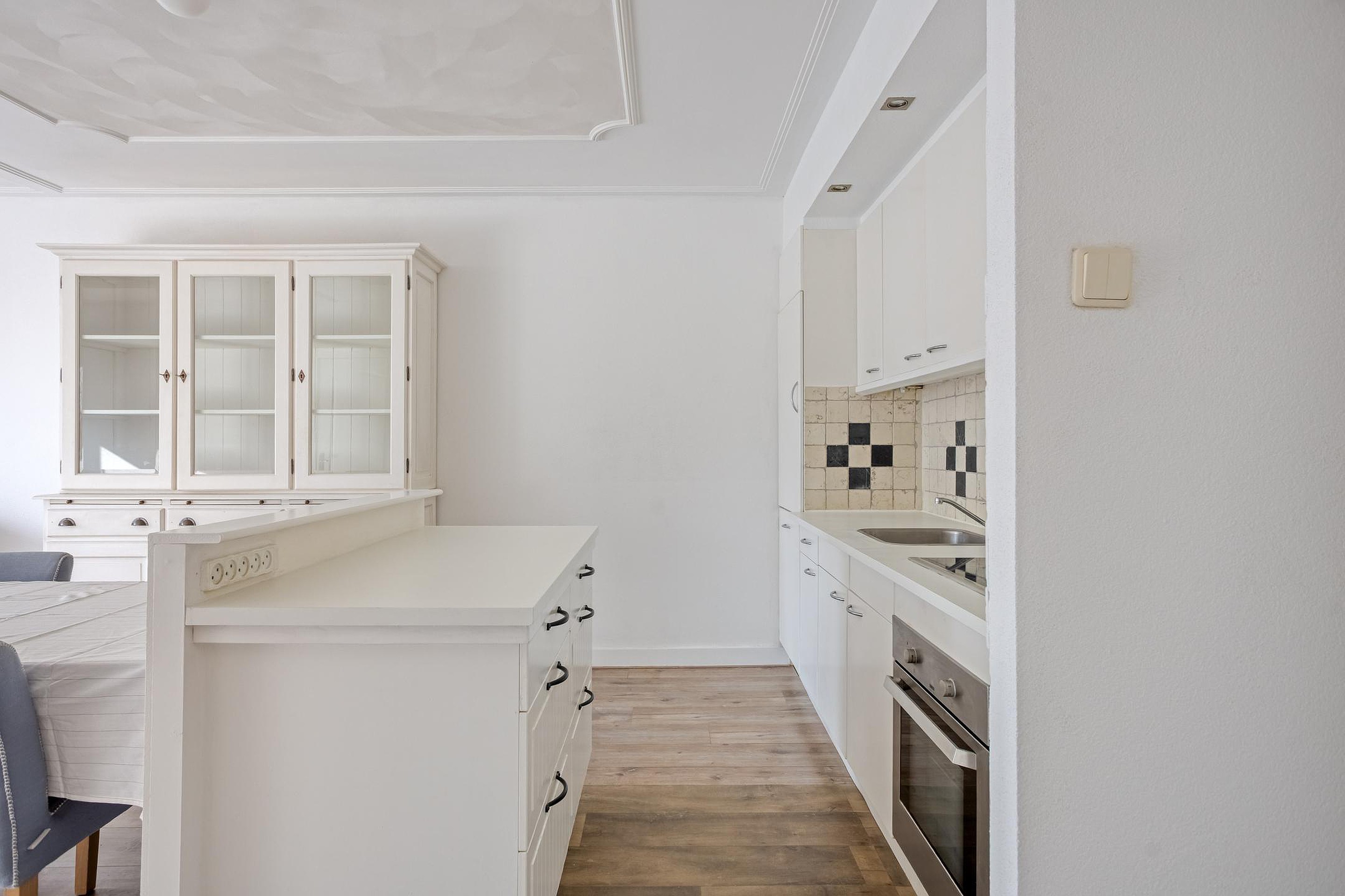 De lichte woonkamer met open keuken biedt een prettig uitzicht op het omliggende groen. De keuken is voorzien van verschillende inbouwapparatuur, waaronder een vaatwasser, koelkast en combi-magnetron.