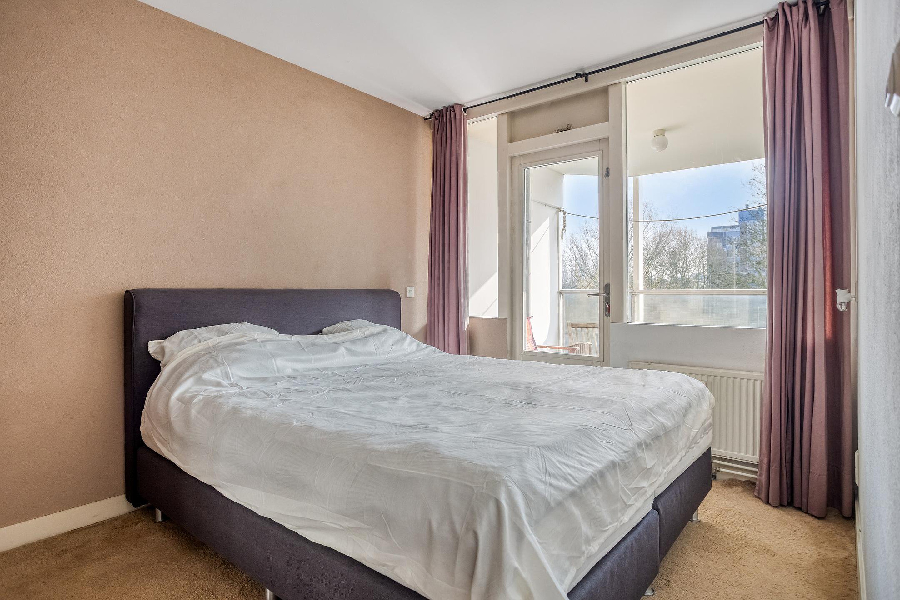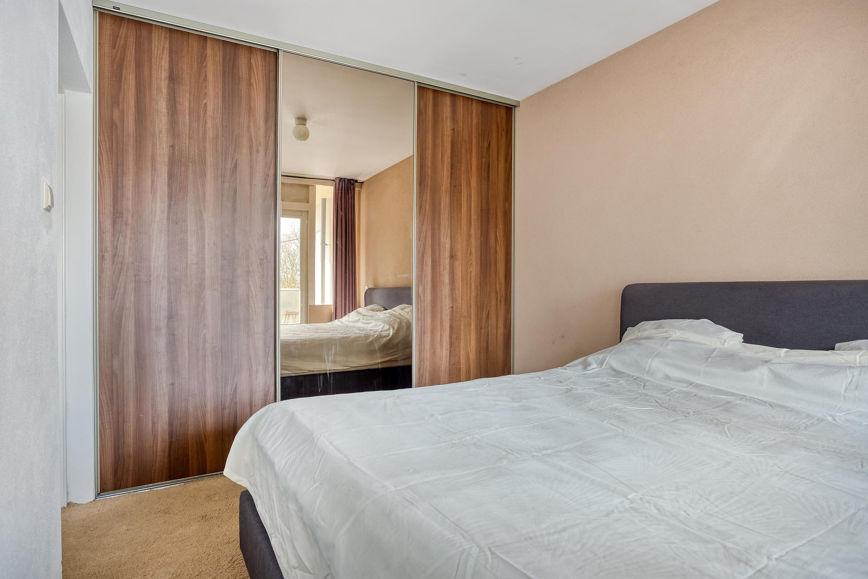 De slaapkamer beschikt over een praktische inbouwkast en biedt eveneens toegang tot het balkon.