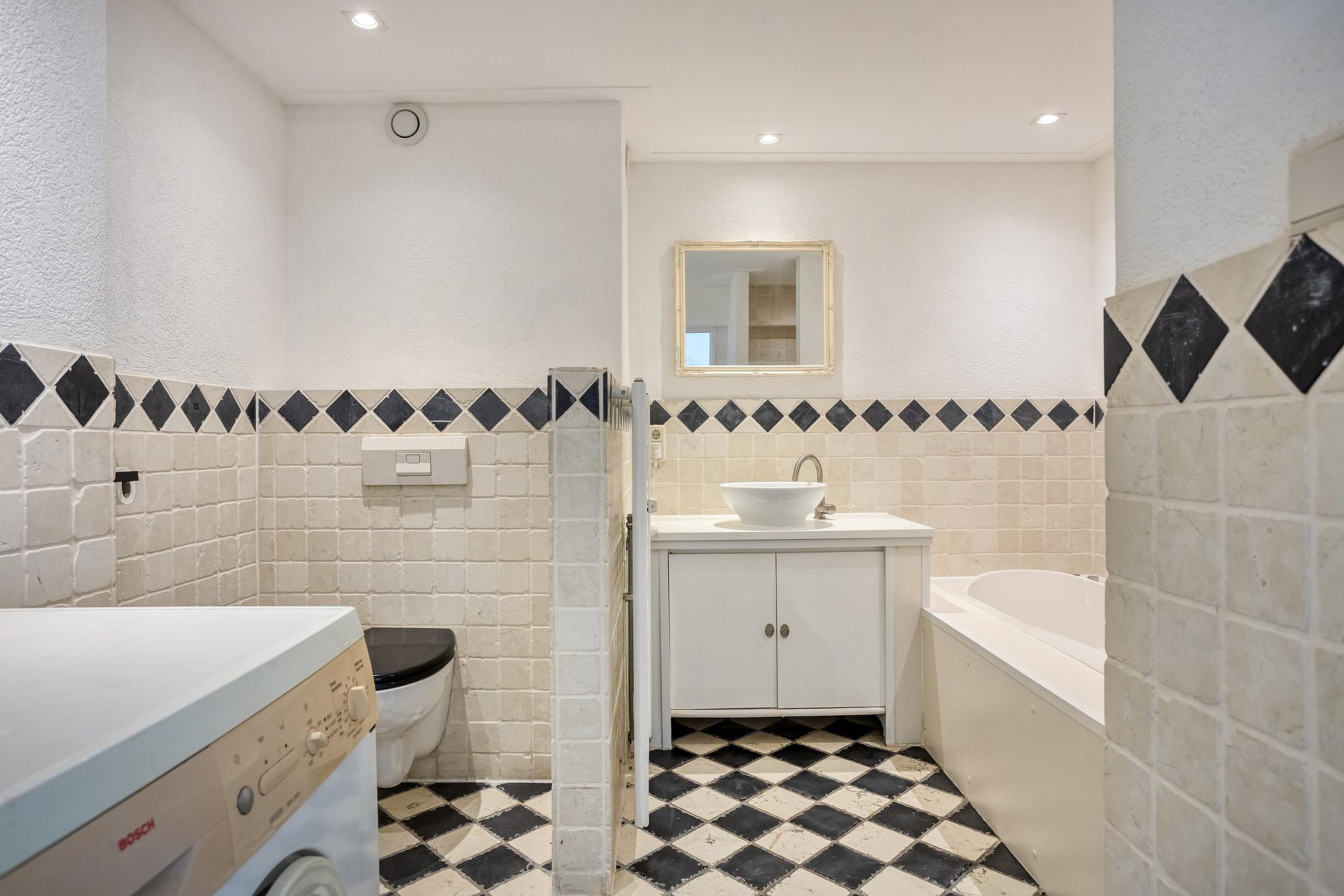 De badkamer is voorzien van een ligbad, separate douche, wastafel en toilet.