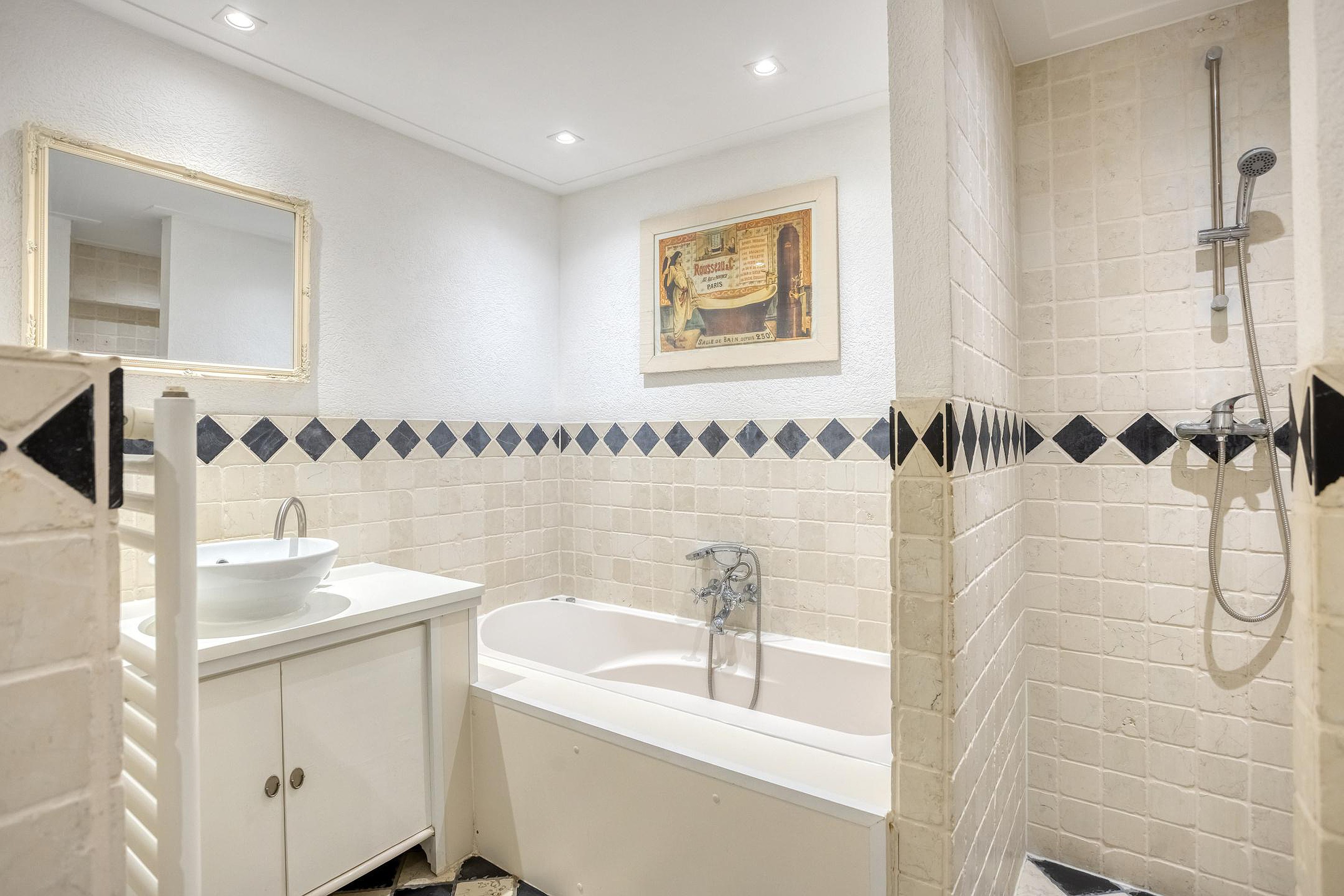 The bathroom features a bathtub, separate shower, washbasin and toilet.