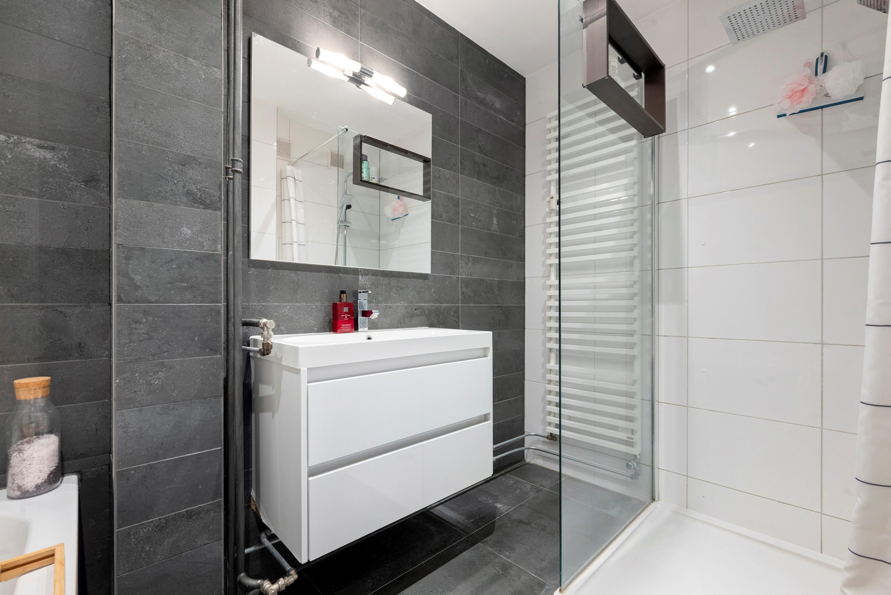 Badkamer met ligbad, douche en wastafel