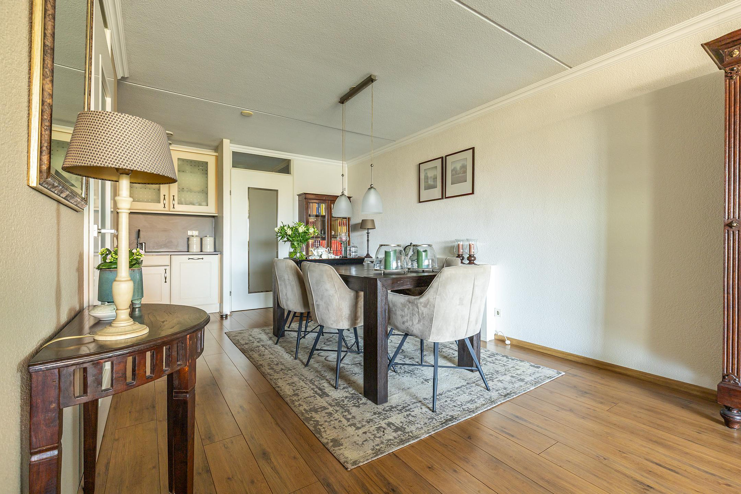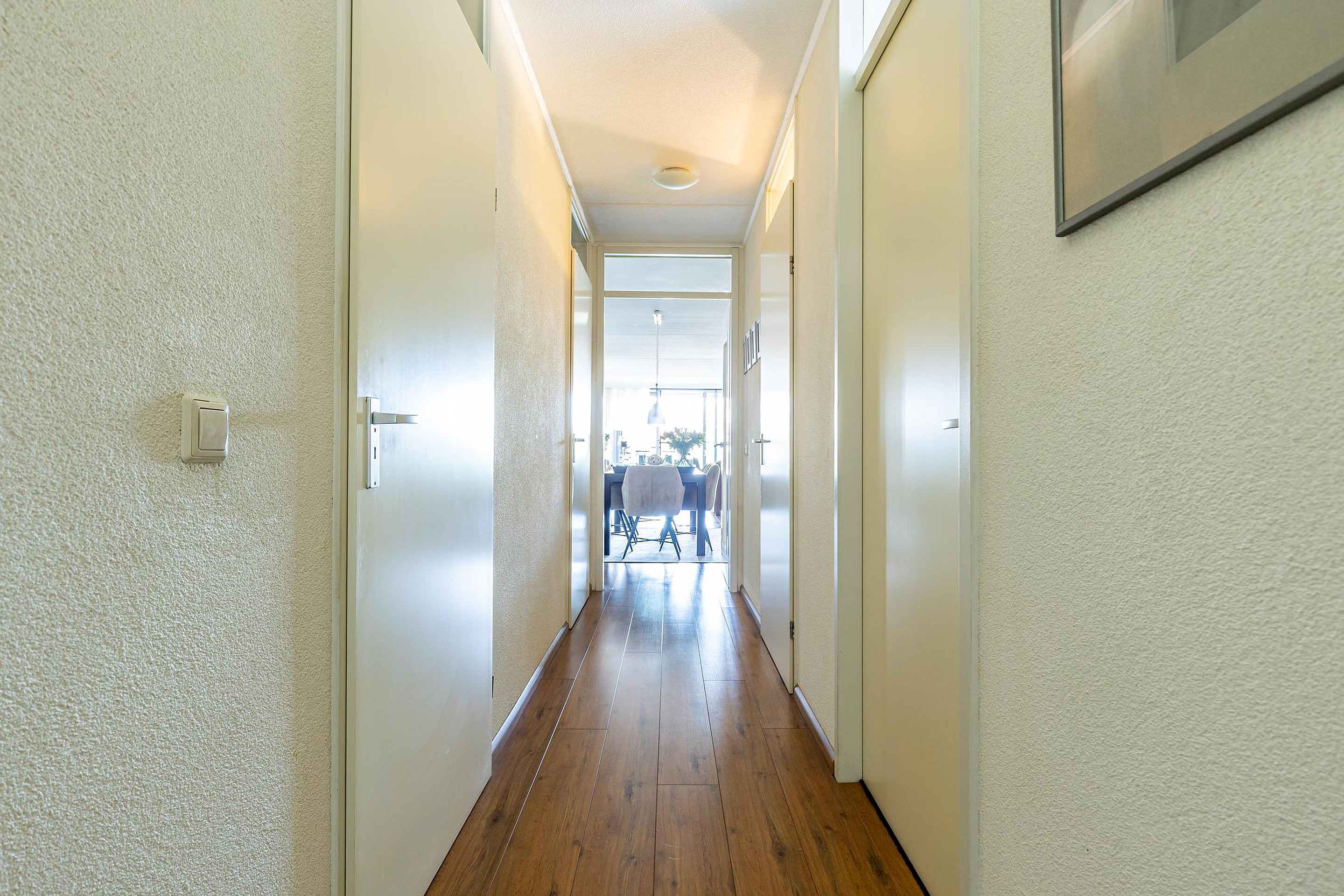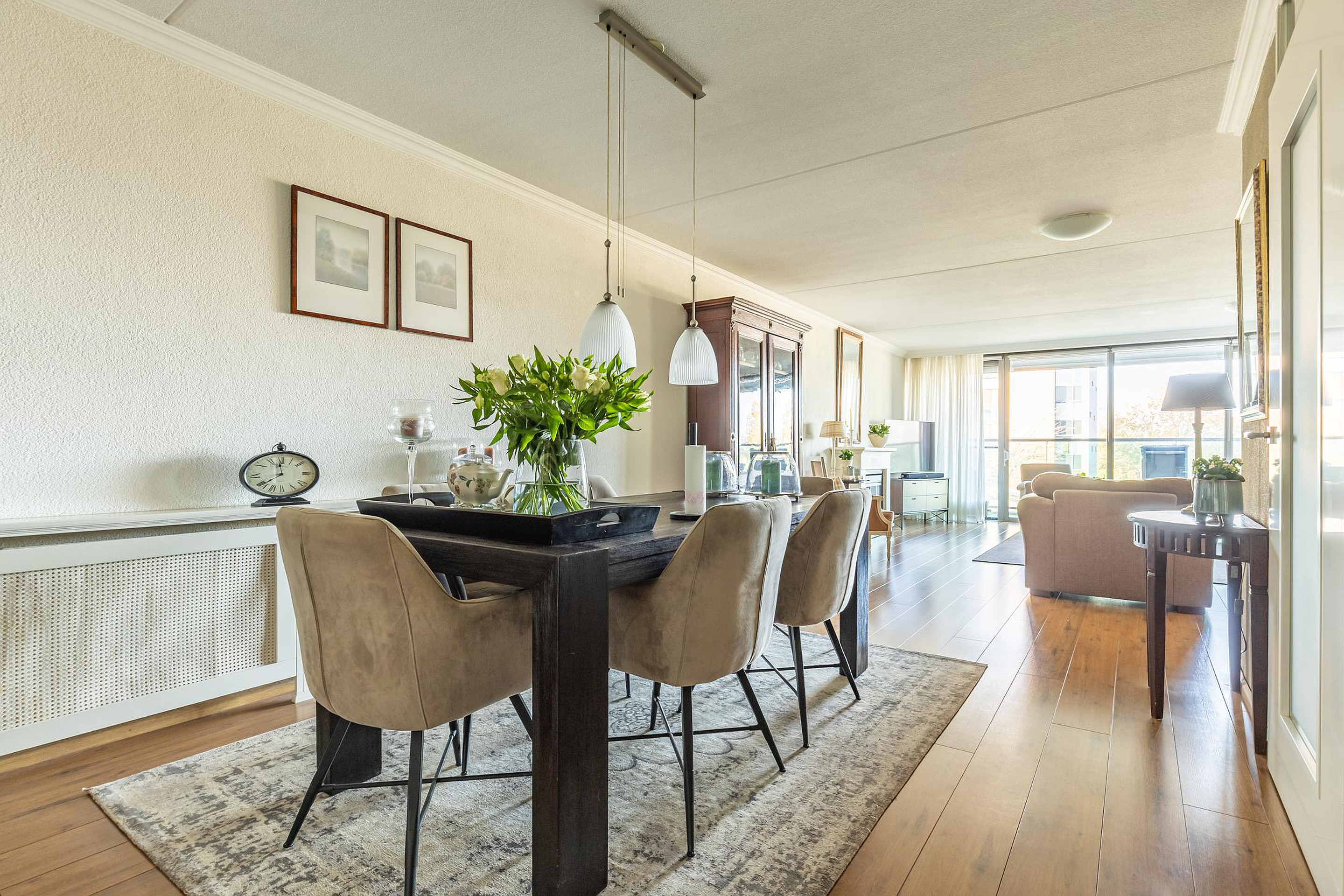 Via de entree kom je binnen in een ruime hal met meterkast en toegang tot de woonkamer en de keuken. Hier bevindt zich ook de videofoon, waarmee je bezoekers kunt zien én veilig kunt binnenlaten. Via een gang zijn de overige vertrekken bereikbaar. Direct valt op hoe licht en ruim het appartement aanvoelt. De woonkamer strekt zich uit over de volledige breedte en heeft grote raampartijen die zorgen voor veel daglicht. Er is genoeg plek voor een comfortabele zithoek en een royale eettafel. Vanuit de woonkamer bereik je het balkon, gelegen op het westen en voorzien van een automatisch zonnescherm — een fijne plek om van de middag- en avondzon te genieten.
