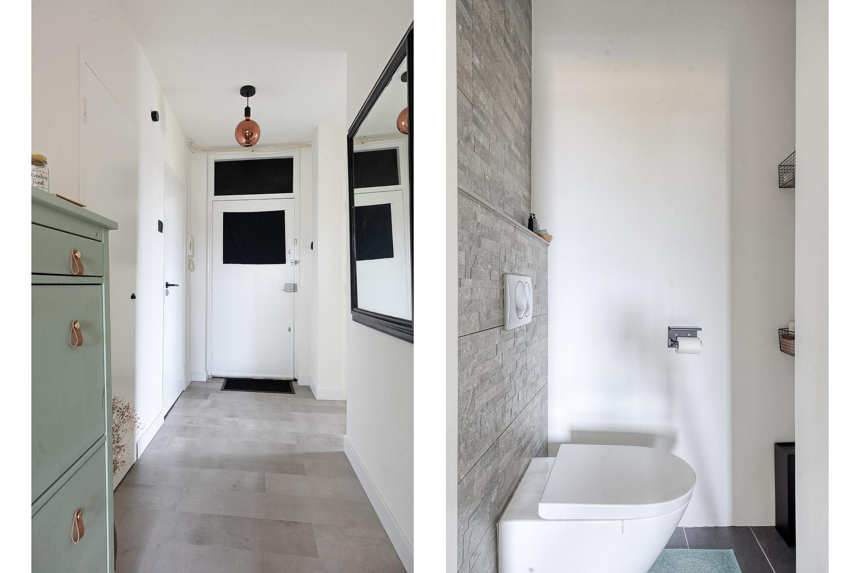 Entree met meterkast (voorzien van 8 groepen, inclusief fornuisgroep en 2 aardlekschakelaars). Via de ruime hal zijn alle vertrekken bereikbaar. Er is een modern, zwevend toilet en een separate wasruimte met aansluiting voor witgoed. De woning beschikt over twee slaapkamers en een royale woonkamer met een sfeervol woon- en eetgedeelte, met toegang tot twee balkons aan zowel de voor- als achterzijde. De keuken is uitgerust met een inductiekookplaat, afzuigkap, vaatwasser, inbouwspotjes en de opstelling van de CV-ketel. De badkamer met schuifdeur is compleet ingericht met een ligbad voorzien van hand- en regendouche, een wastafelmeubel, elektrische kachel en inbouwspotjes.