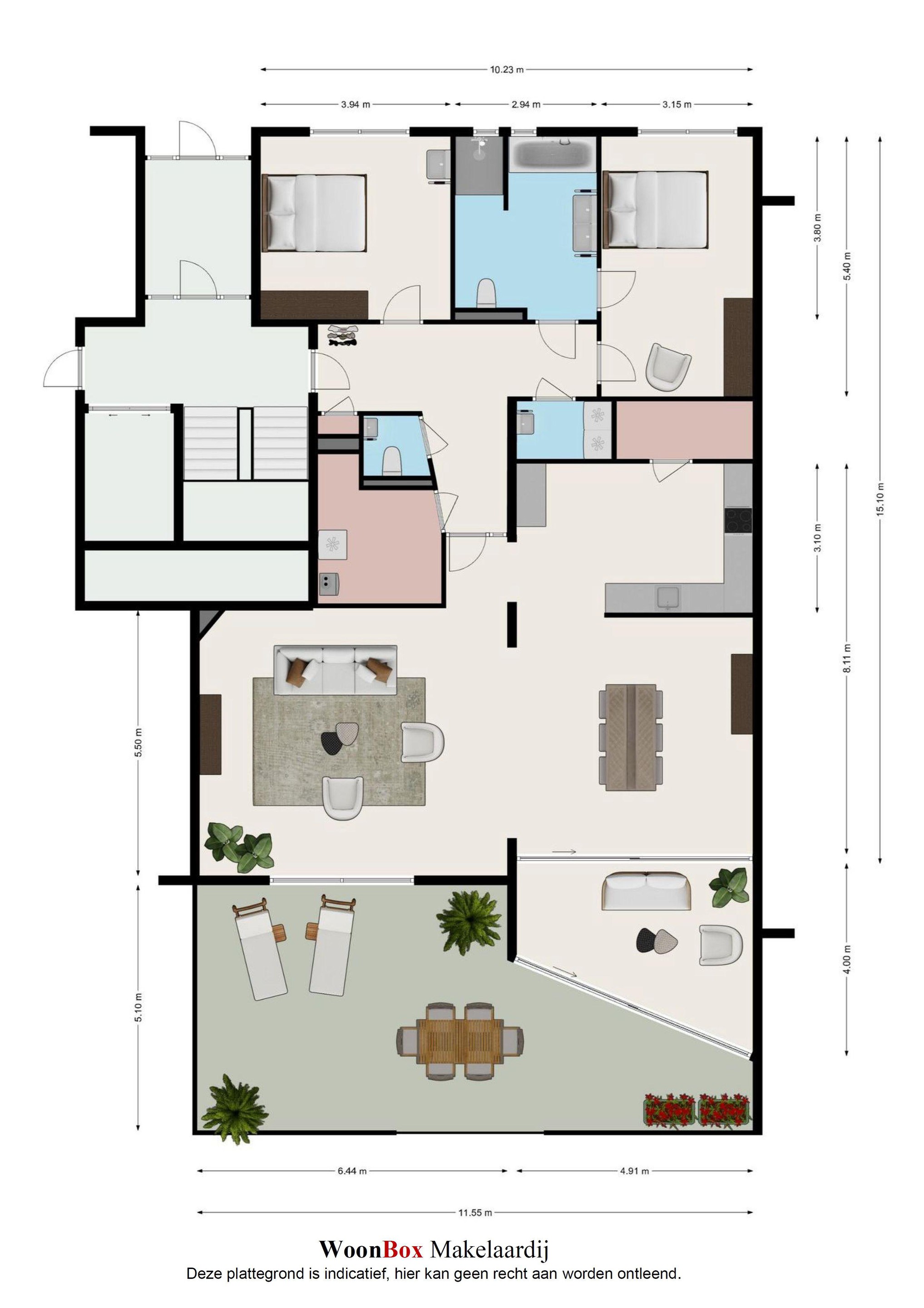 Begane grond: Woonoppervlakte 170m2, 4 kamers, terras 45m2.