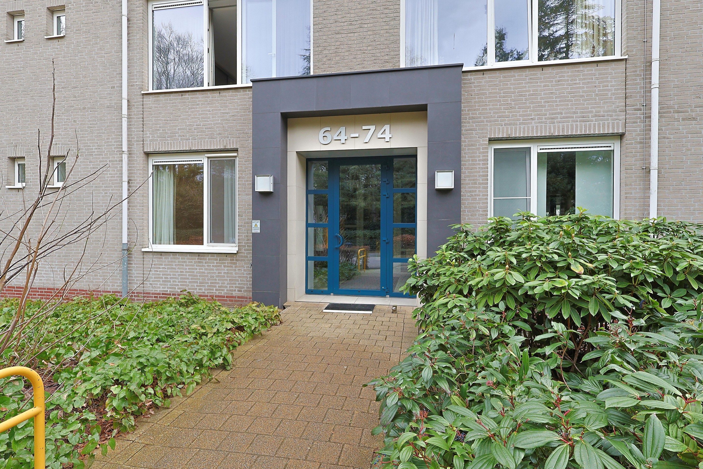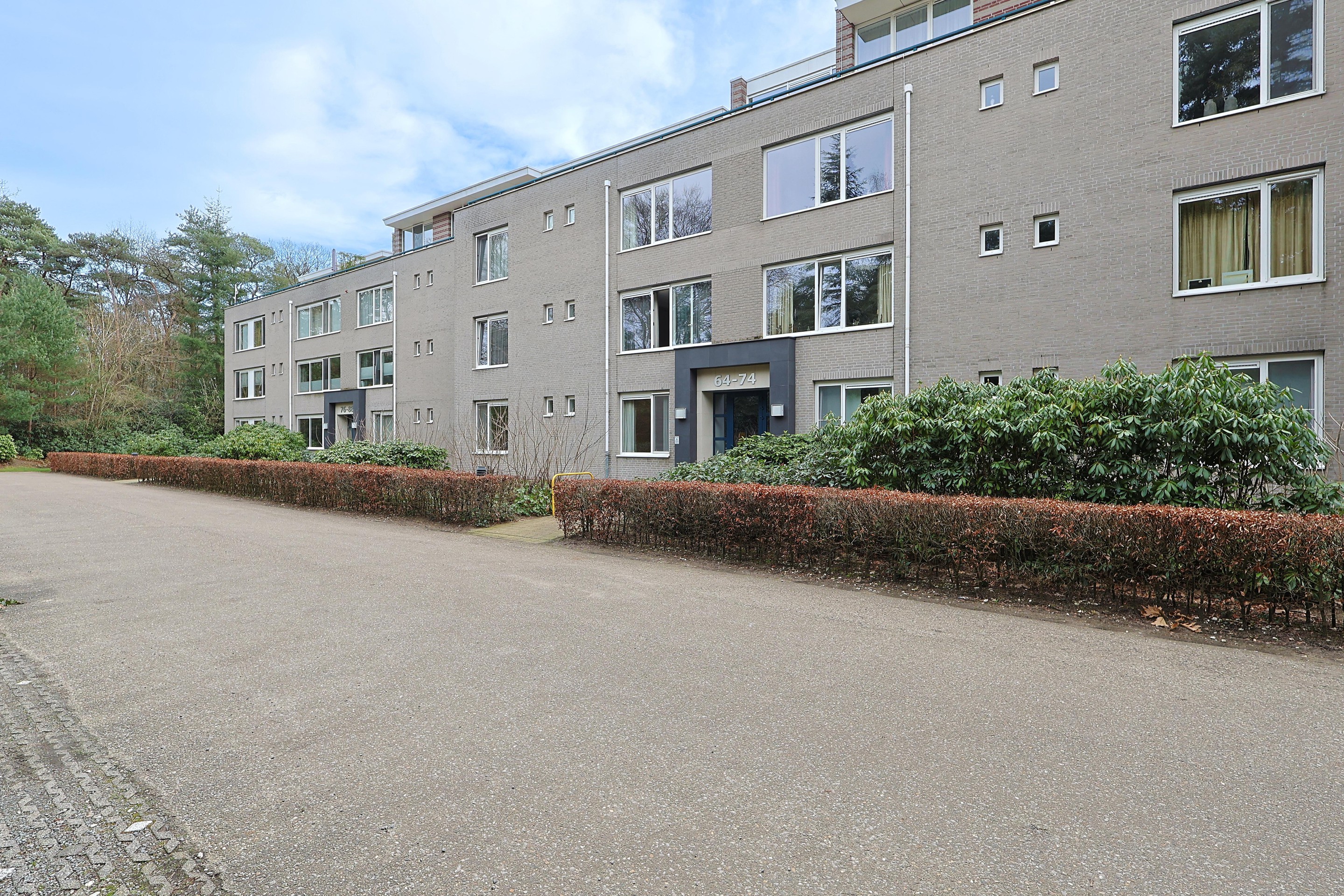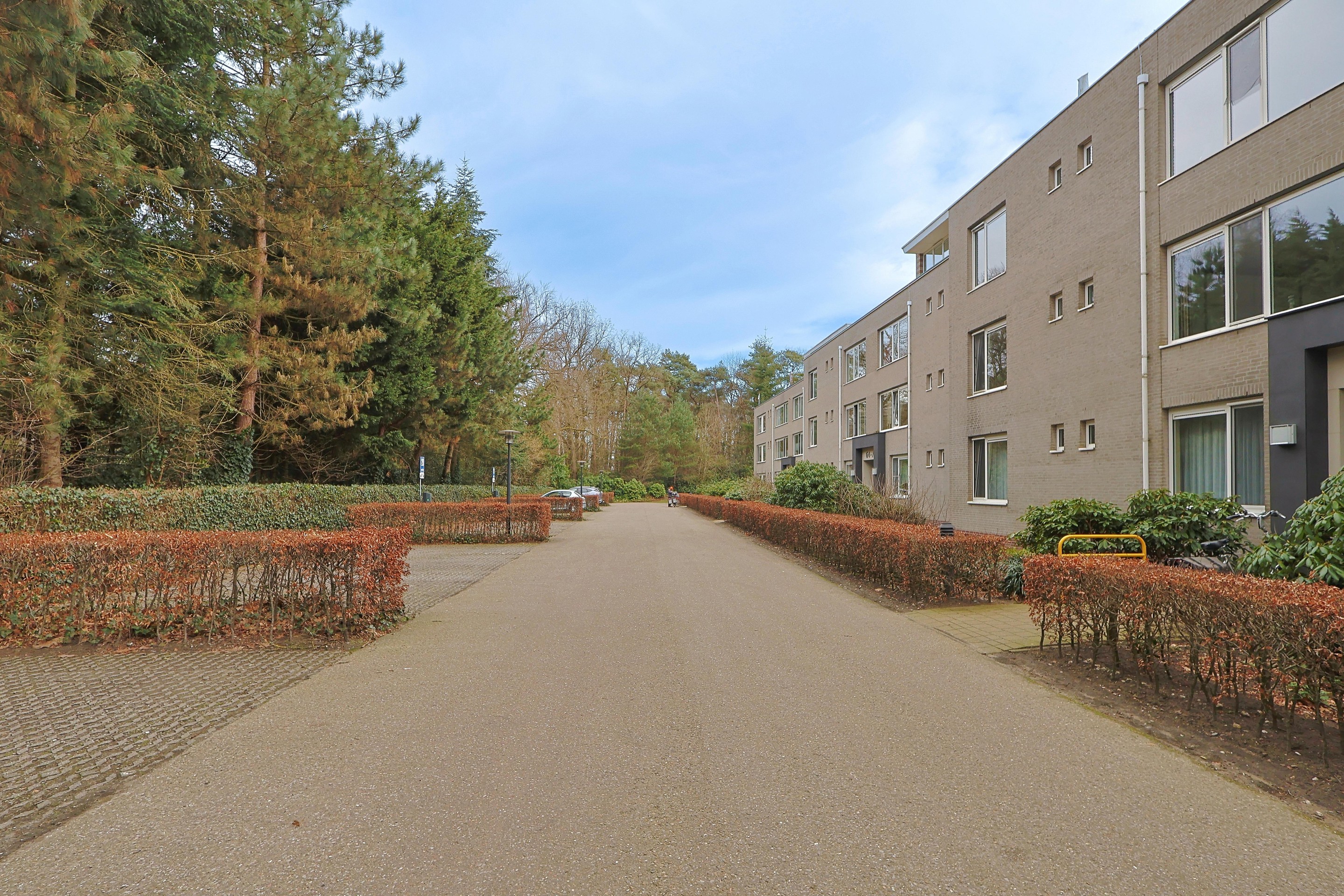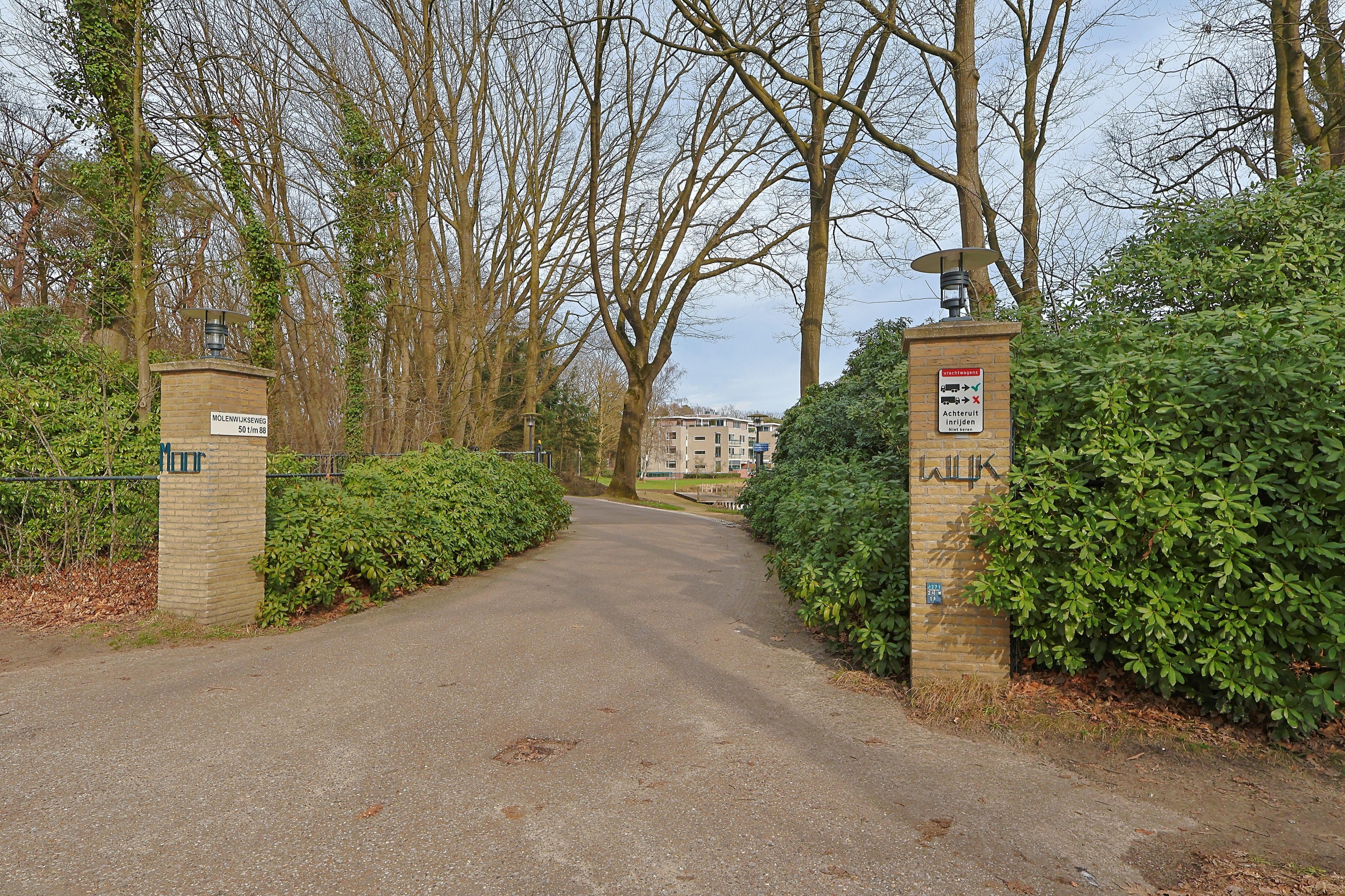 Via een boomrijke oprijlaan, afgesloten met een elektrische poort, bereikt u het complex. Direct voor het gebouw bevinden zich ruime bezoekersparkeerplaatsen, waaronder ook laadpunten voor elektrische auto’s.