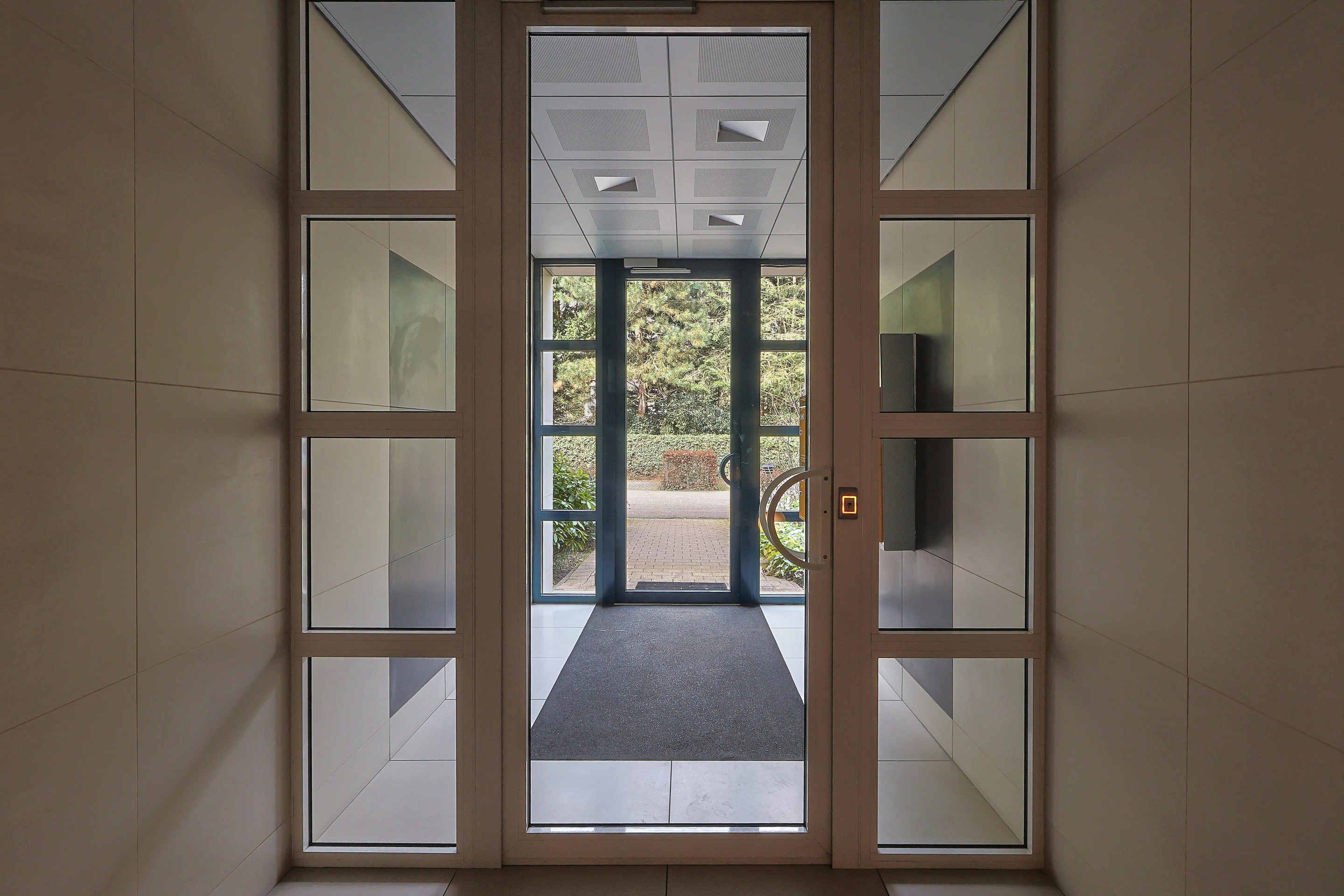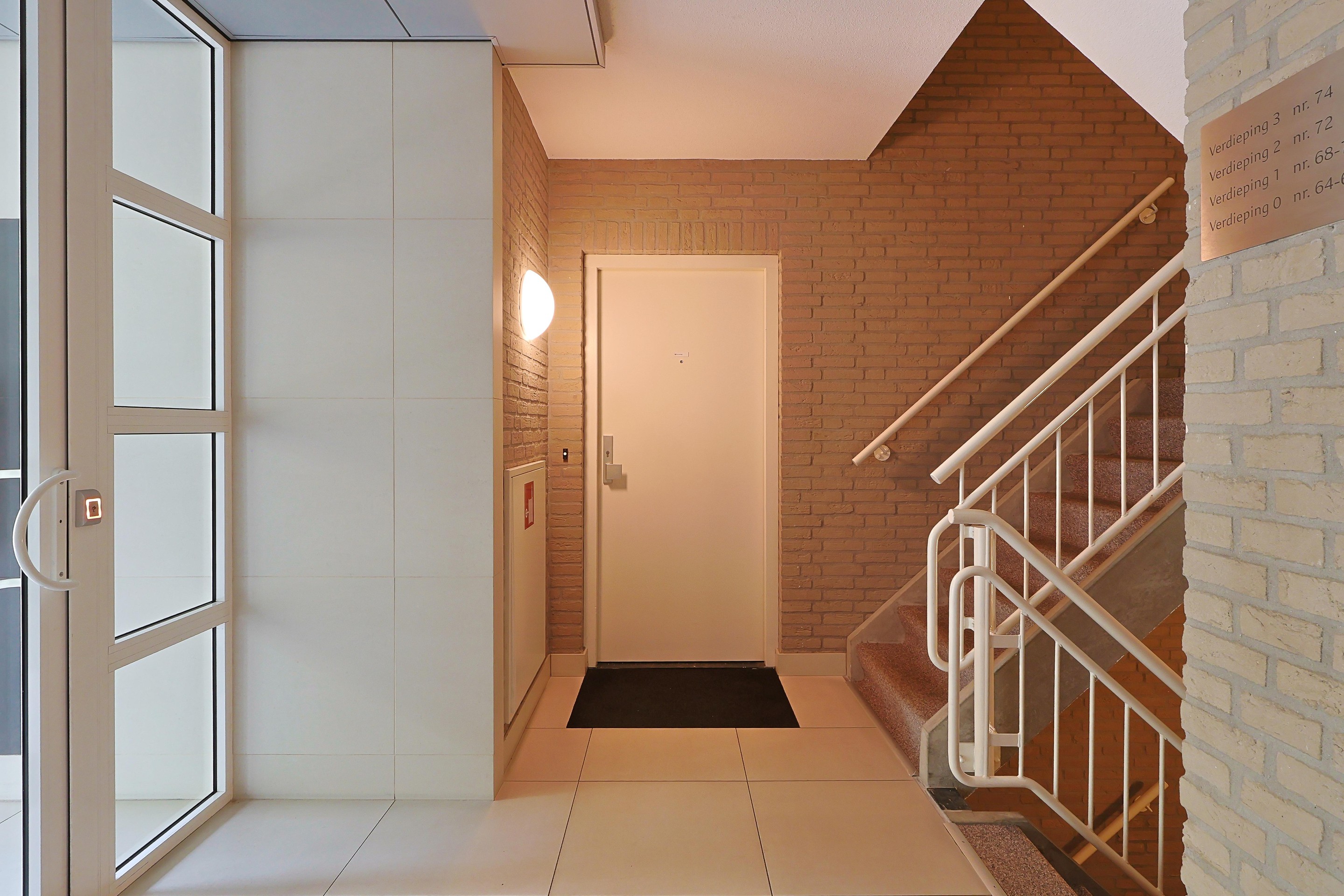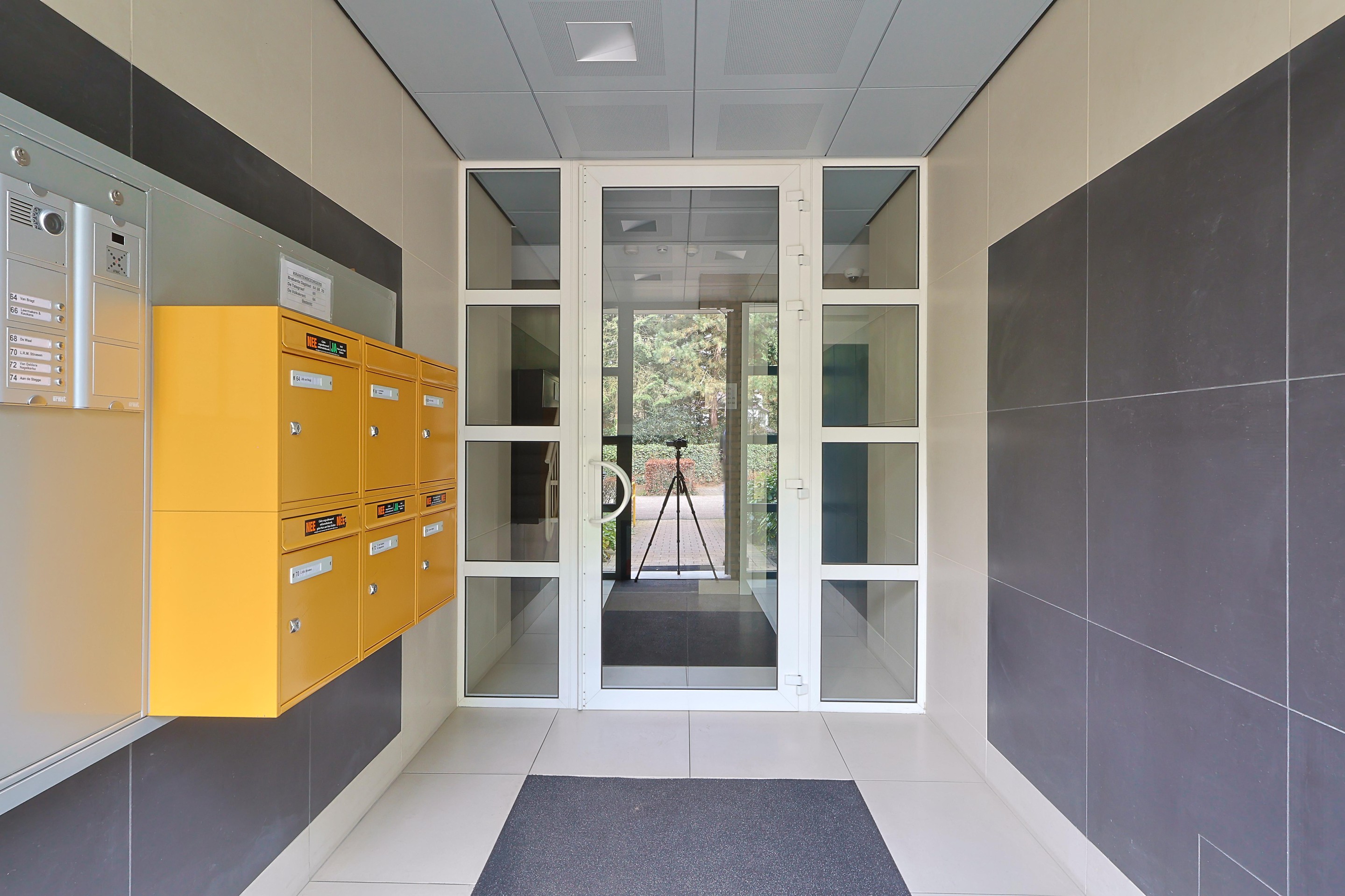De centrale entree beschikt over een vestibule met brievenbussen, een bellentableau en een videofooninstallatie.