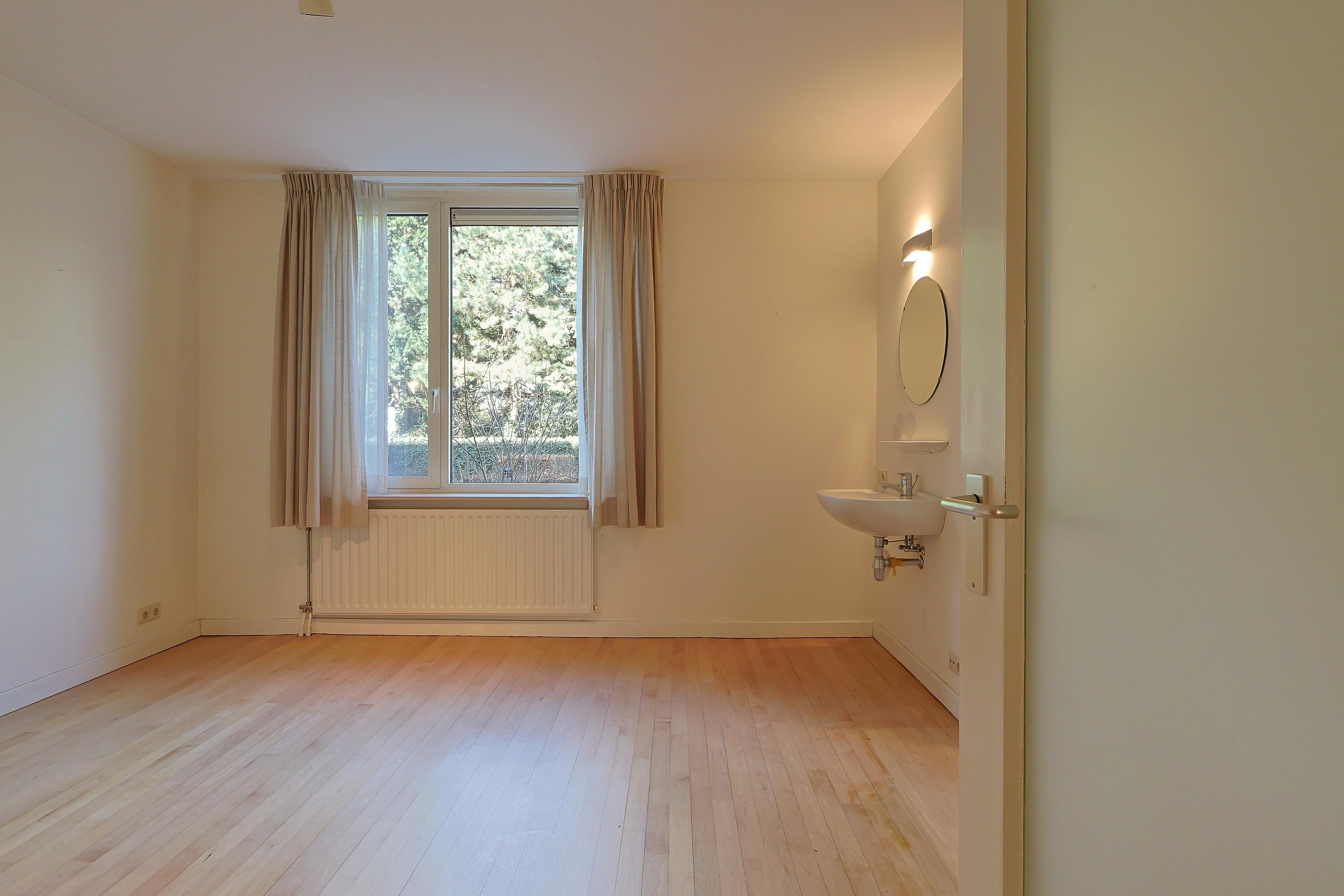 Ruime slaapkamer met wastafel.