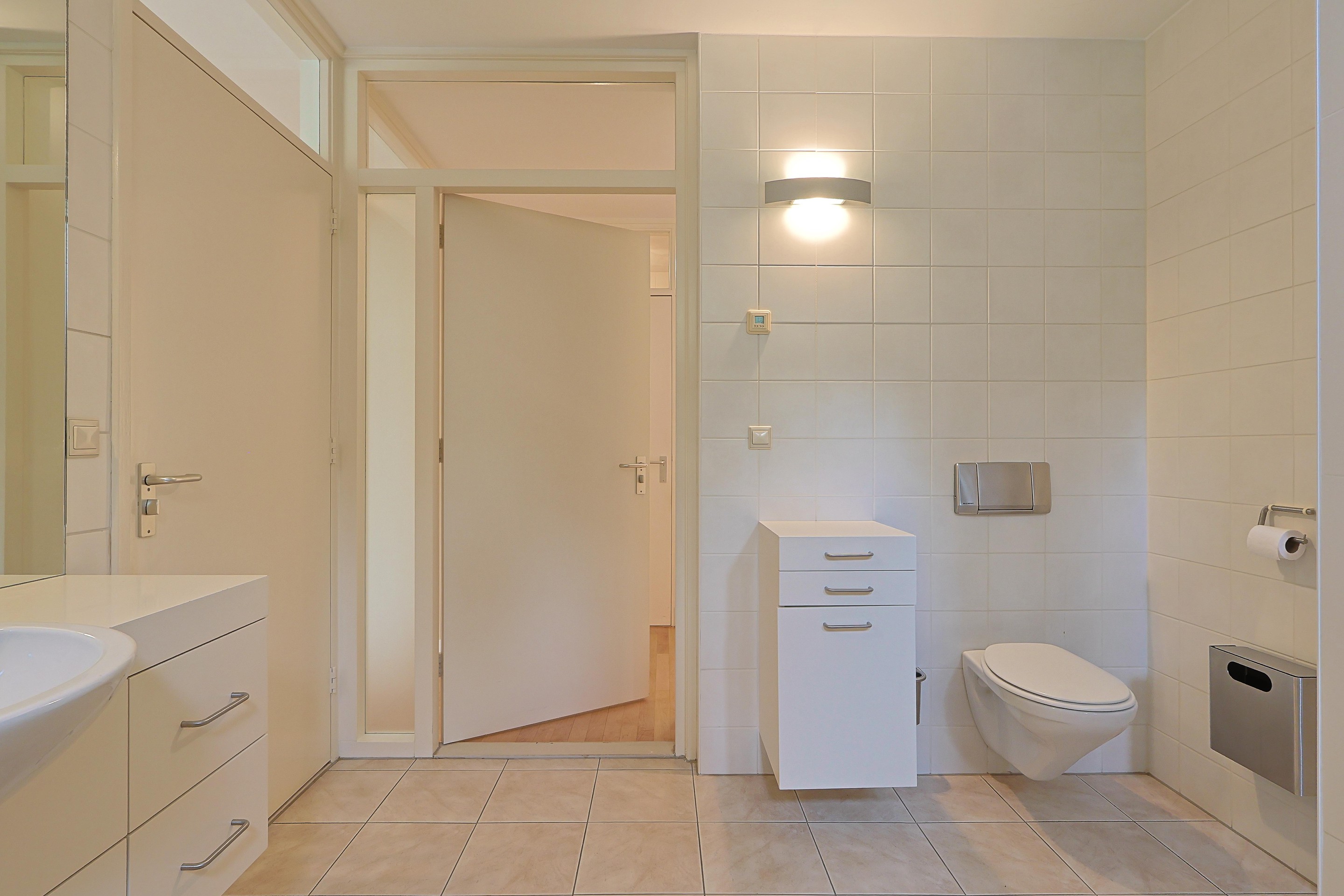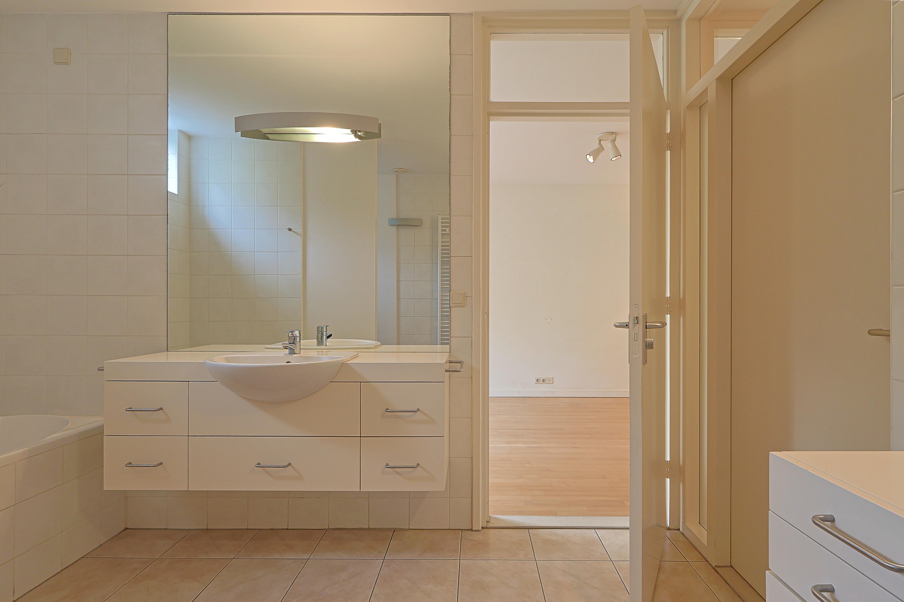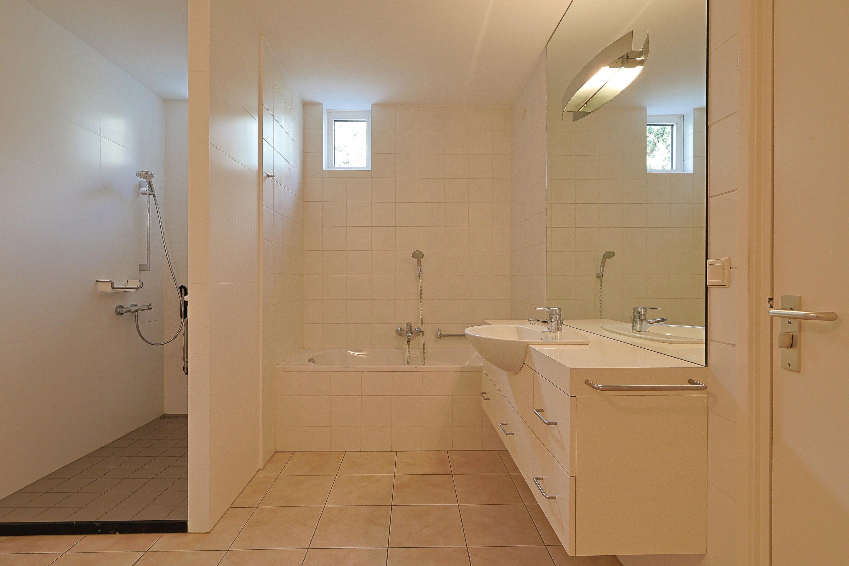 Badkamer met wastafel in meubel, ligbad, inloopdouche, hangcloset en een extra (en suite) deur naar de ouderslaapkamer.