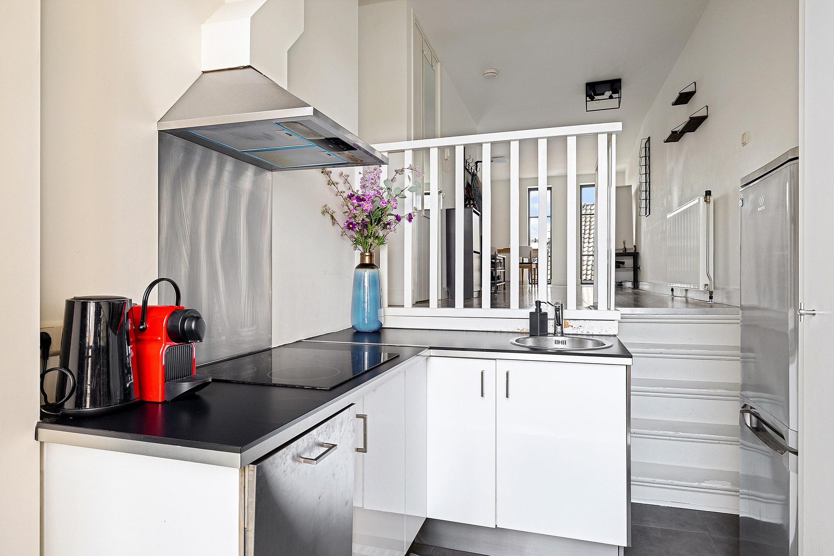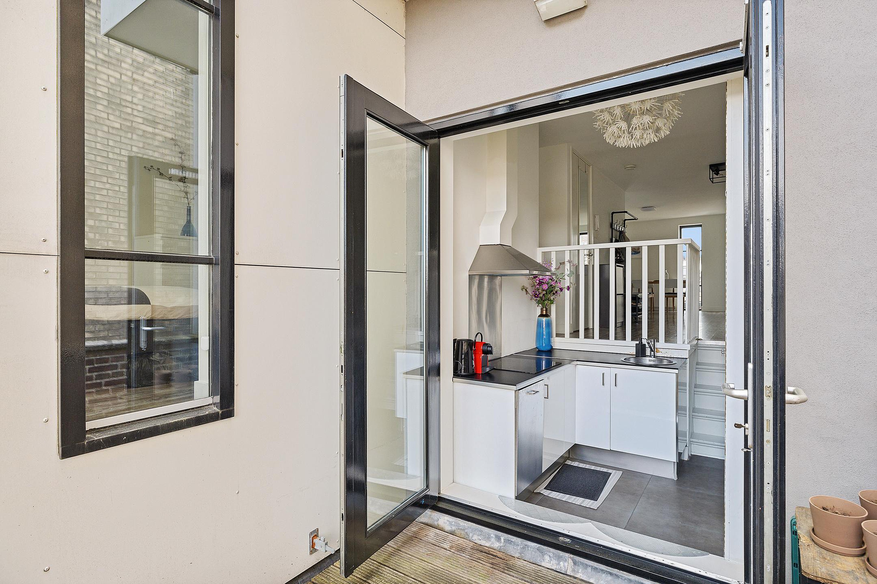 Een paar treden lager kom je in de nette L-vormige keuken, uitgerust met een spoelbak, vaatwasser, inductiekookplaat en afzuigkap. Hier vind je ook een vaste kast met de wasmachineaansluiting en cv-ketel. Via openslaande deuren heb je toegang tot het dakterras, waar je heerlijk kunt genieten van de ochtendzon.
