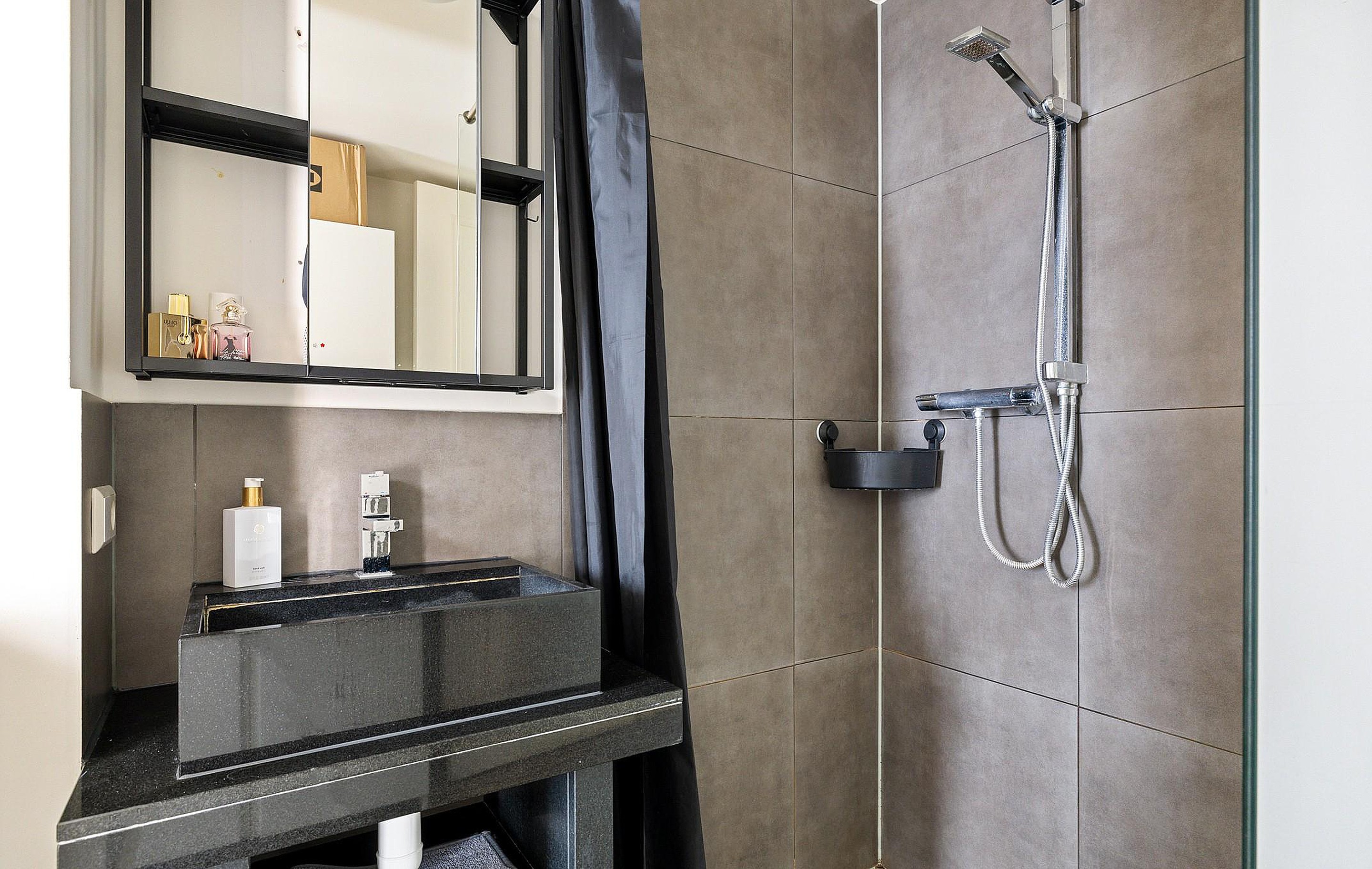 Vanuit de woonkamer is er een doorloop naar een modern toilet en de ruime slaapkamer, die is voorzien van een half open badkamer (met vloerverfwarming) met een inloopdouche en stijlvol wastafelmeubel. De slaapkamer is aan de achterzijde gelegen, weg van de drukke straat, dus heerlijk rustig.
