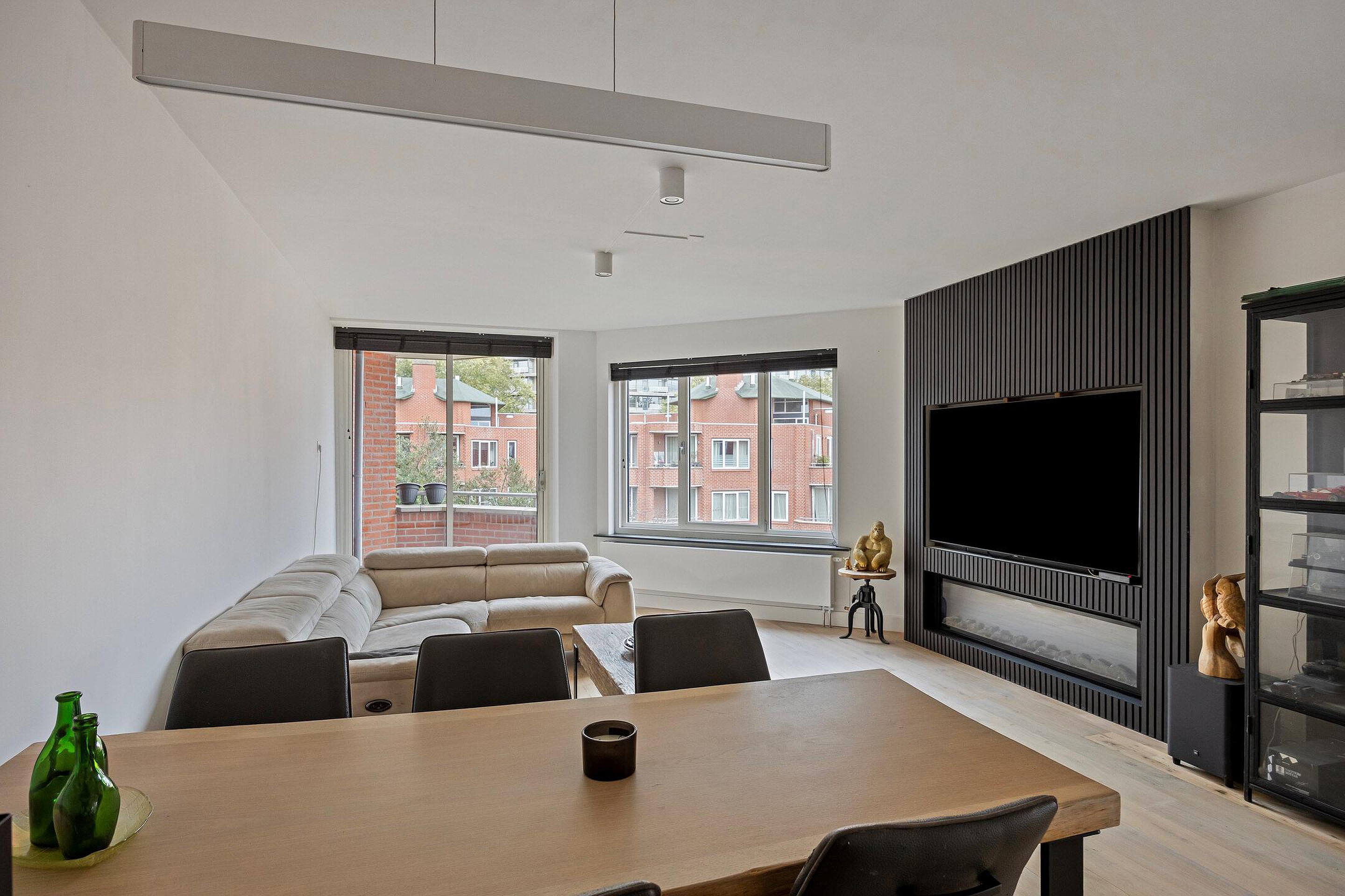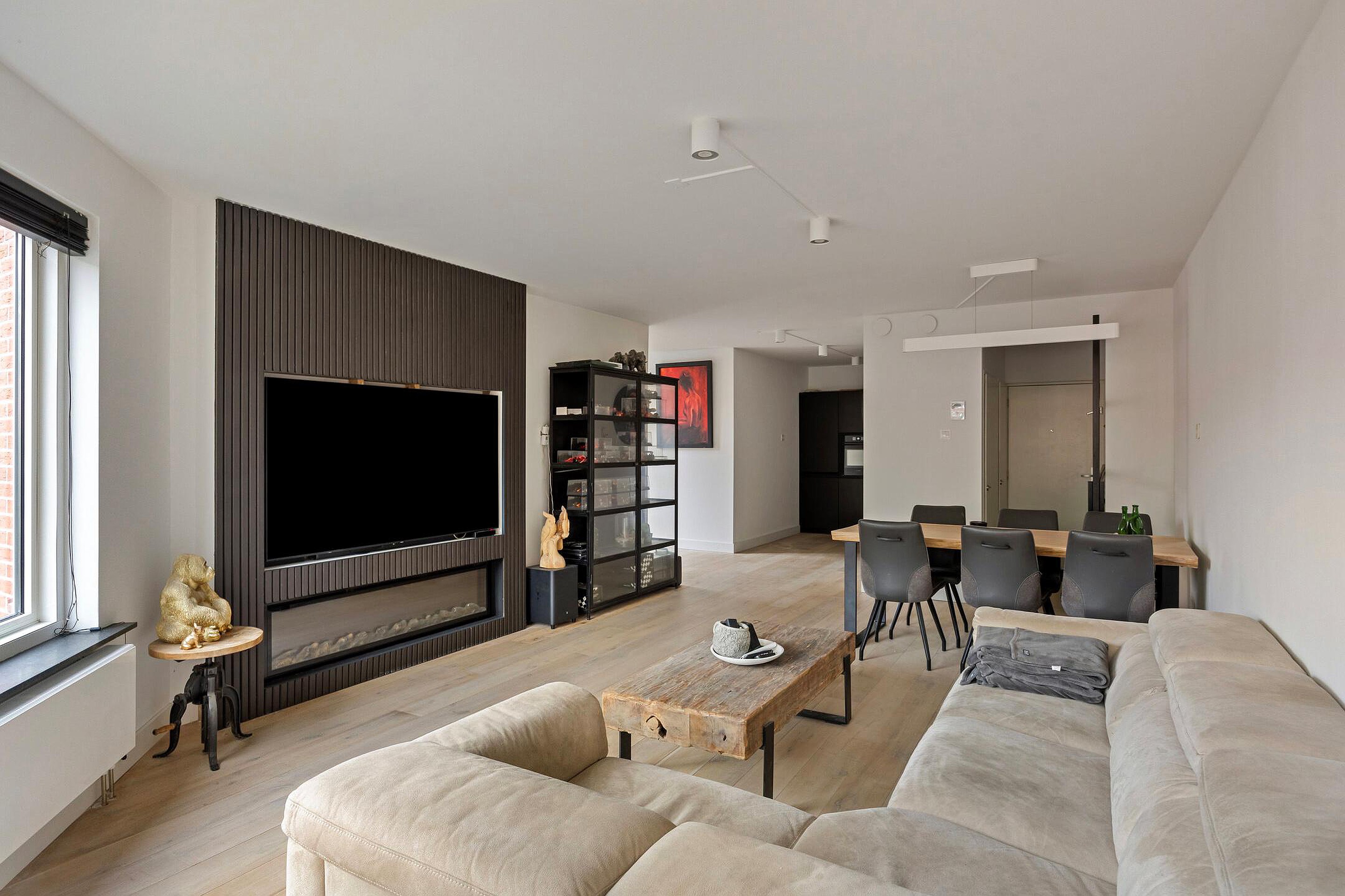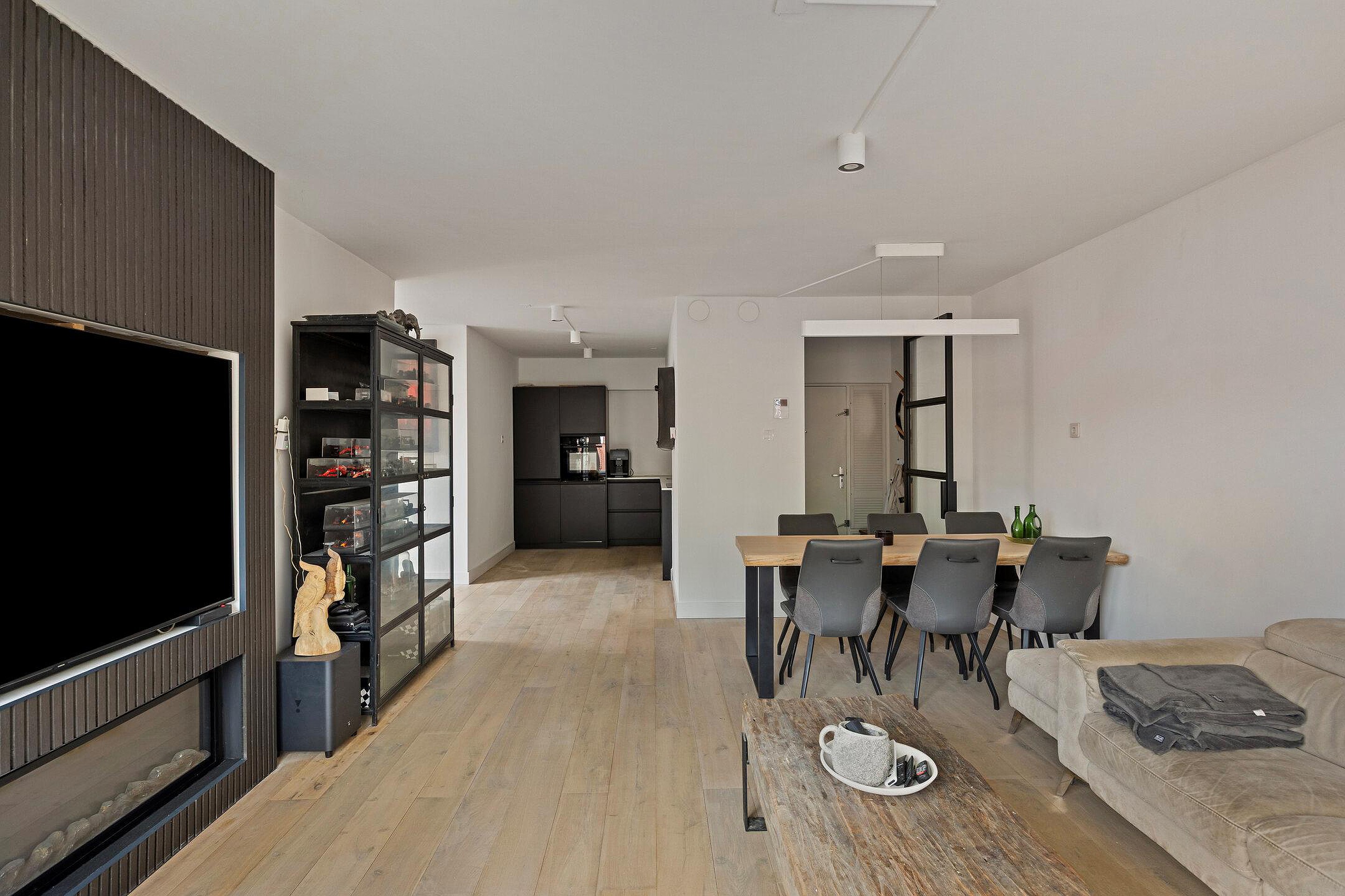 Woonkamer, een strakke en lichte woonkamer met fraaie stalen Skygate taatsdeur, moderne Cinewall met elektrische sfeerhaard en een 75 inch Samsung OLED tv-scherm (blijft achter)! Vanuit de woonkamer is er toegang tot het balkon en de open keuken.
