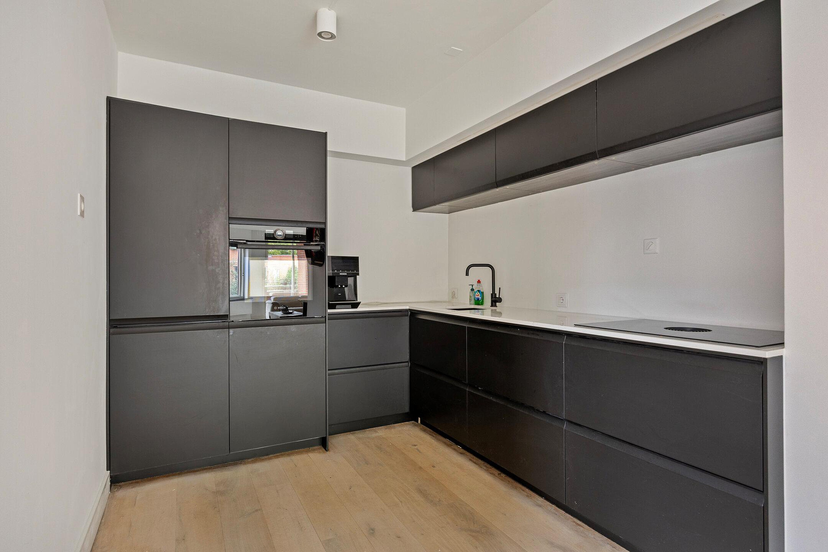 Keuken, nette en moderne keuken, voorzien van een L-vormig keukenblok met hoogwaardig apparatuur: een inductie kookplaat met Bora afzuigsysteem, koel-vriescombinatie, vaatwasser, combi-oven en veel bergruimte door de brede lades.