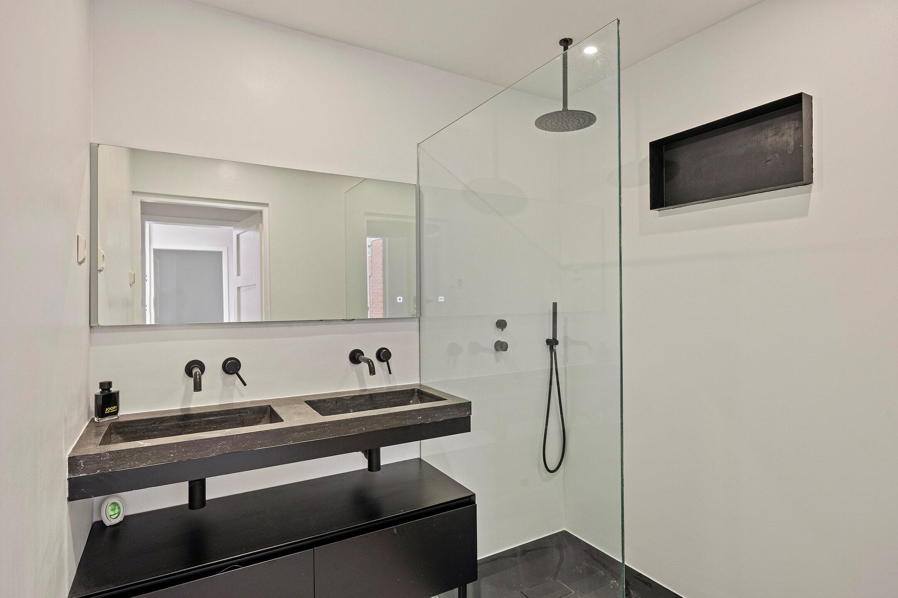 Badkamer, ook dit is een fraai en modern afgewerkte ruimte, met een tegelvloer voorzien van elektrische vloerverwarming en gestucte wanden. De badkamer is voorzien van een inloopdouche met rainshower en handdouche, dubbele wastafel met spiegel en onderladen.
