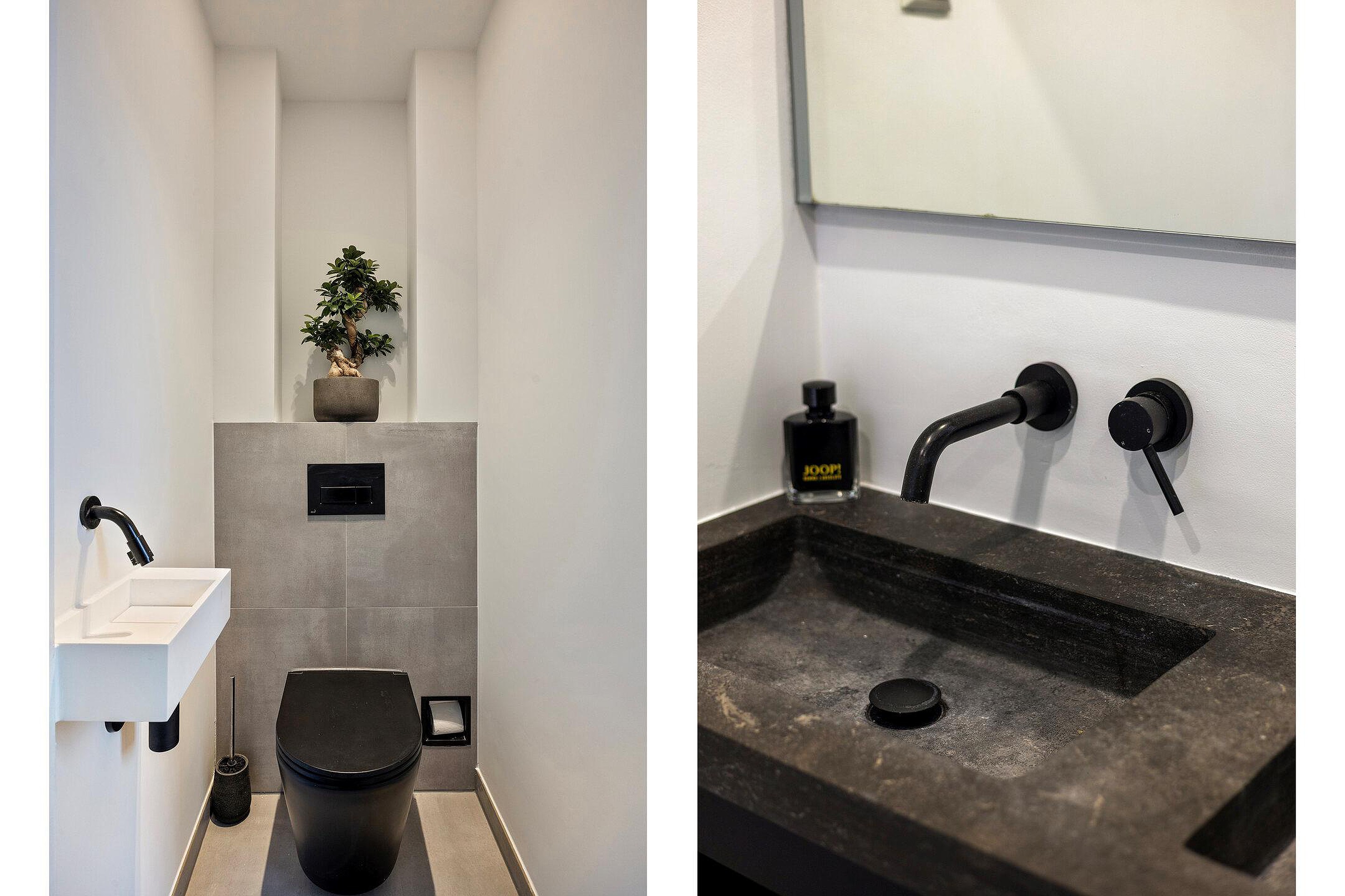 Toilet, eveneens voorzien van een tegelvloer en gestucte wanden, en verder uitgerust met een hangend closet en een fonteintje.