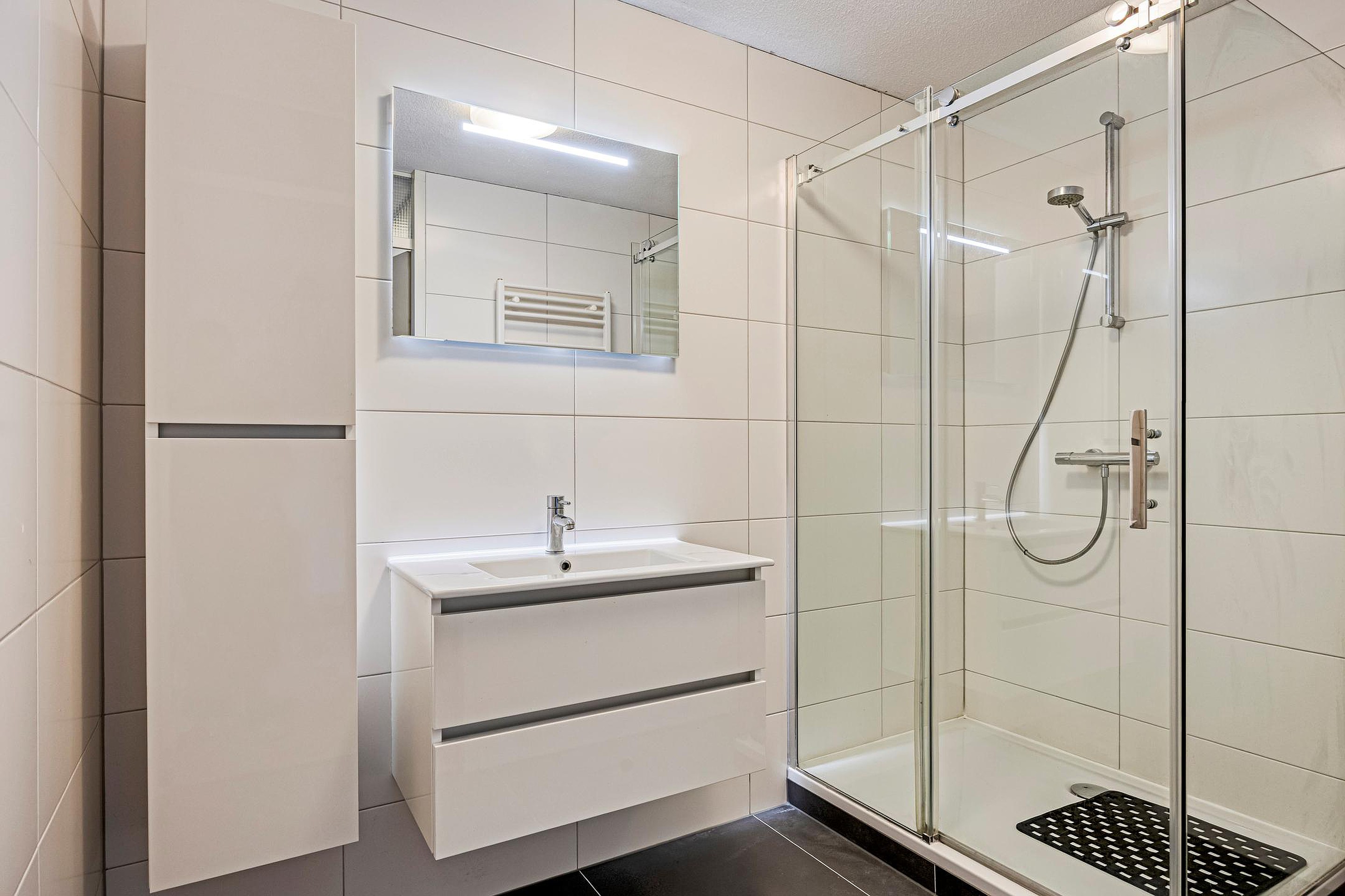 Badkamer, geheel betegeld, voorzien van een inloopdouche met thermostaatkraan, een wastafel met onderladen en kolomkast, spiegel met verlichting en een badkamerradiator.