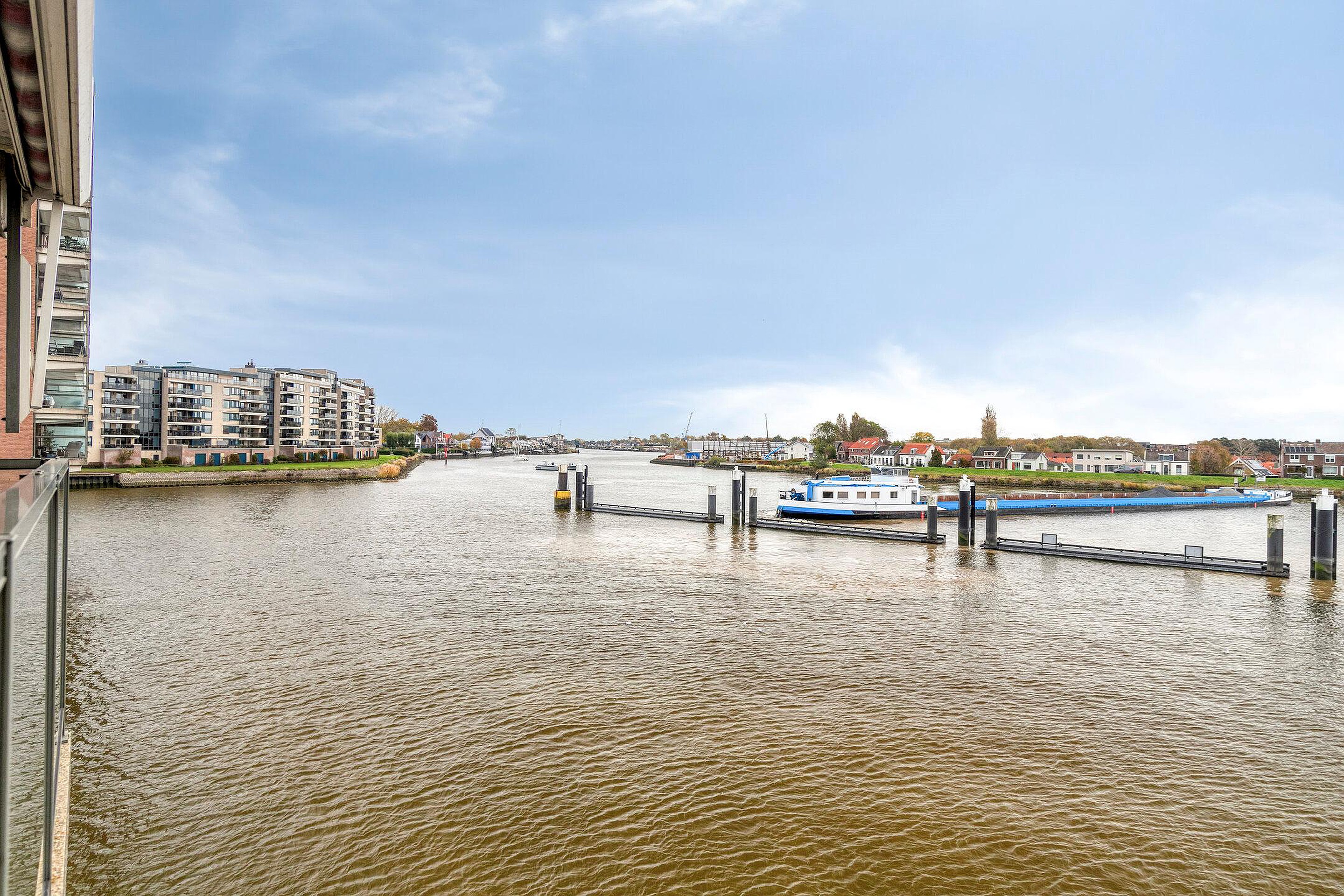 Woonkamer, een royale en opvallend lichte woonkamer met prachtig uitzicht over de rivier. De kamer bevat een zijraam en biedt verder toegang tot de open keuken en het ruime balkon via een brede schuifdeur.