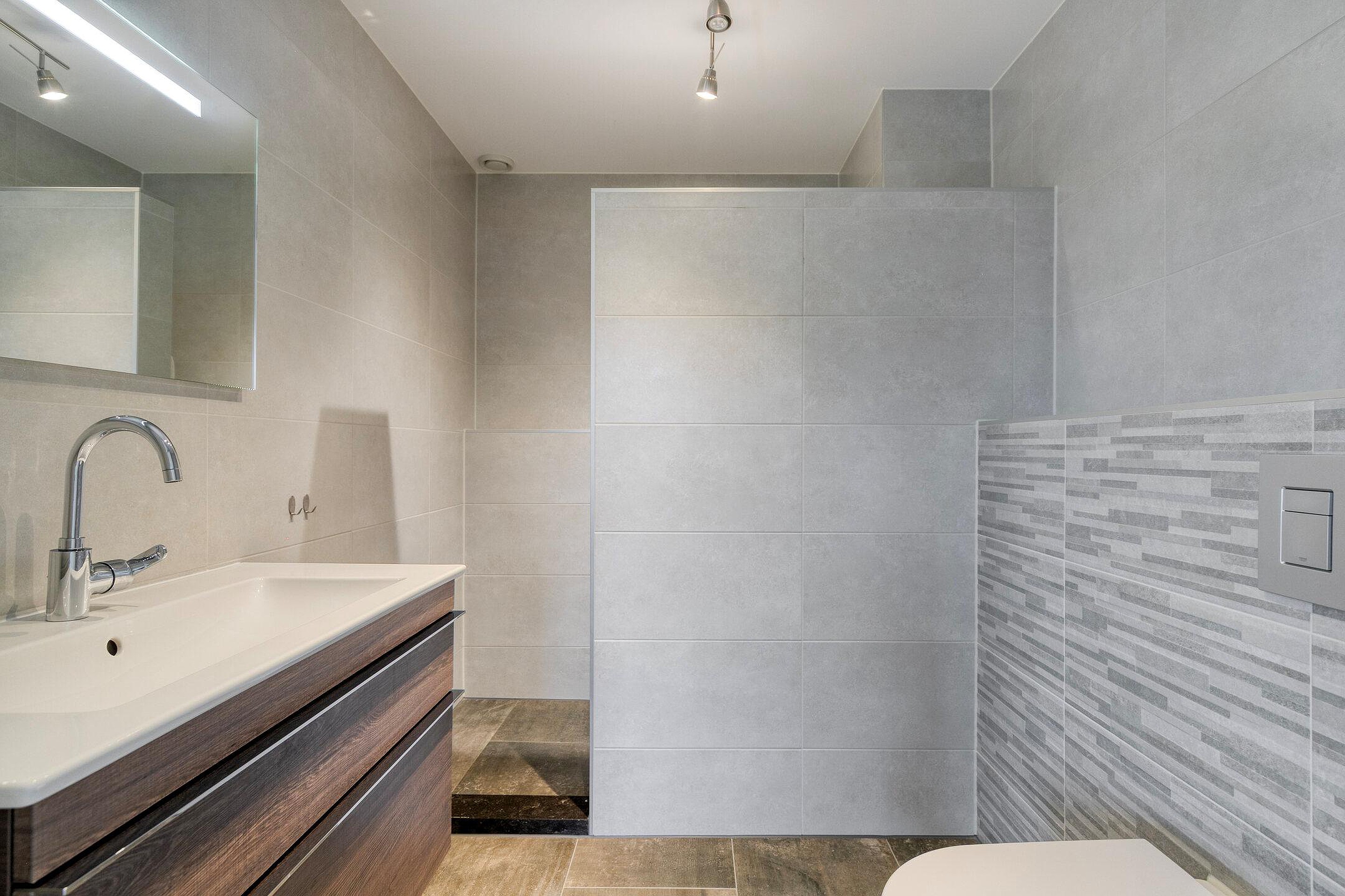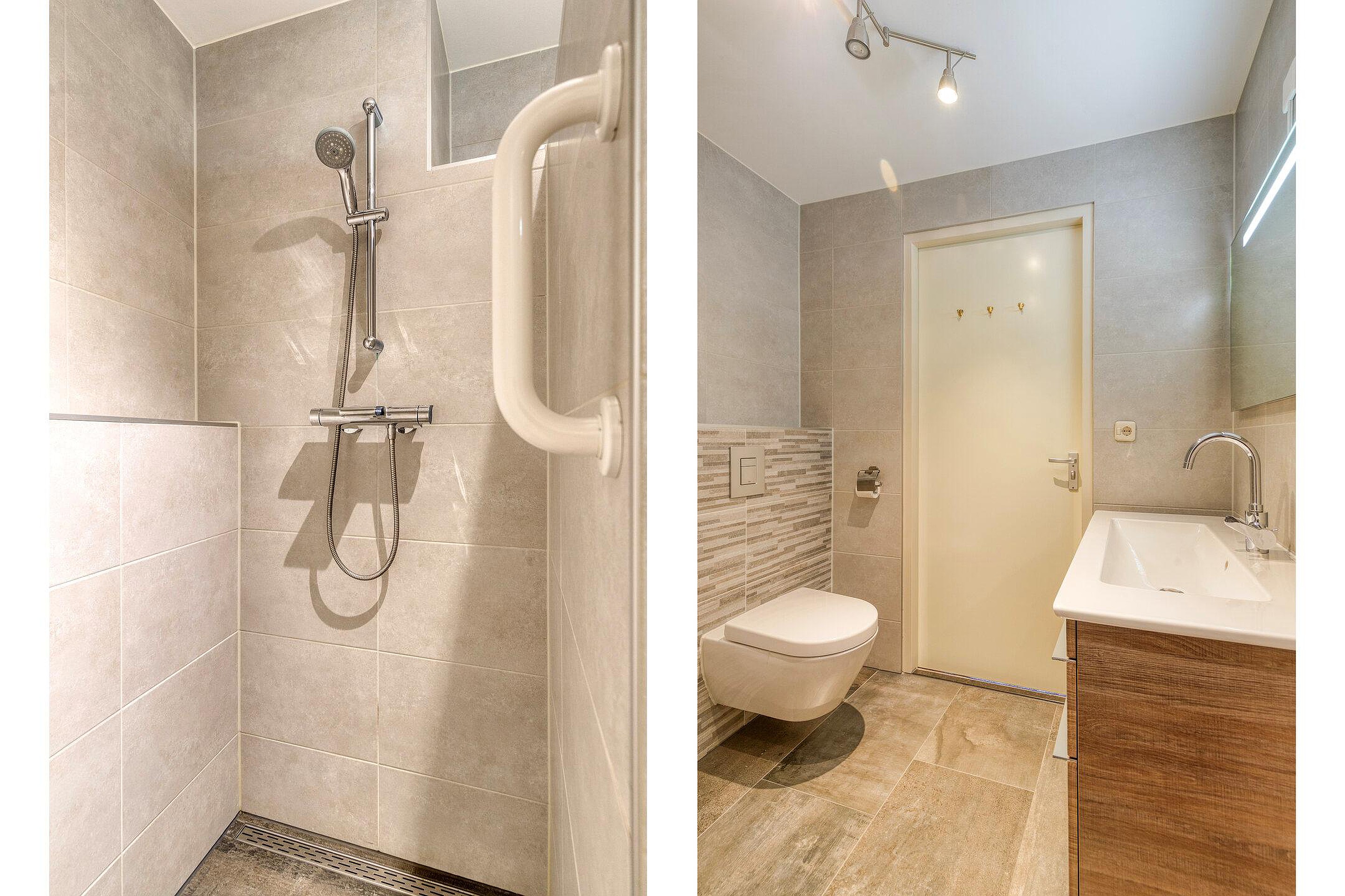 Badkamer, een nette en geheel betegelde ruimte, voorzien van een inloopdouche met thermostaatkraan, wastafel met onderladen en spiegel met verlichting, een tweede toilet (hangend closet) en mechanische ventilatie.