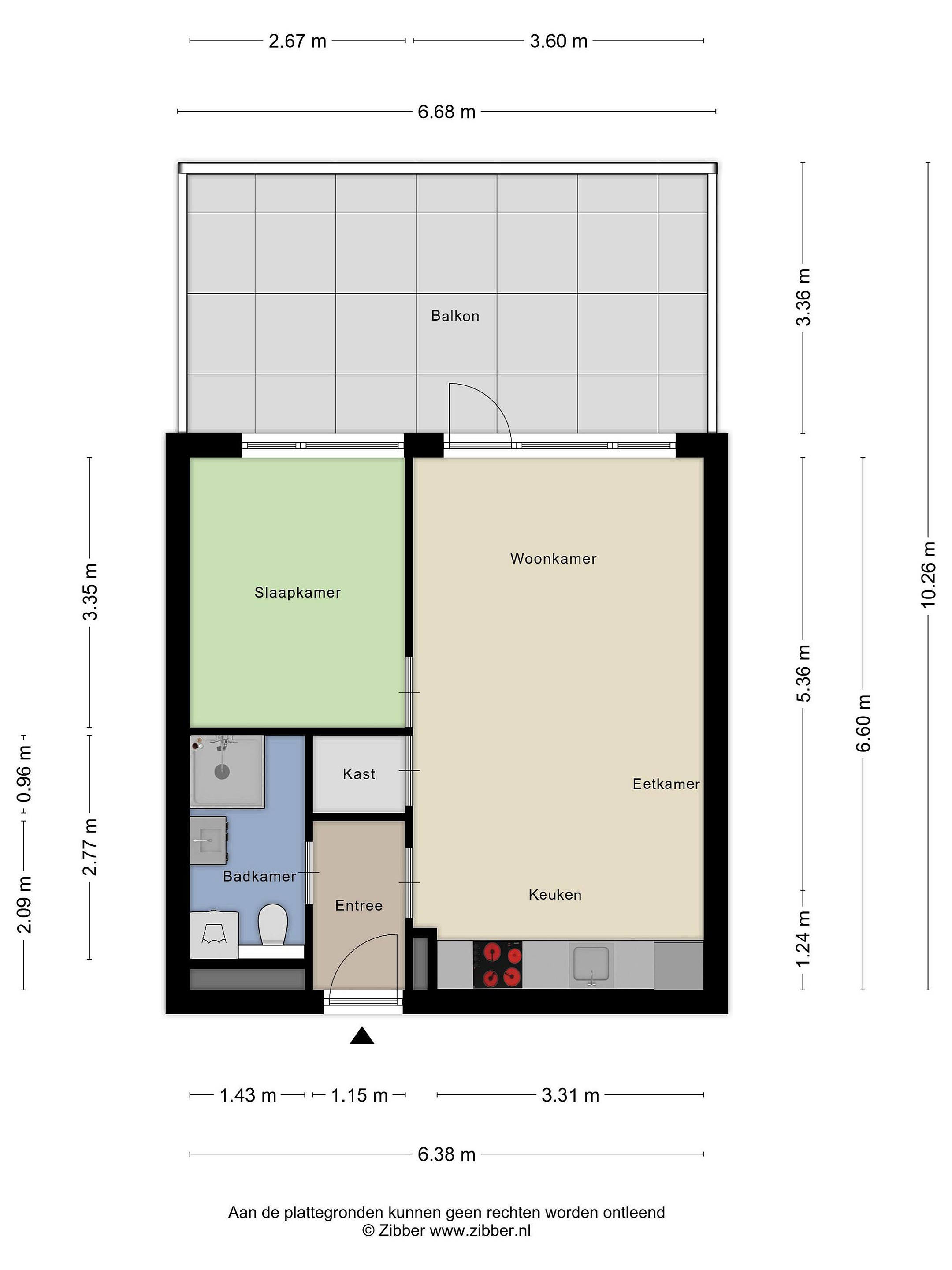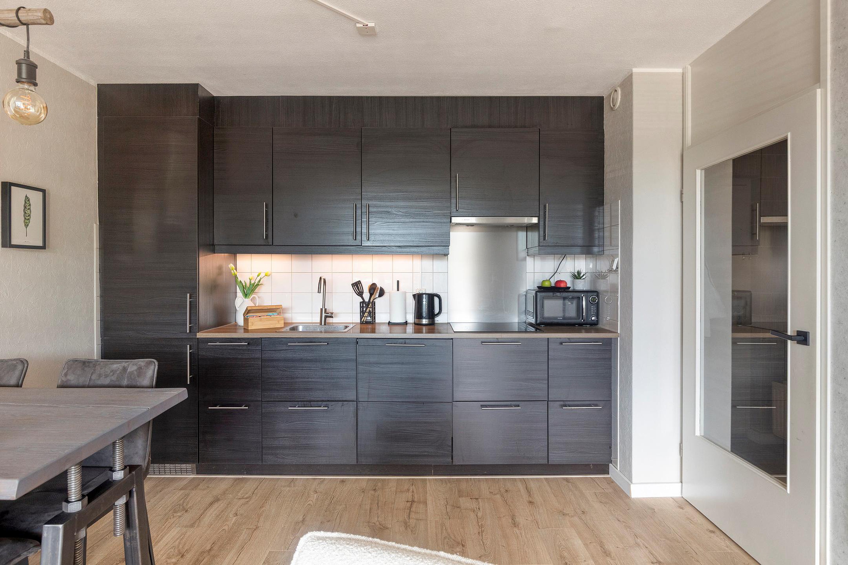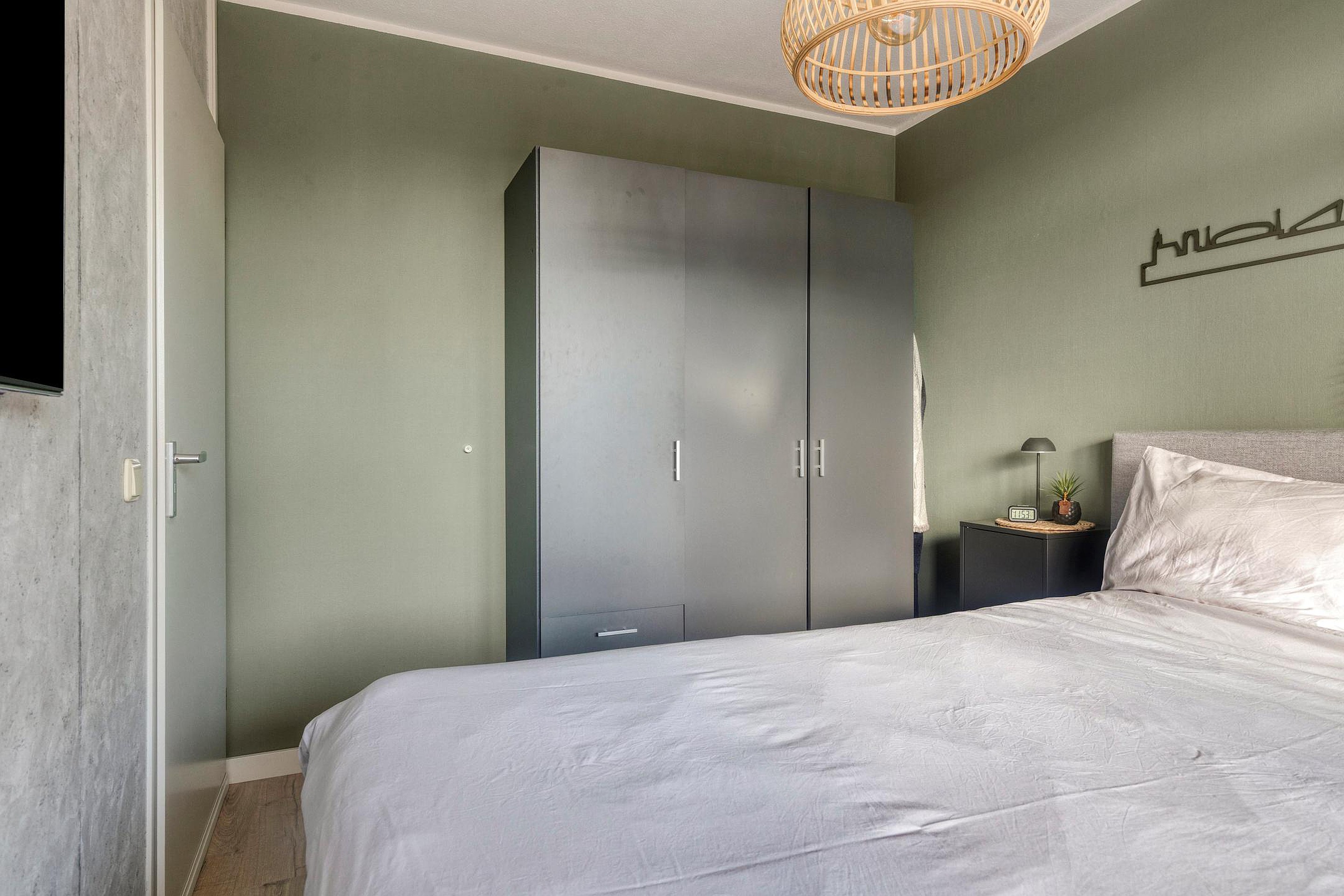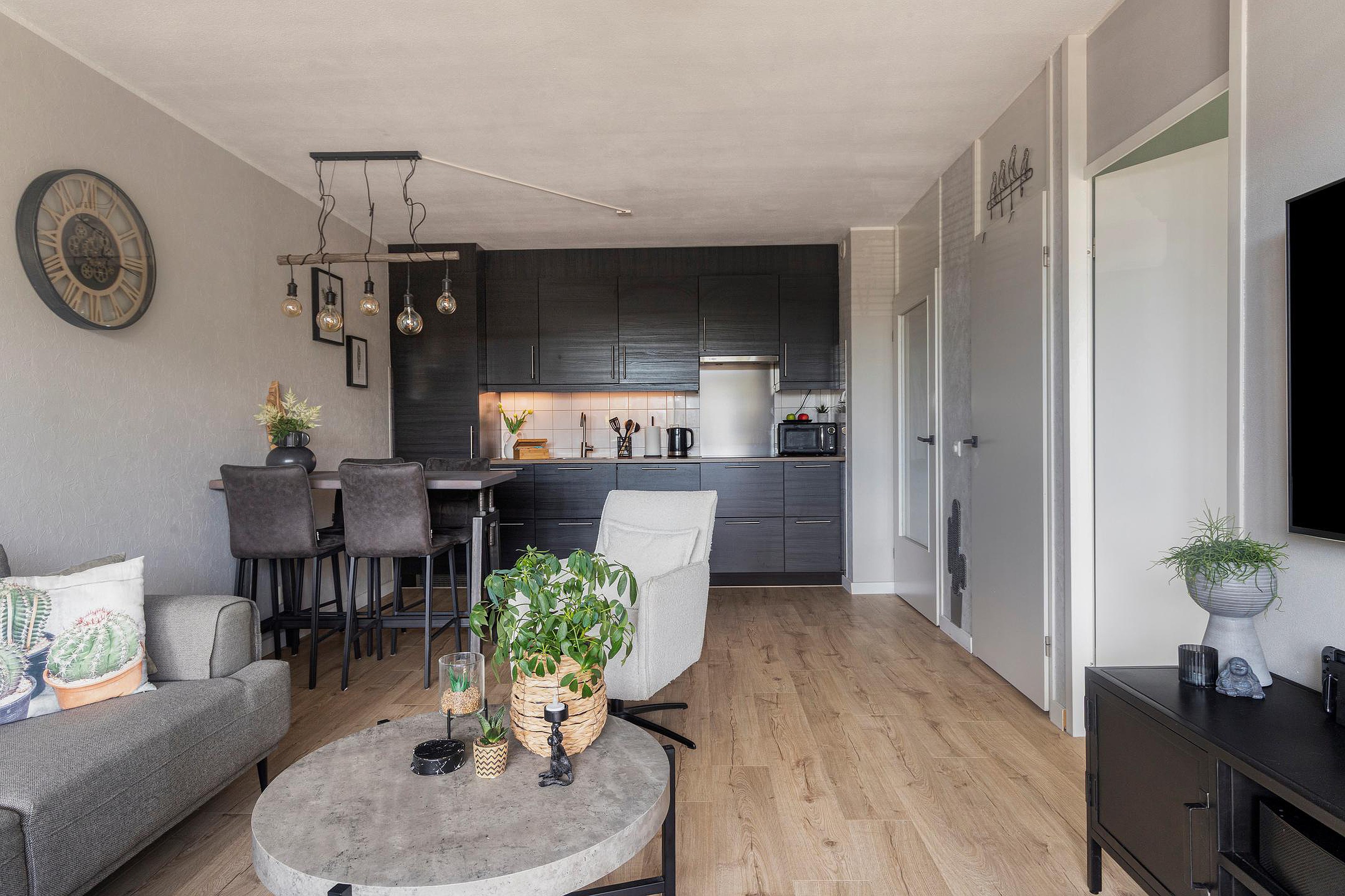 De open keuken is modern uitgevoerd en voorzien van onder andere een inductiekookplaat, afzuigkap en vaatwasser. De slaapkamer betreed je via de woonkamer, heeft een prettig formaat en grenst aan de eigentijdse badkamer.