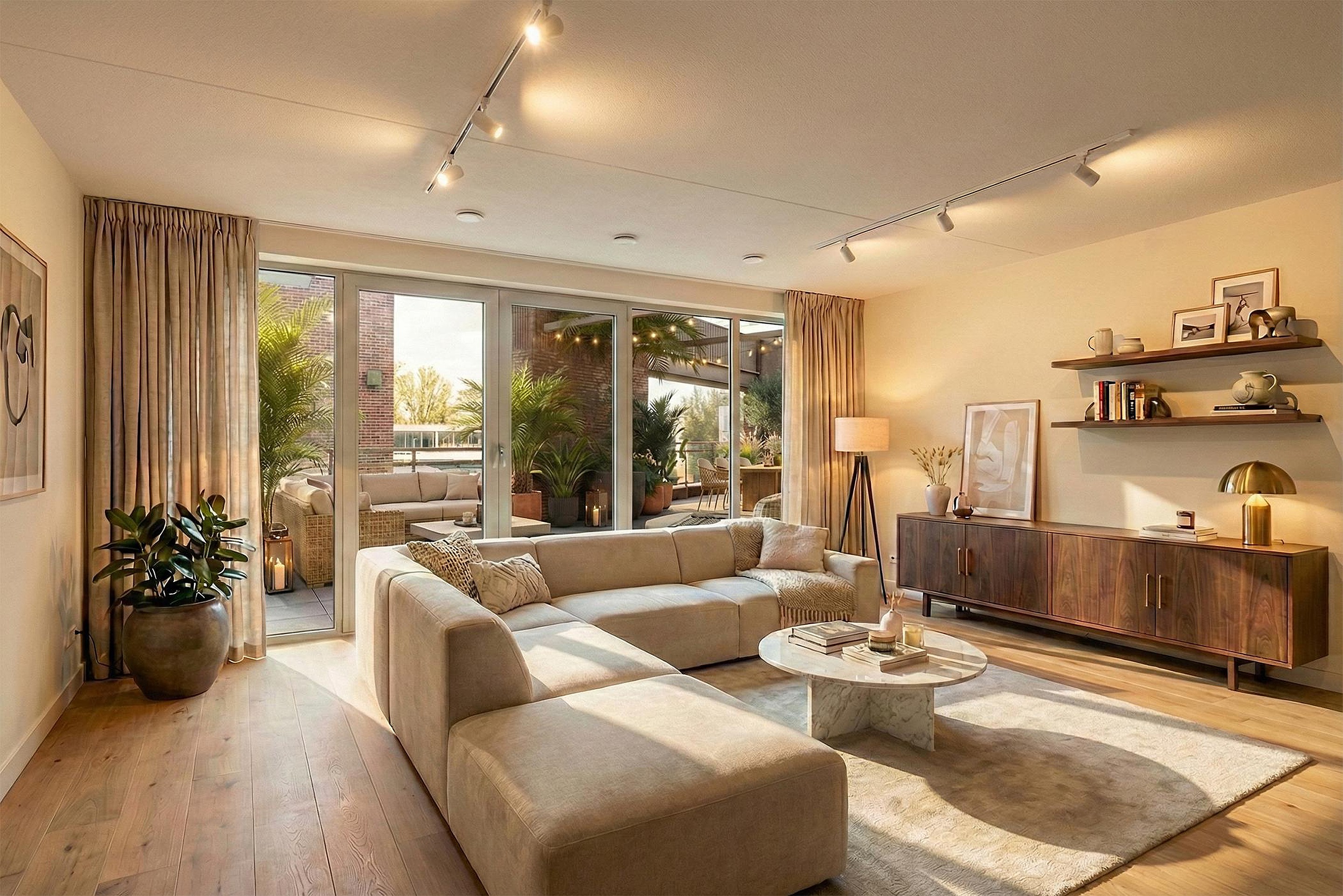 De lichte woonkamer valt meteen op door de grote raampartijen en de openslaande deuren naar het royale terras. Hierdoor geniet je van veel natuurlijke lichtinval en een mooie verbinding tussen binnen en buiten.