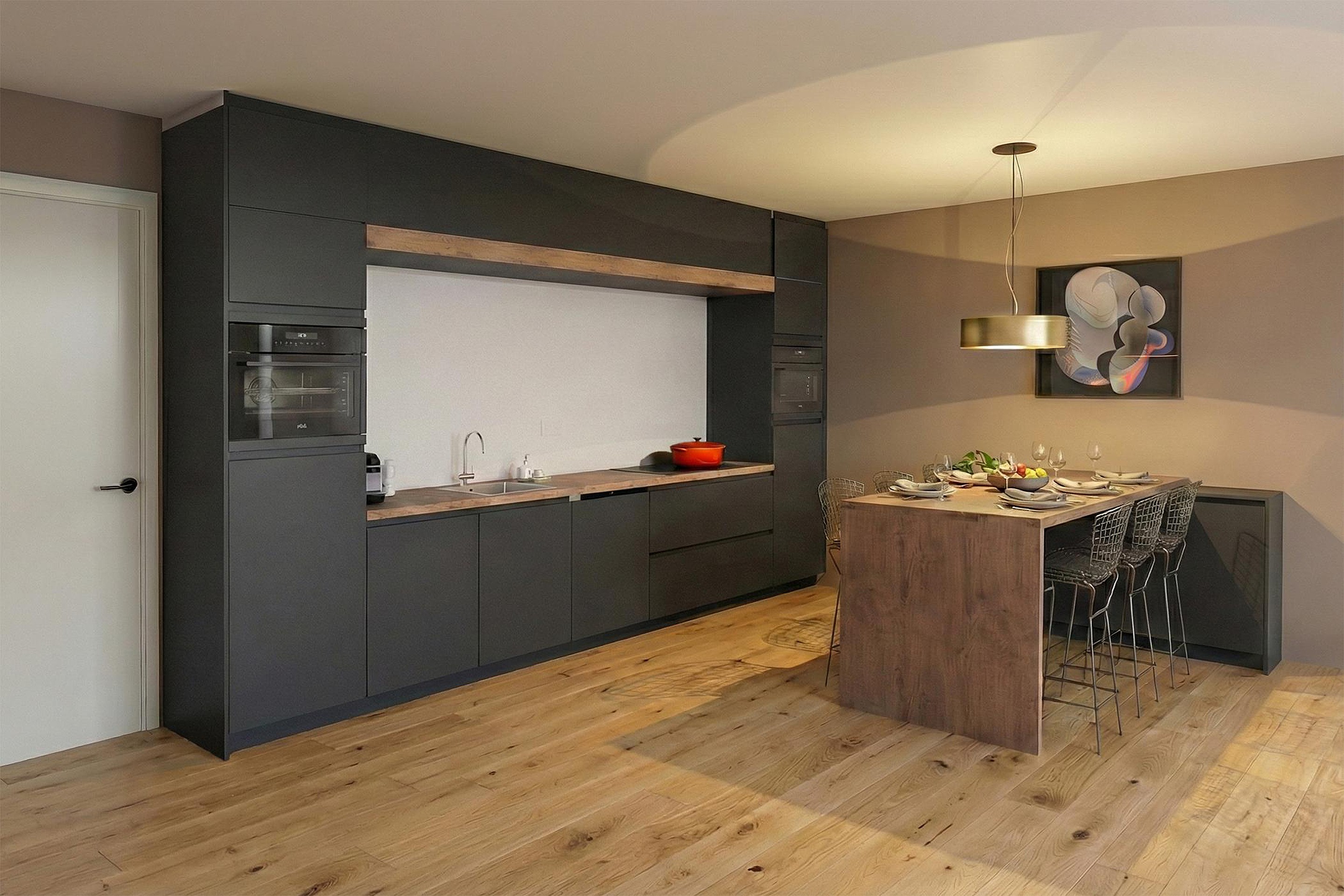 Het appartement wordt opgeleverd met een geheel nieuwe stijlvolle, trendy open keuken uitgevoerd in elegant matzwart.
